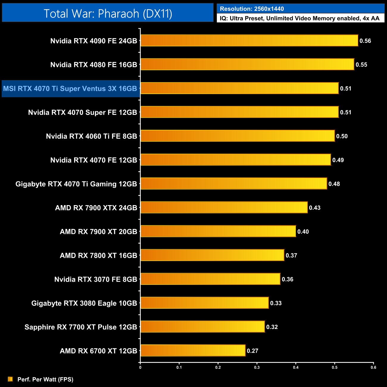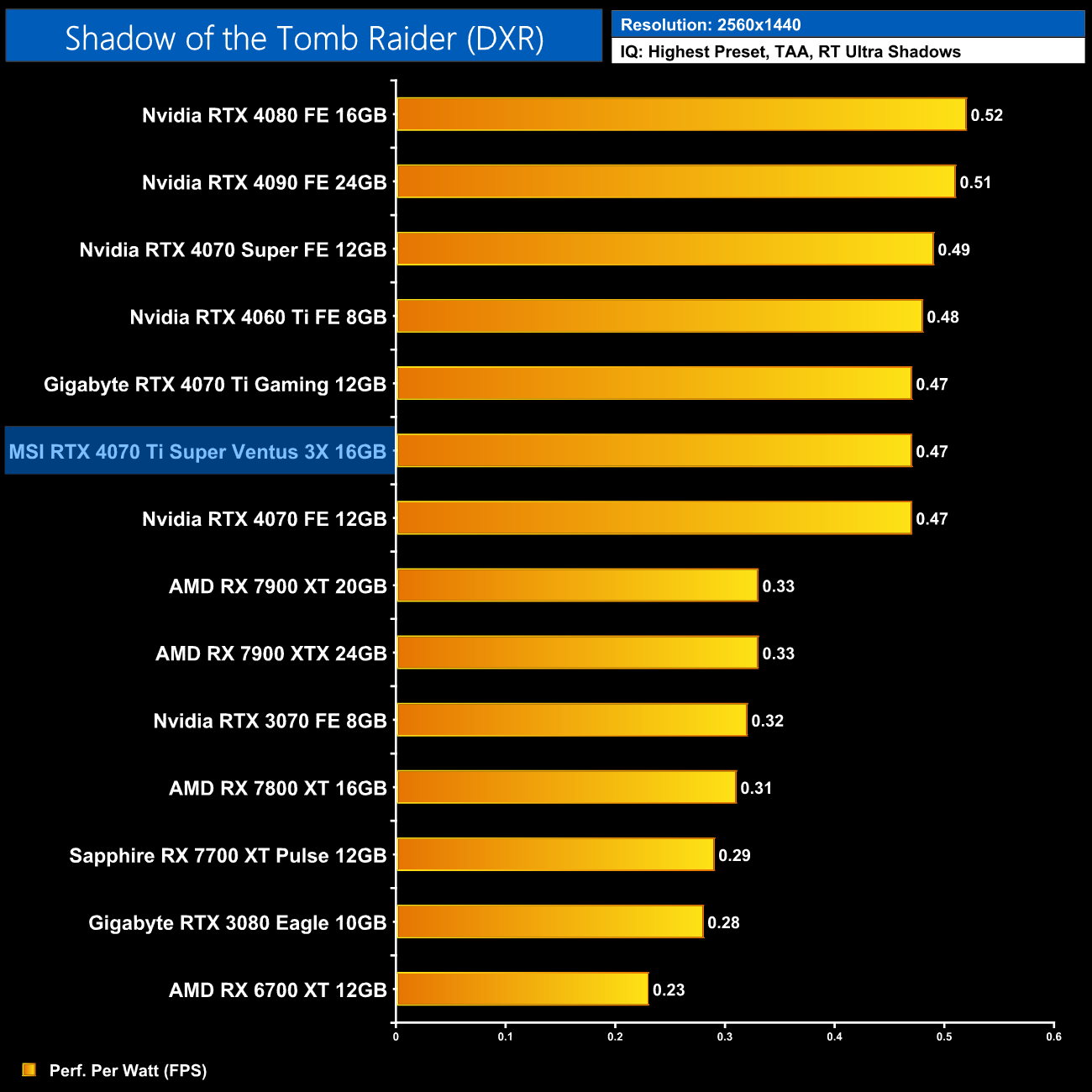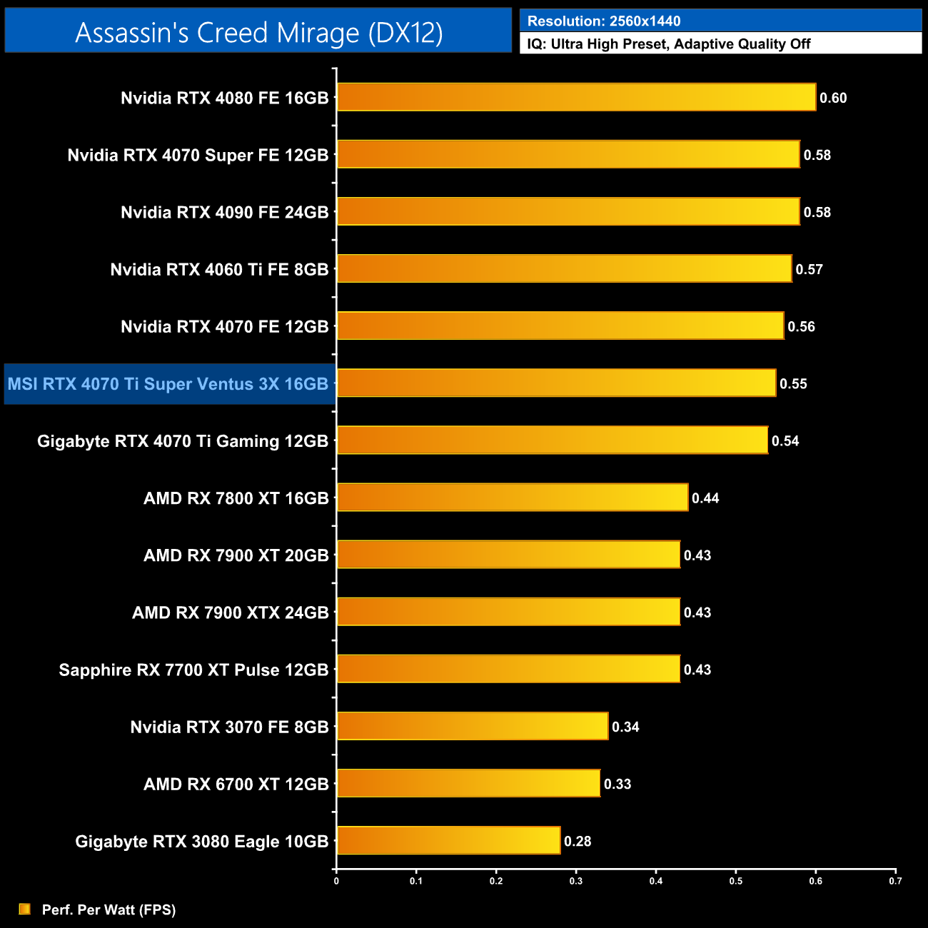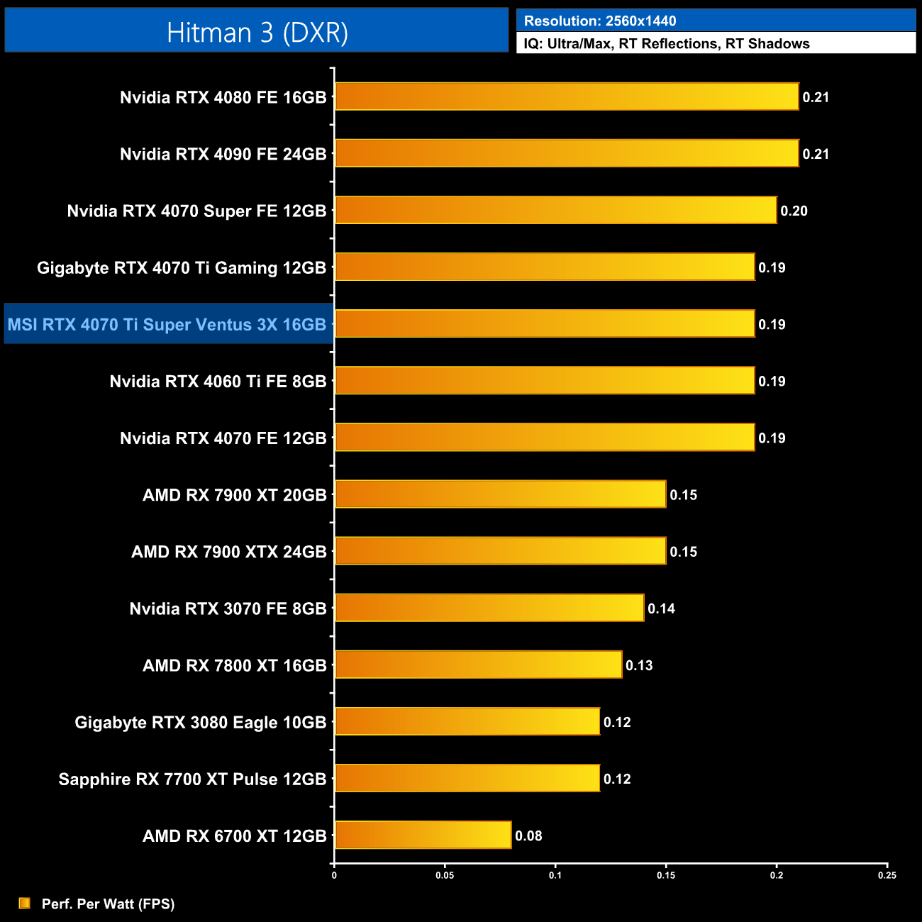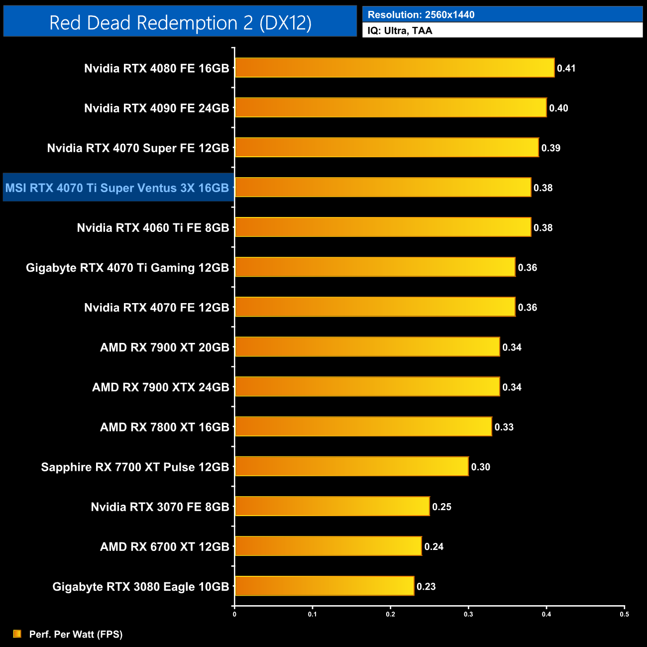 As for 1440p, here we can see the 4070 Ti Super is still delivering very similar efficiency to the other RTX 40-series GPUs. It does offer 5% better performance per Watt than the 4070 Ti, but the real win is against AMD, where the Ti Super is 16% more efficient than the RX 7900 XT.