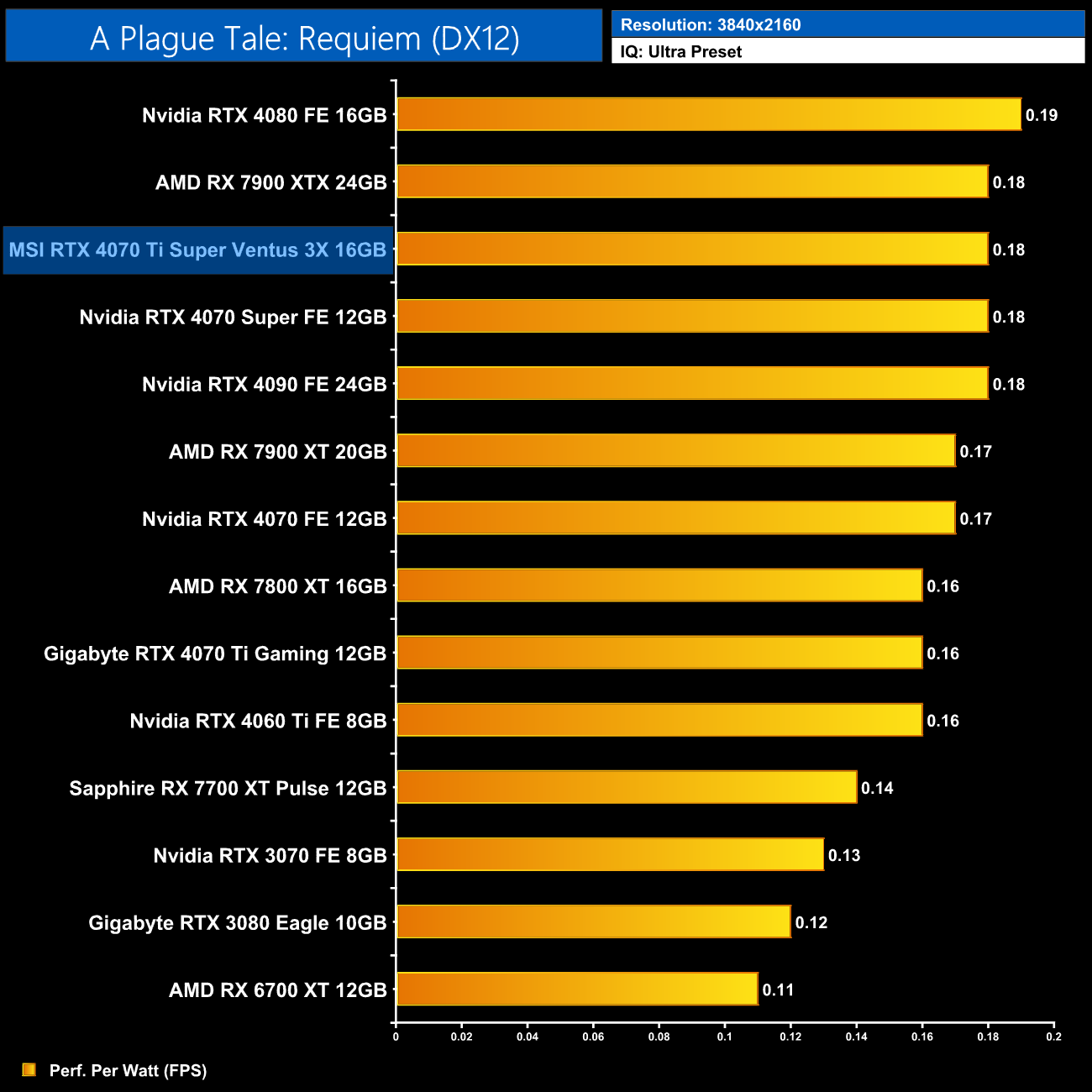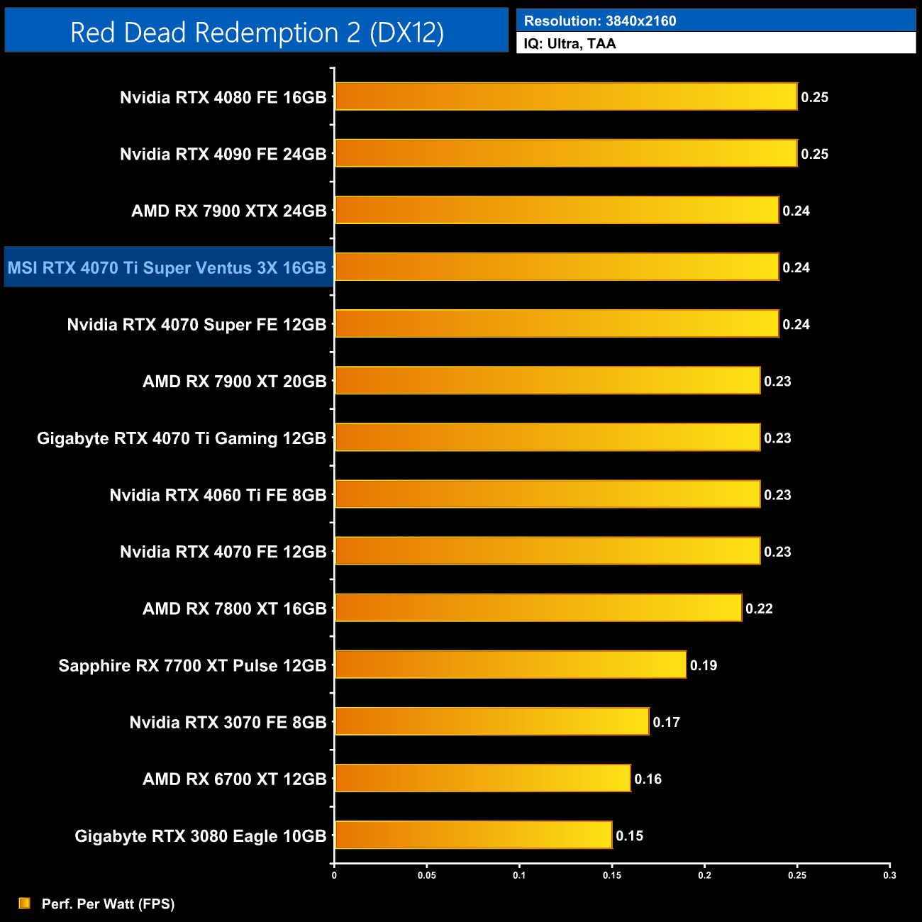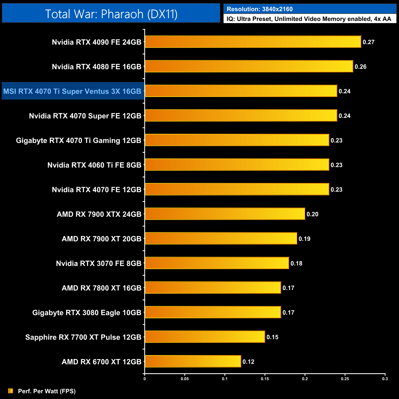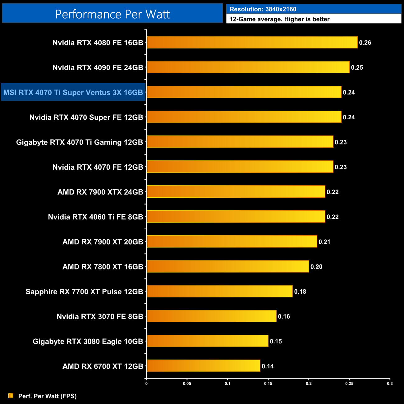Using the graphics card-only power draw figures presented earlier in the review, here we present performance per Watt on a per-game basis for all twelve games we tested at 2160p (4K).