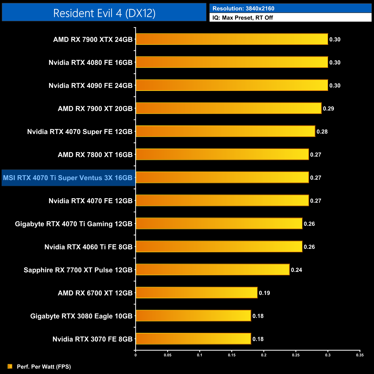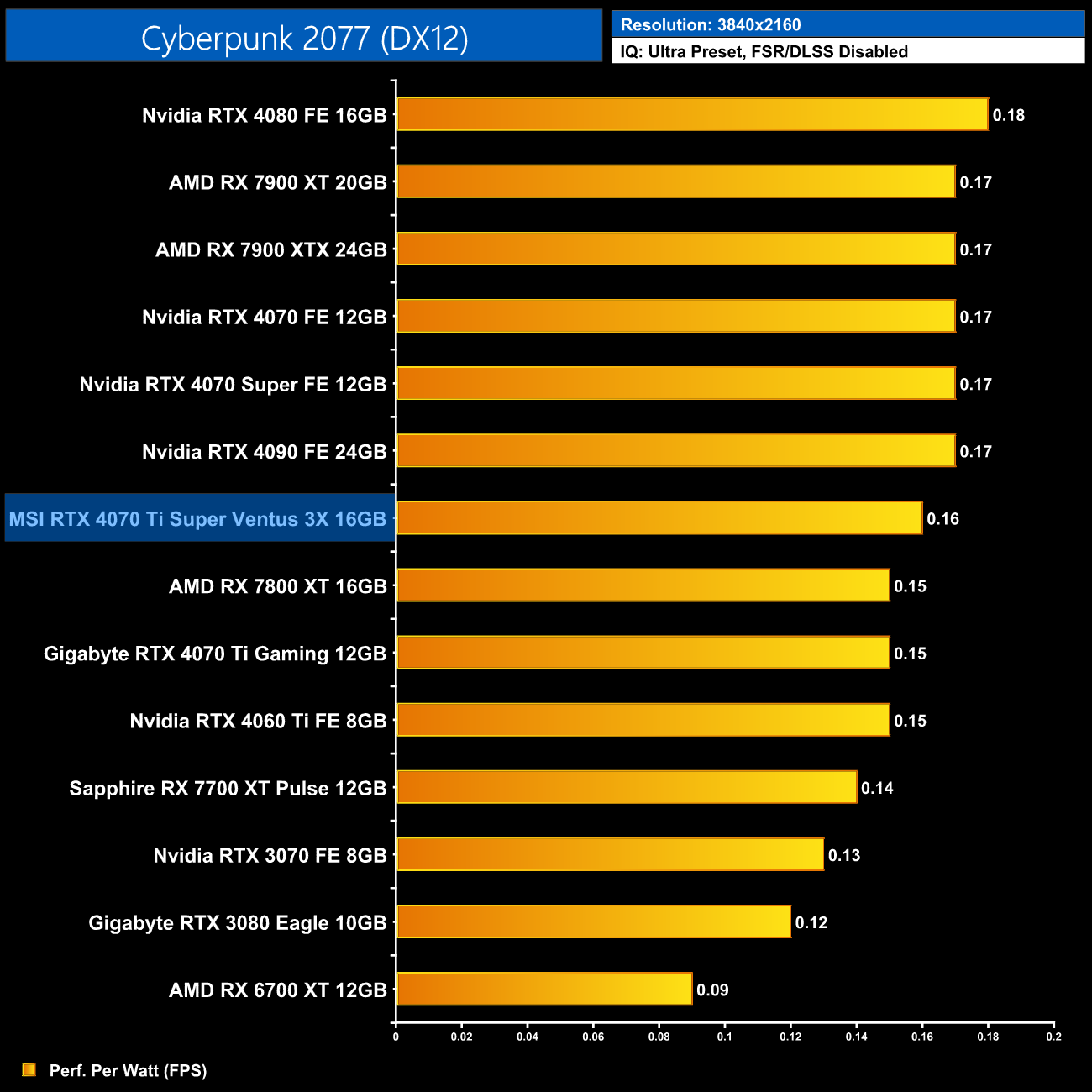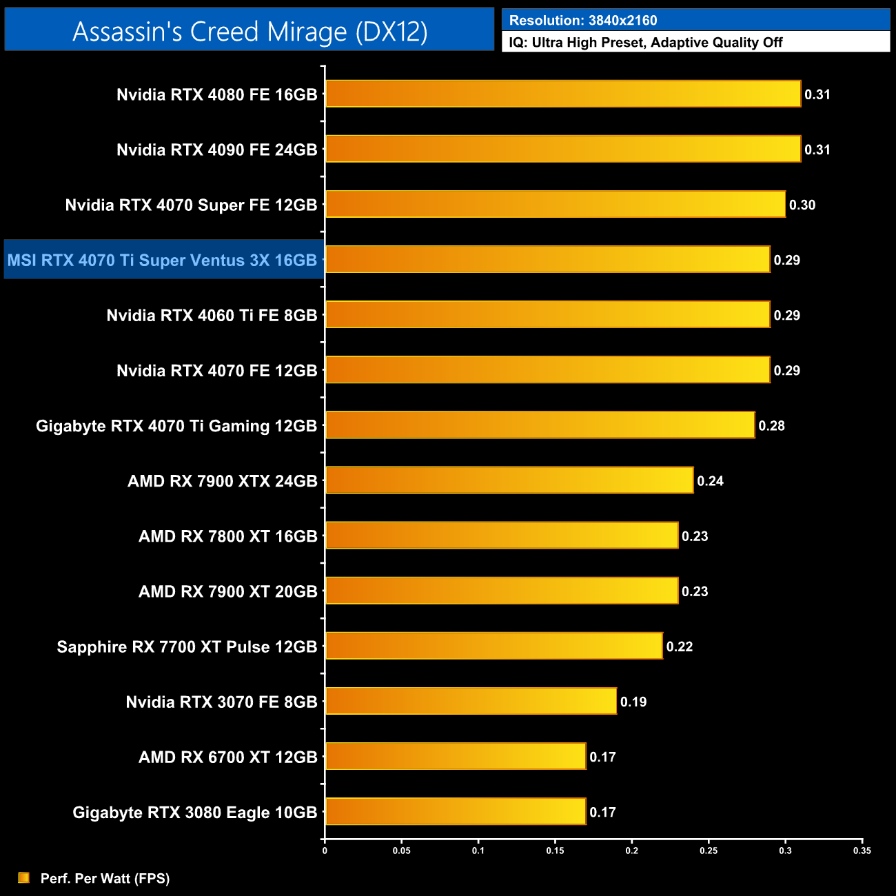 Using the graphics card-only power draw figures presented earlier in the review, here we present performance per Watt on a per-game basis for all twelve games we tested at 2160p (4K).