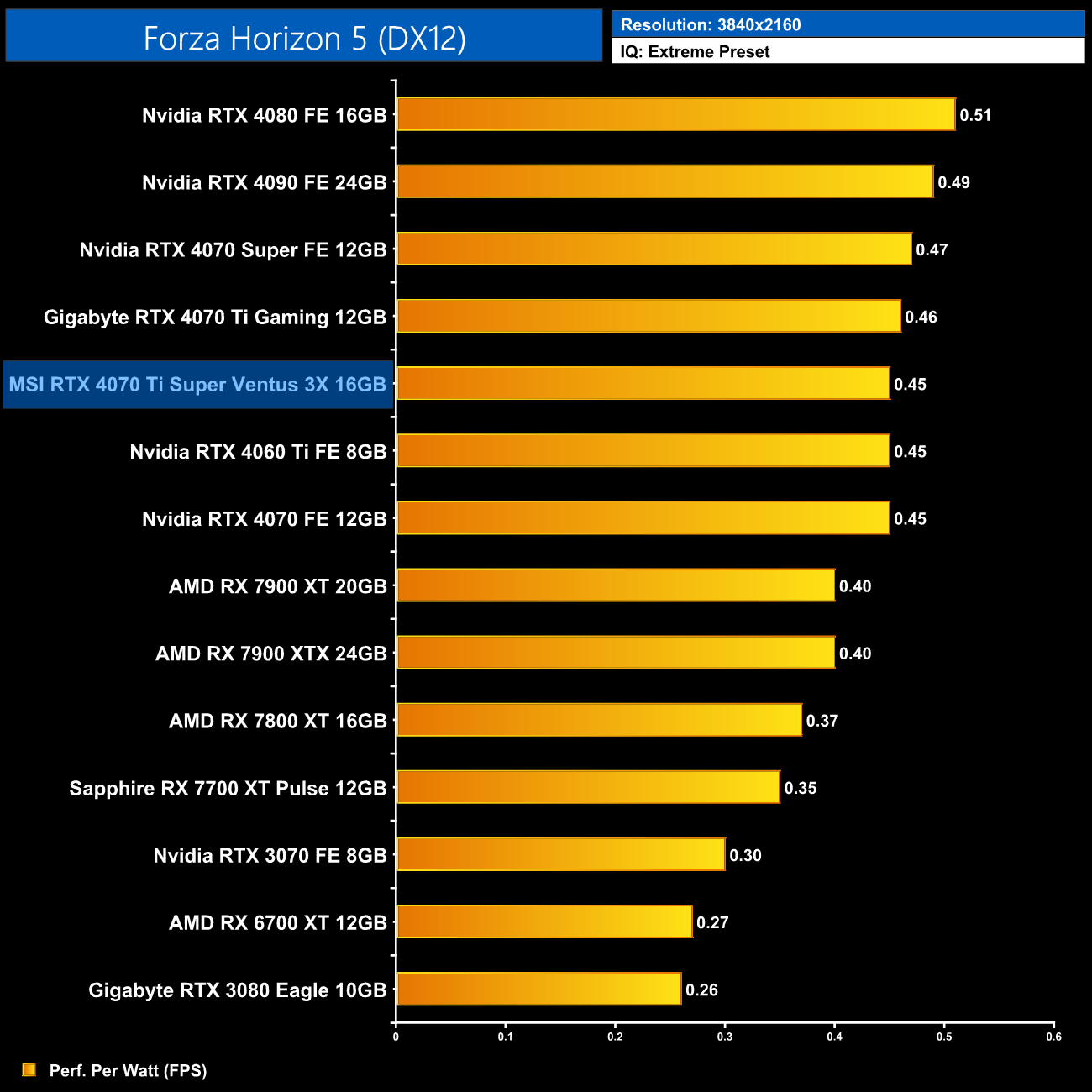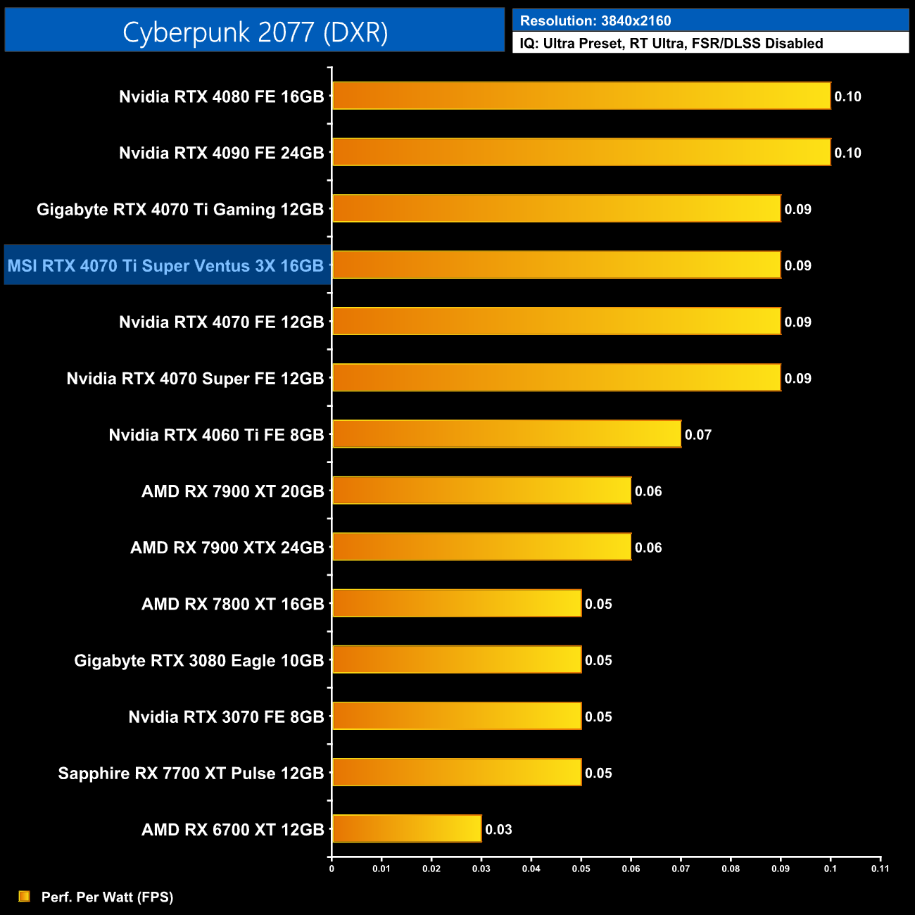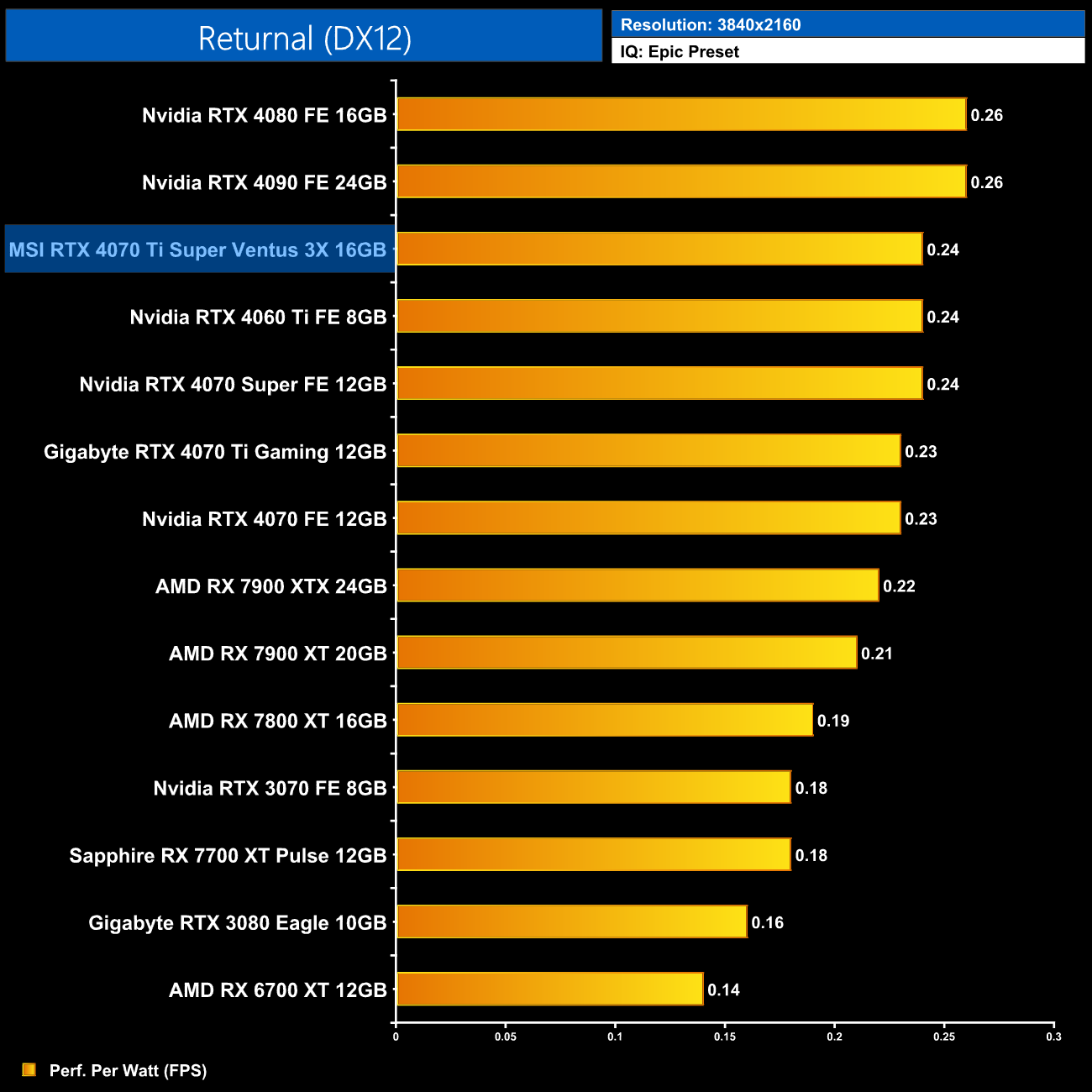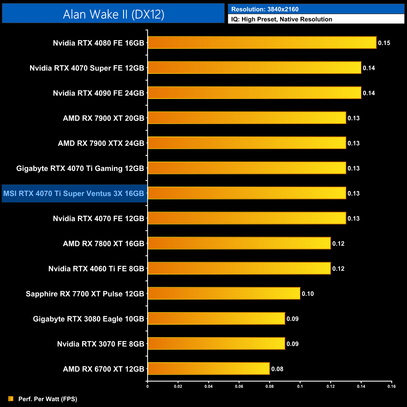 Using the graphics card-only power draw figures presented earlier in the review, here we present performance per Watt on a per-game basis for all twelve games we tested at 2160p (4K).