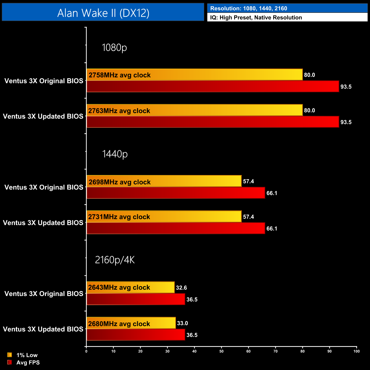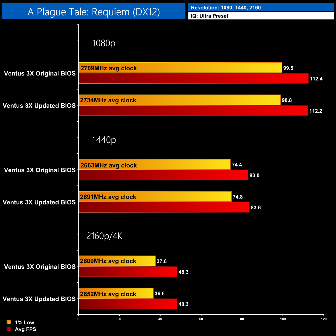 However, after testing three games at 1080p, 1440p and 4K resolutions, I didn't observe any real performance gains using the updated BIOS. The frame rates in Alan Wake 2 were basically unchanged, I did see a small 2% increase in Cyberpunk 2077 at 1440p, but that is very close to margin of error, and the performance at 1080p and 4K was essentially unchanged. The same also goes for A Plague Tale: Requiem.
