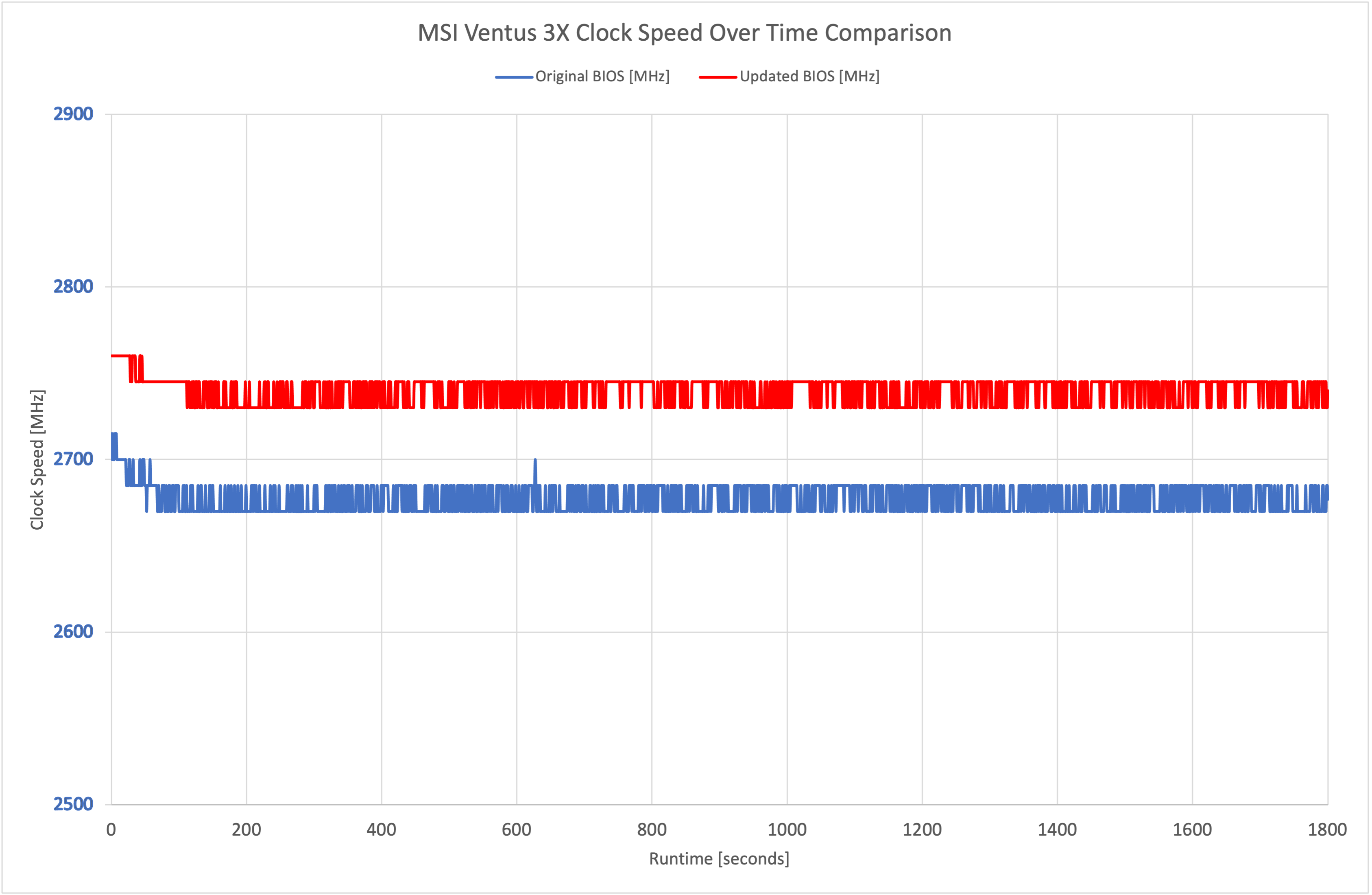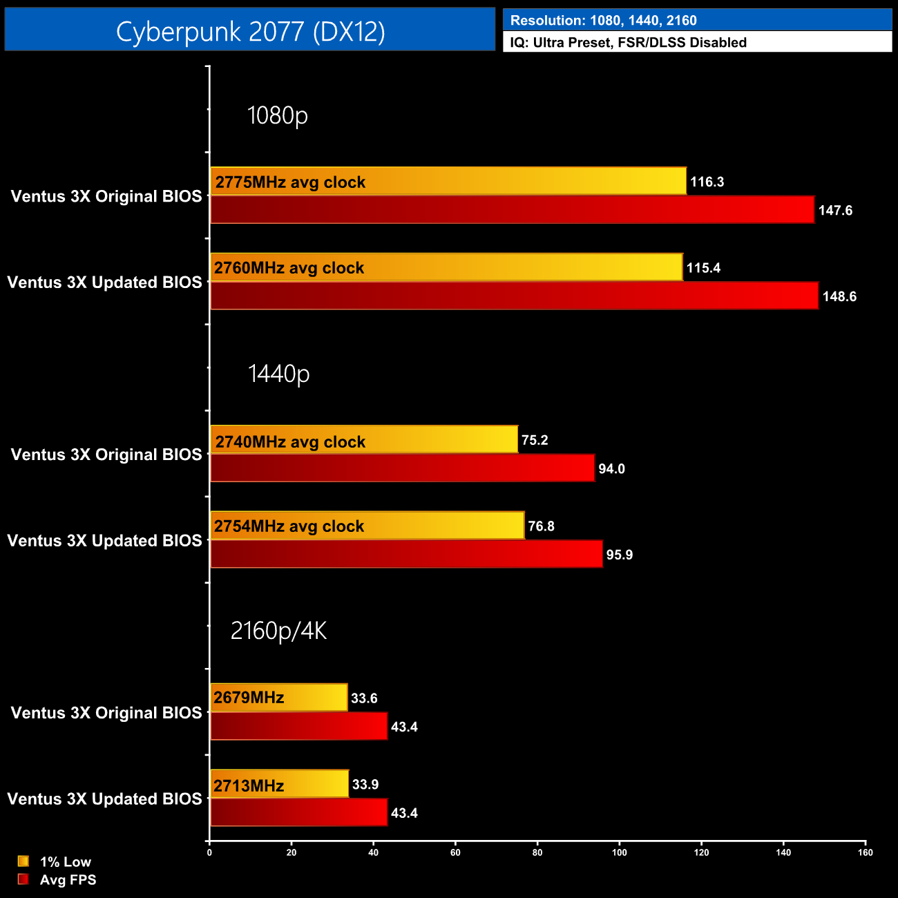 I then ran a 30-minute stress test in Cyberpunk 2077, using GPU-Z to log clock speed. The updated BIOS did offer slightly higher sustained clock speeds, by around 60MHz or so.