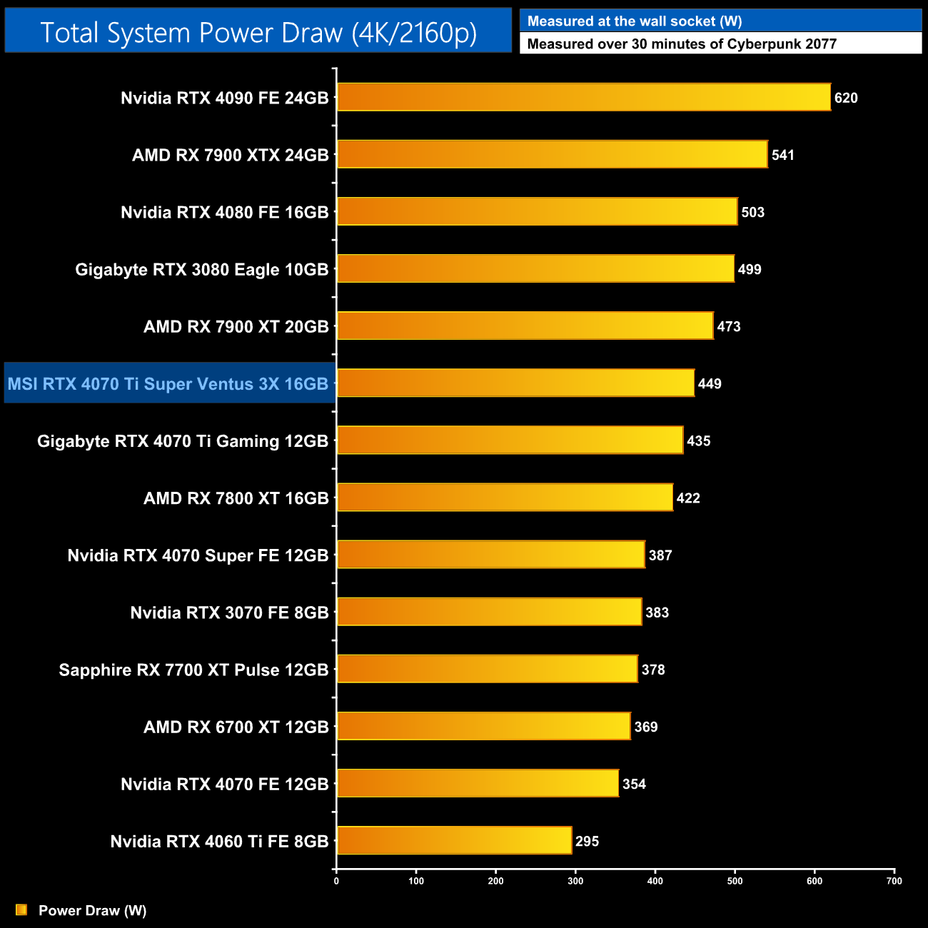 We measure system-wide power draw from the wall while running Cyberpunk 2077 for 30 minutes (4K resolution).
