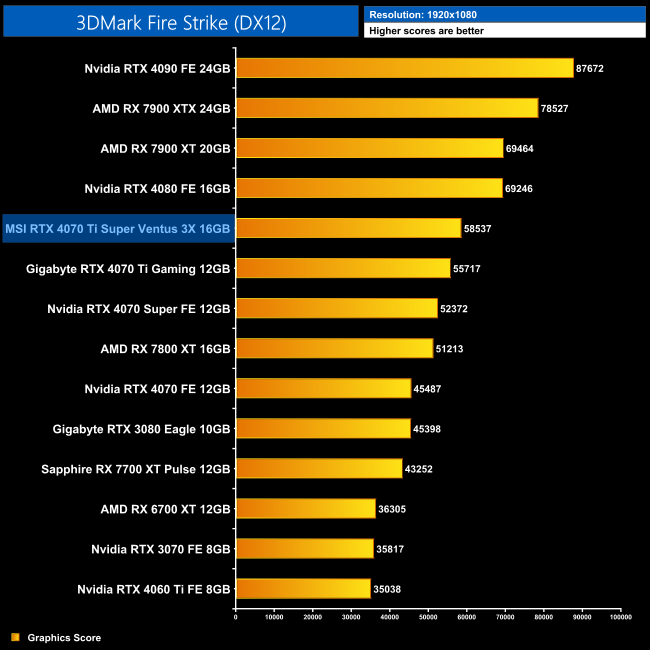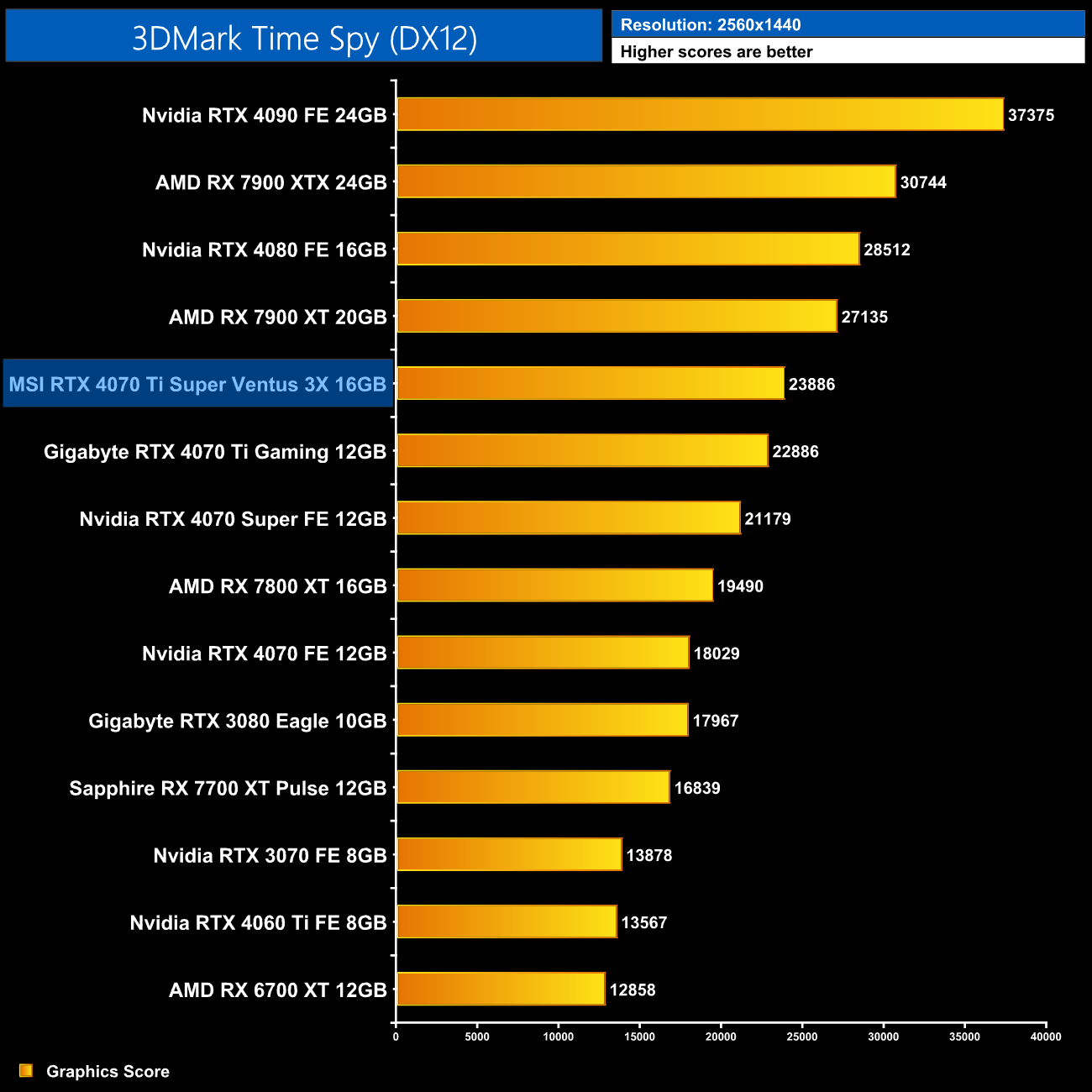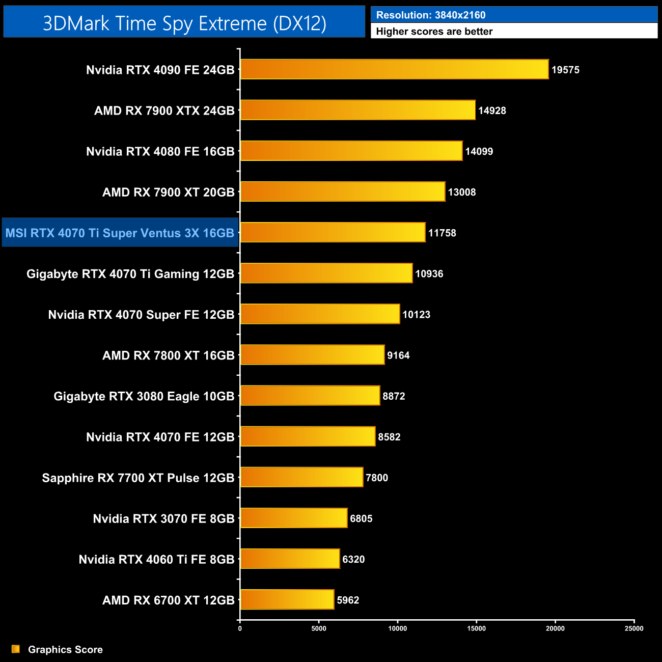 3DMark scores show a small uplift over the original 4070 Ti, with the new Super model just 4% faster in Time Spy, but this increases to 8% in Time Spy Extreme.