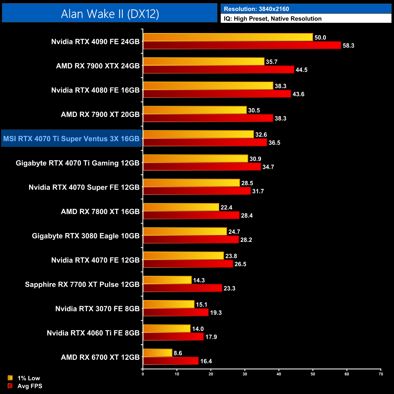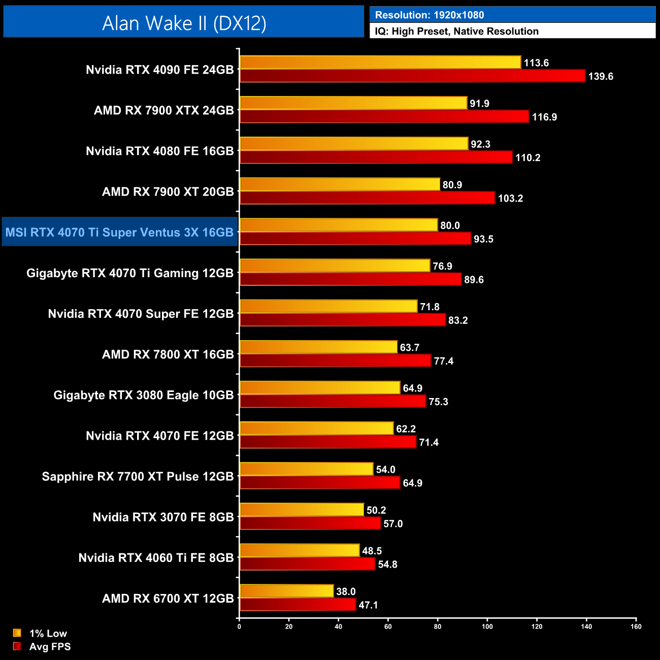 Our first game of the day is Alan Wake II, where the RTX 4070 Ti Super managed 66FPS at 1440p, making it 5% faster than the RTX 4070 Ti but 7% slower than AMD's RX 7900 XT.
