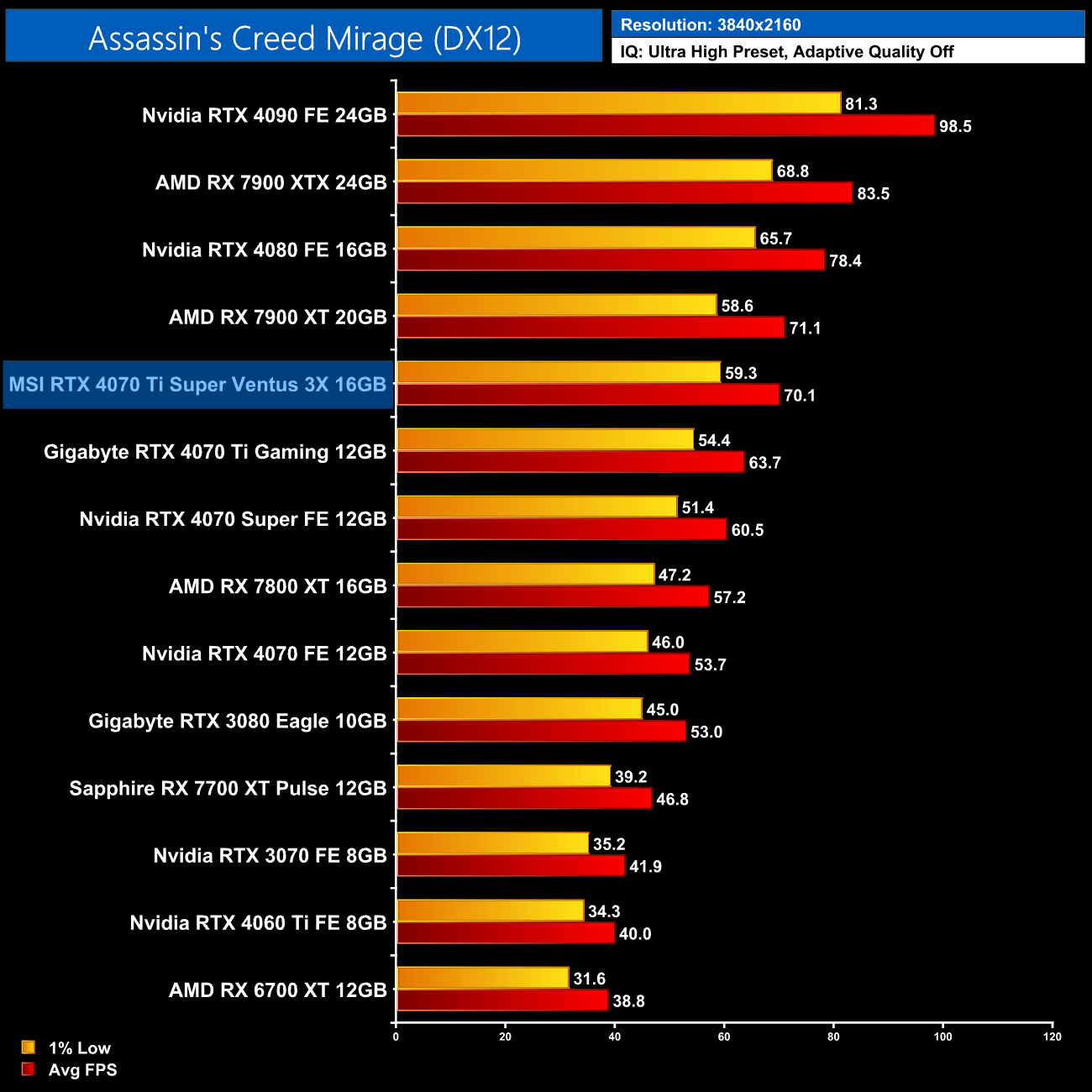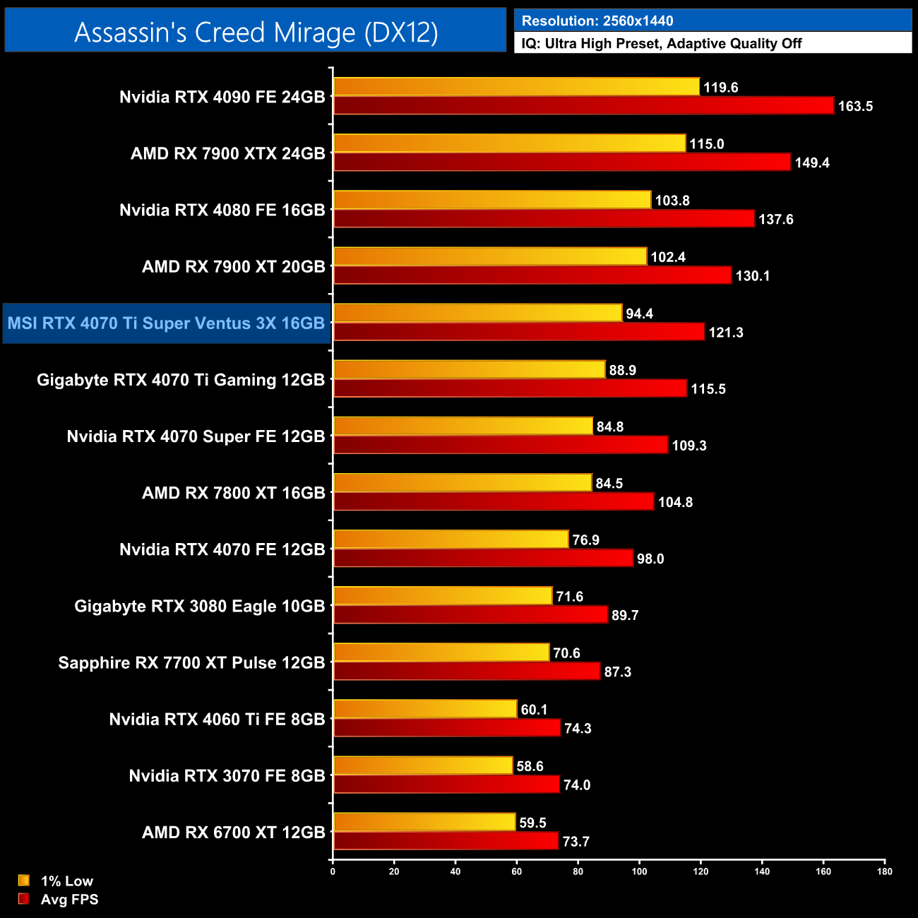 As for Assassin's Creed Mirage, at 1440p the 4070 Ti Super delivers 121FPS on average, again making it 5% faster than the original 4070 Ti, while it's 7% and 12% slower than the 7900 XT and RTX 4080, respectively.
