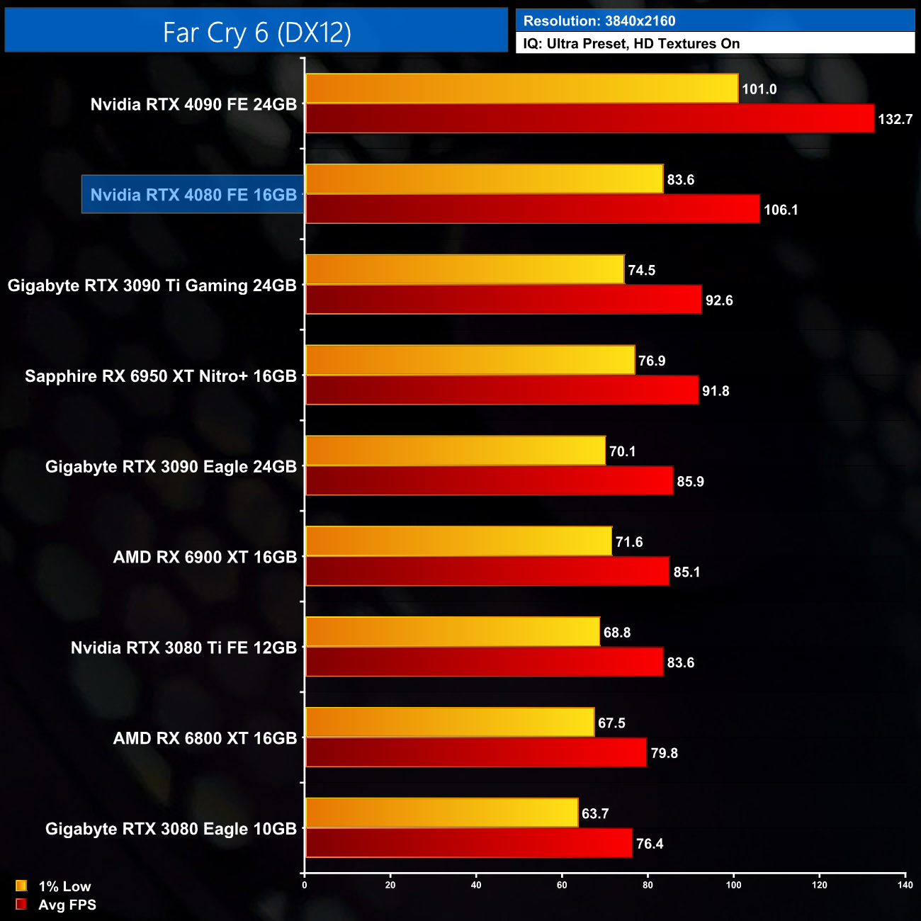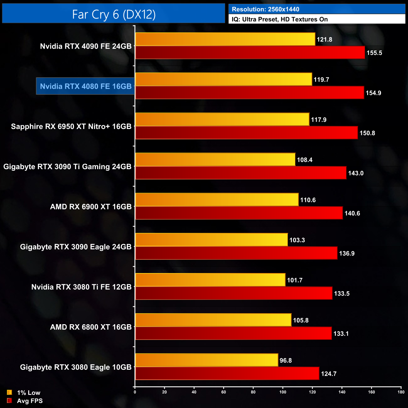 Far Cry 6 shows clear CPU bottlenecking at 1440p, even when testing in the open world rather than using the built-in benchmark, so we will focus on 4K data. Here the RTX 4080 impresses, delivering over 100FPS, while it's 15% faster than the RTX 3090 Ti and 16% ahead of the 6950 XT.