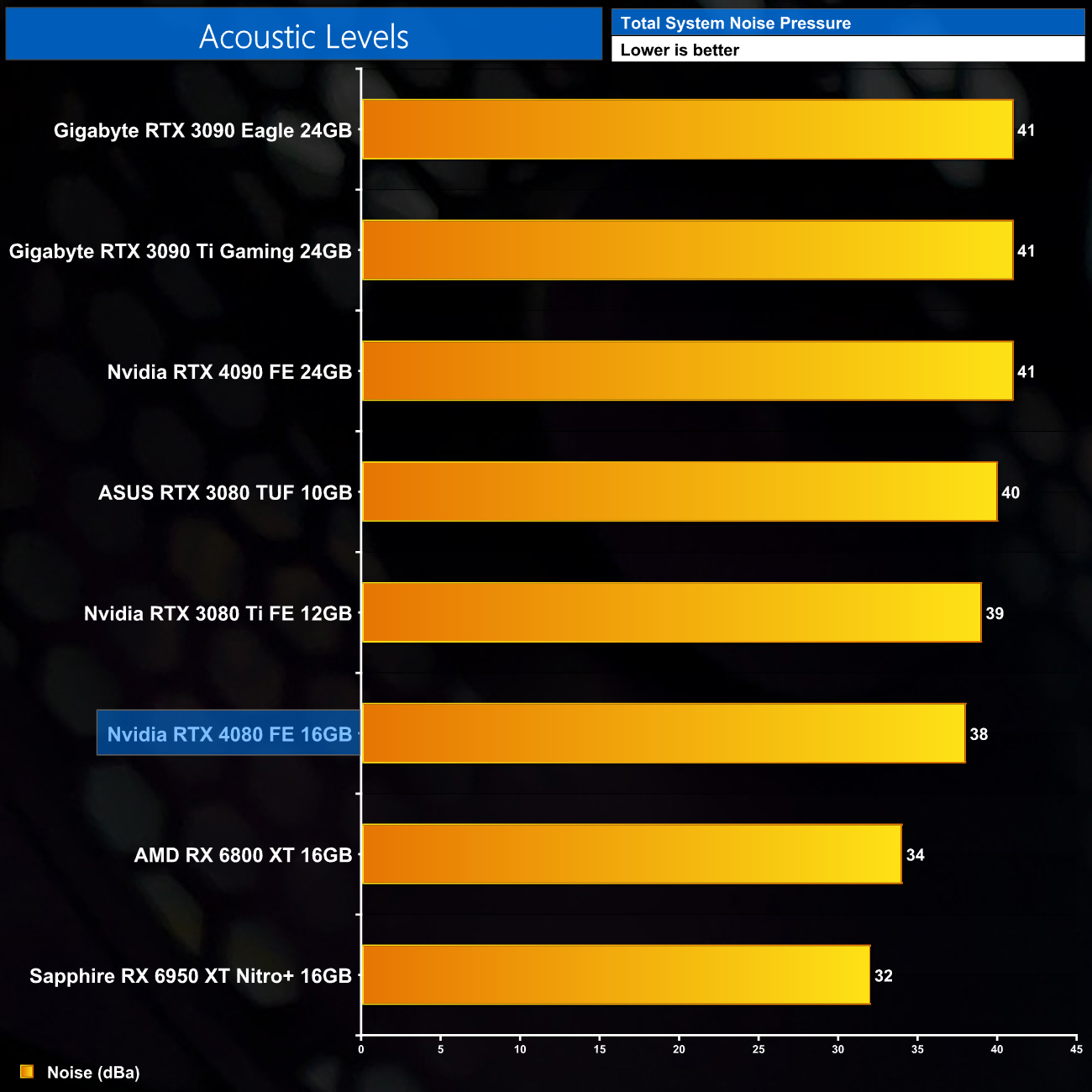 Likewise, noise levels are improved versus the RTX 4090, due to the simple fact the fans don't have to work so hard as power draw is so much lower. We observed Fan 1 operating at 1350rpm, and Fan 2 at 1275rpm, so both results are about 100-130rpm slower than what we saw from the 4090. Accordingly, noise dropped to 38dBa on our sound meter.