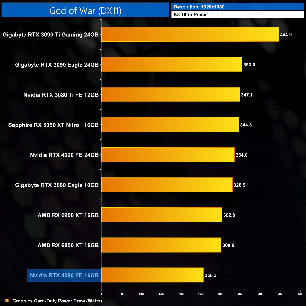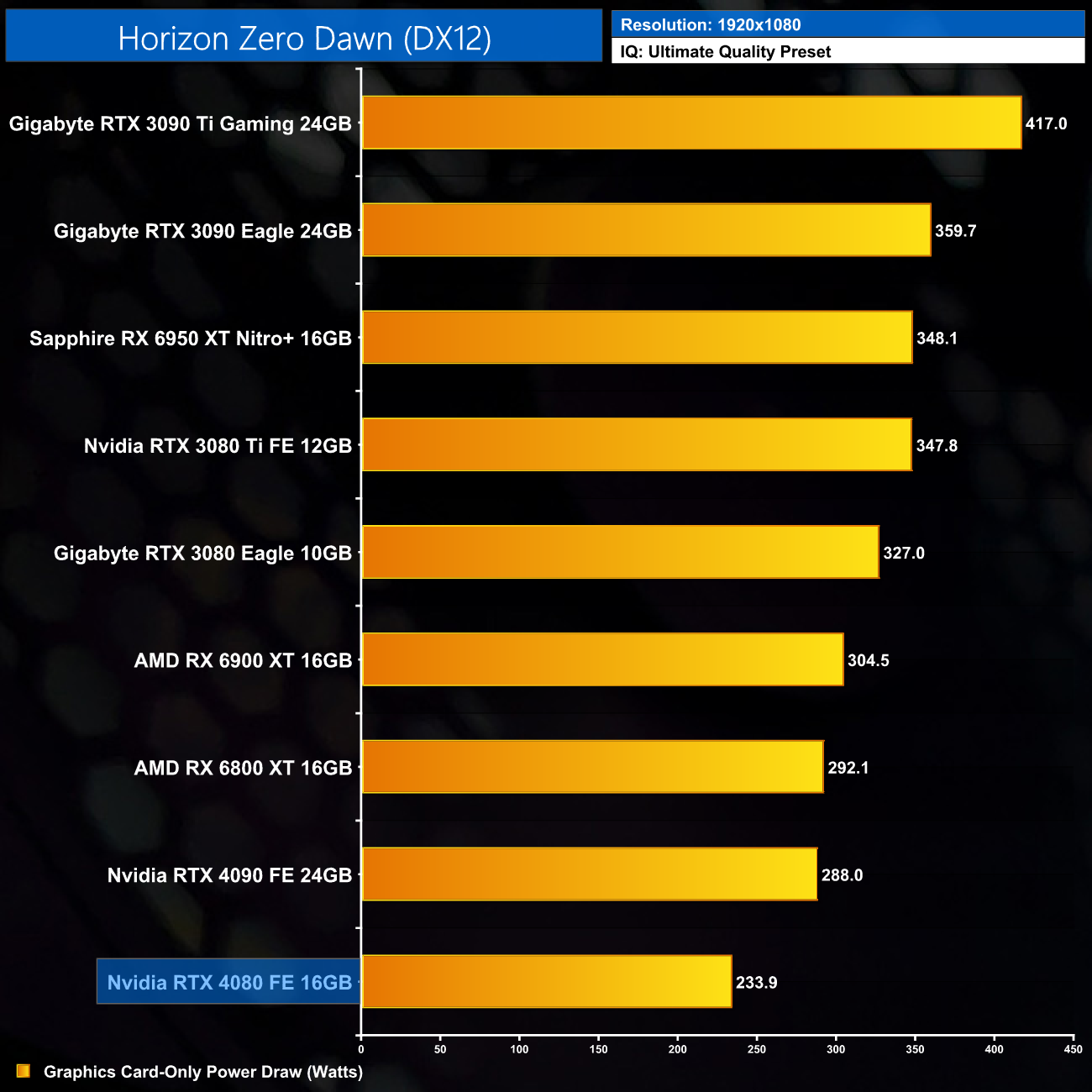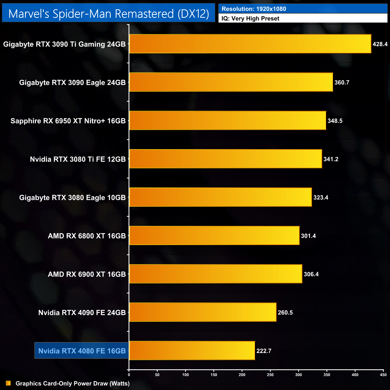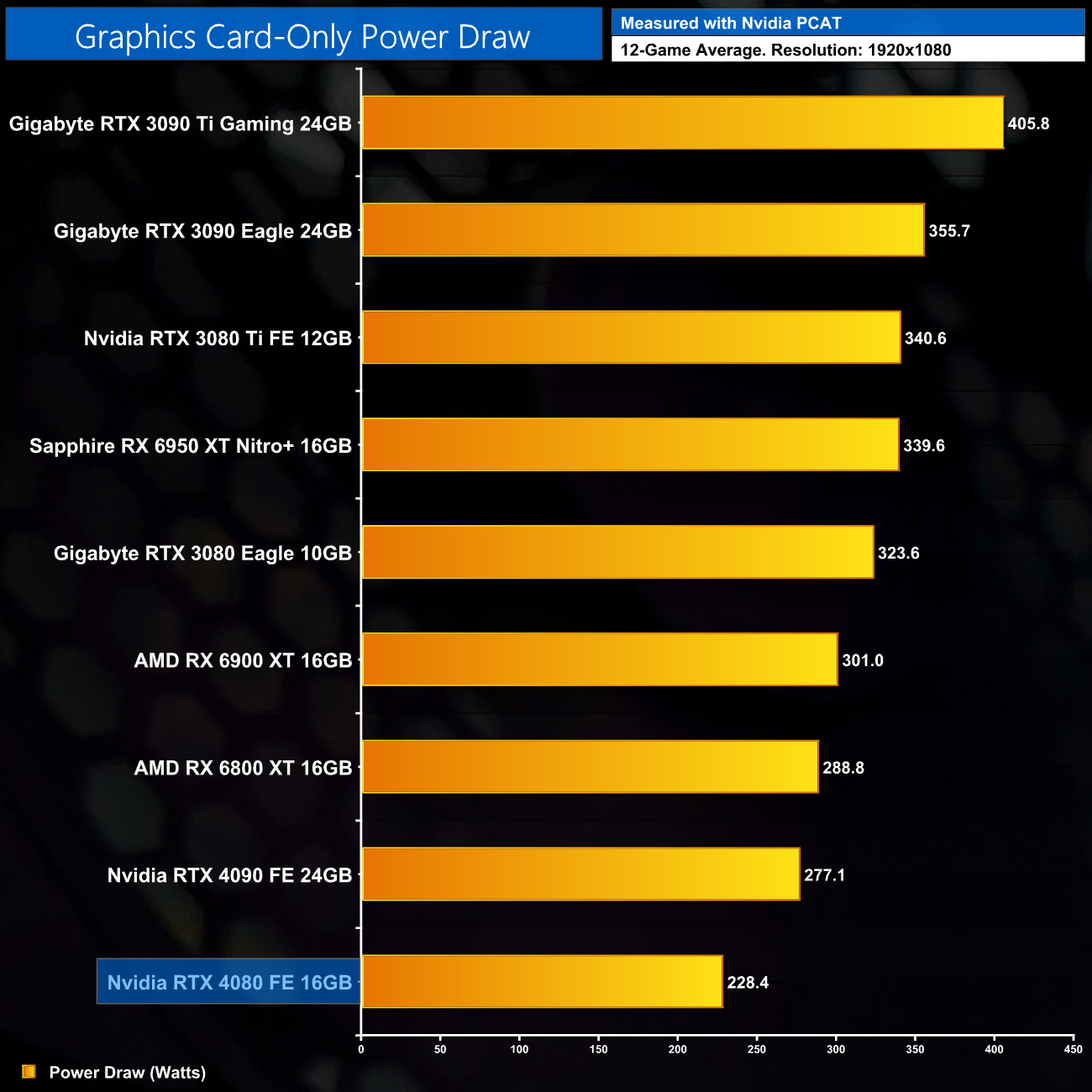 The RTX 4080 is a remarkably frugal GPU. Granted, at 1080p we don't get the most of it in terms of performance and it is often CPU limited, but power draw is still well below the rated TGP, averaging 228W over the twelve games we tested.