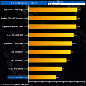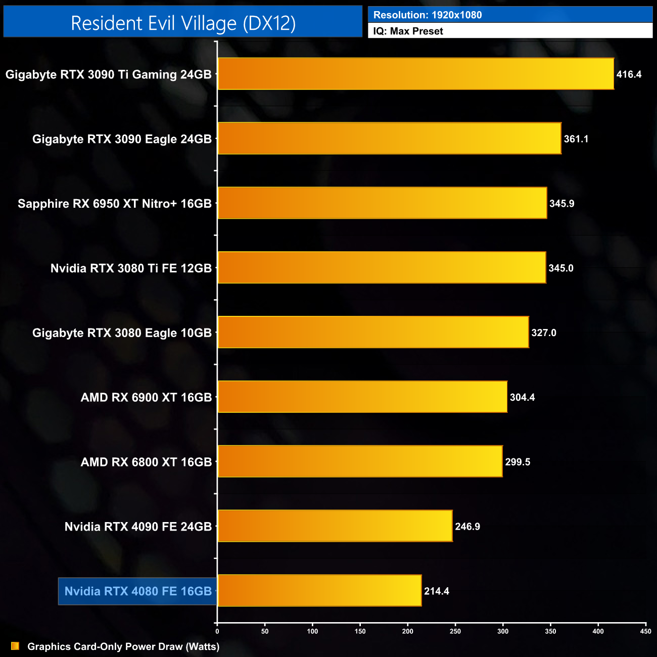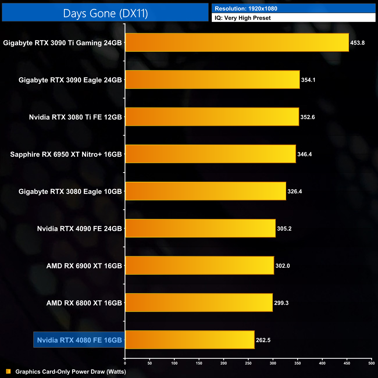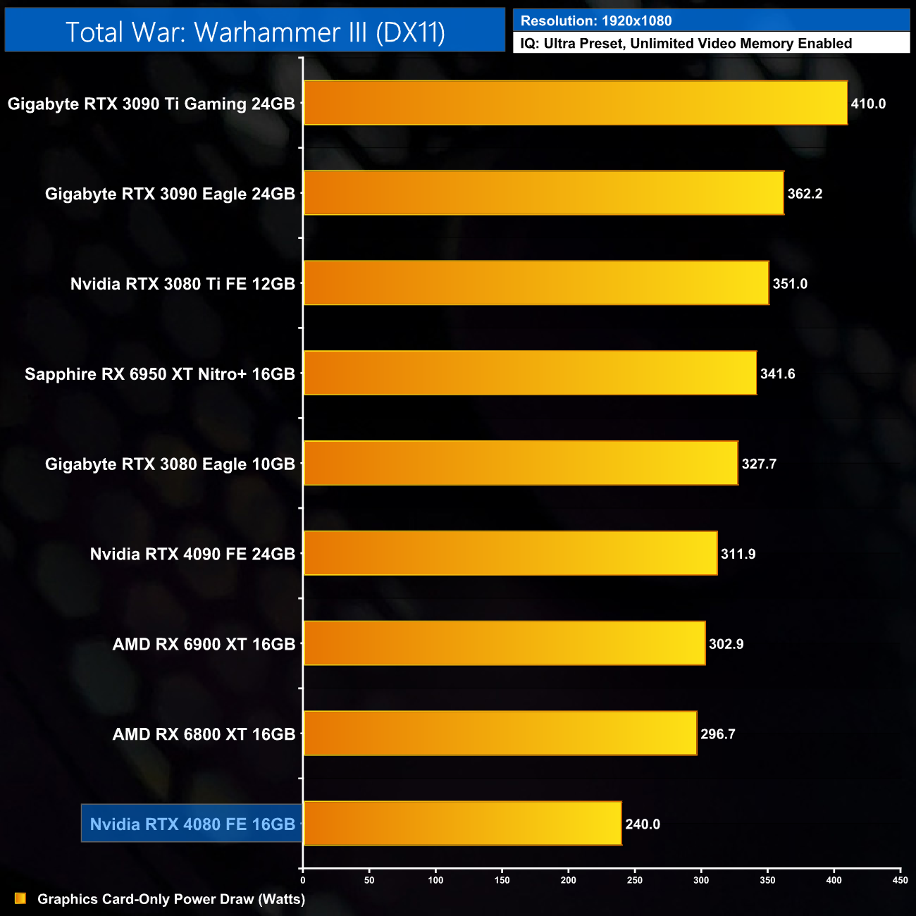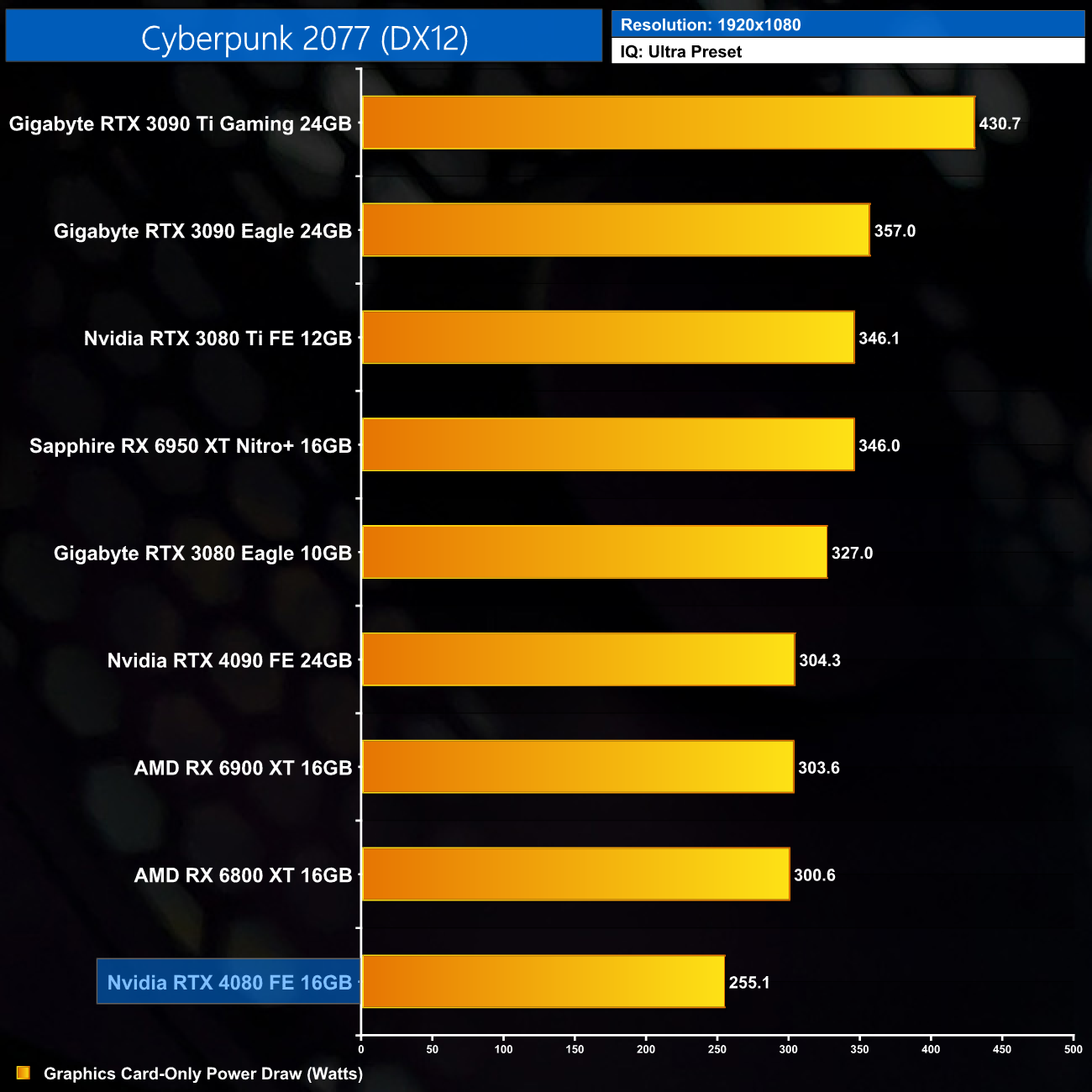 The RTX 4080 is a remarkably frugal GPU. Granted, at 1080p we don't get the most of it in terms of performance and it is often CPU limited, but power draw is still well below the rated TGP, averaging 228W over the twelve games we tested.