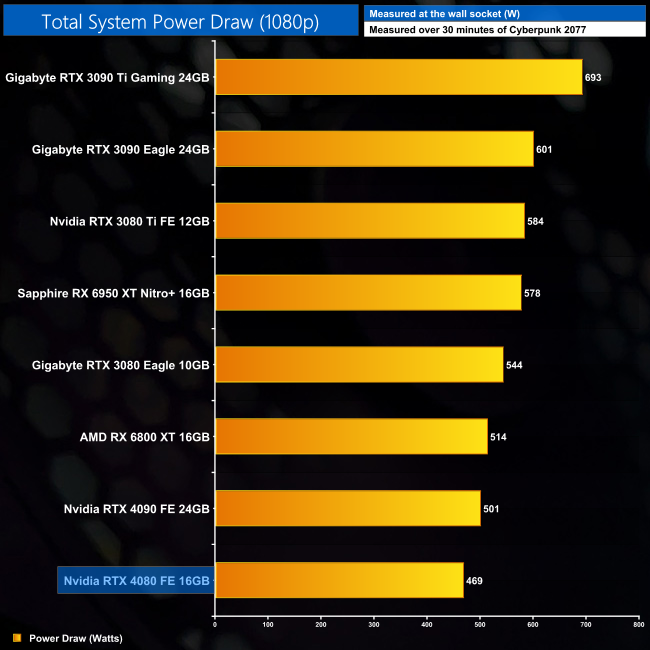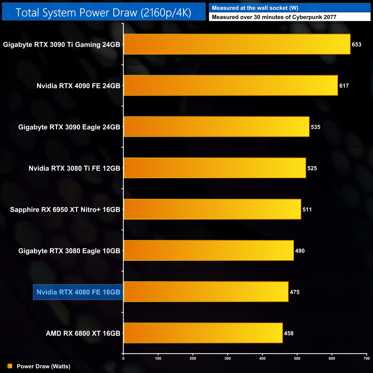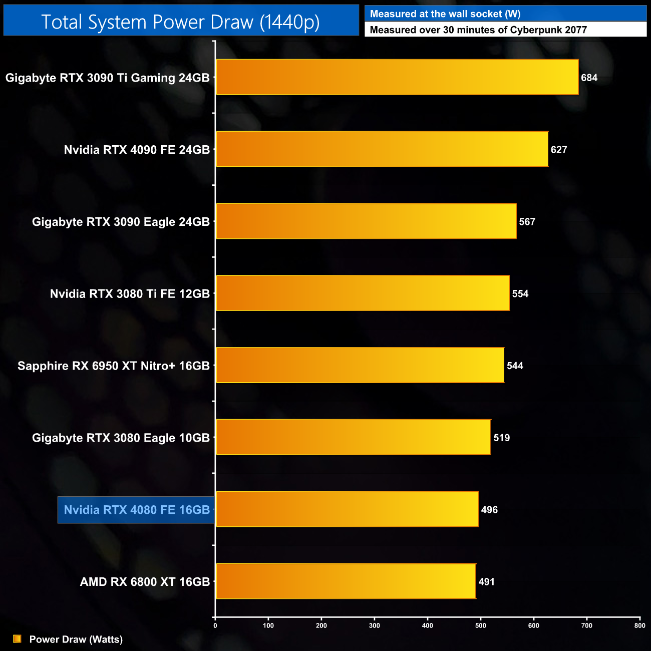 Total system power draw hit a peak of just under 500W in our testing, and that was at 1440p resolution. This will vary depending on the exact game due to CPU load (we use Cyberpunk 2077), but it is clear to see the 4080 does not draw as much power as the RTX 3080, despite sharing the same 320W rated TGP. Nvidia officially recommends a 750W PSU.