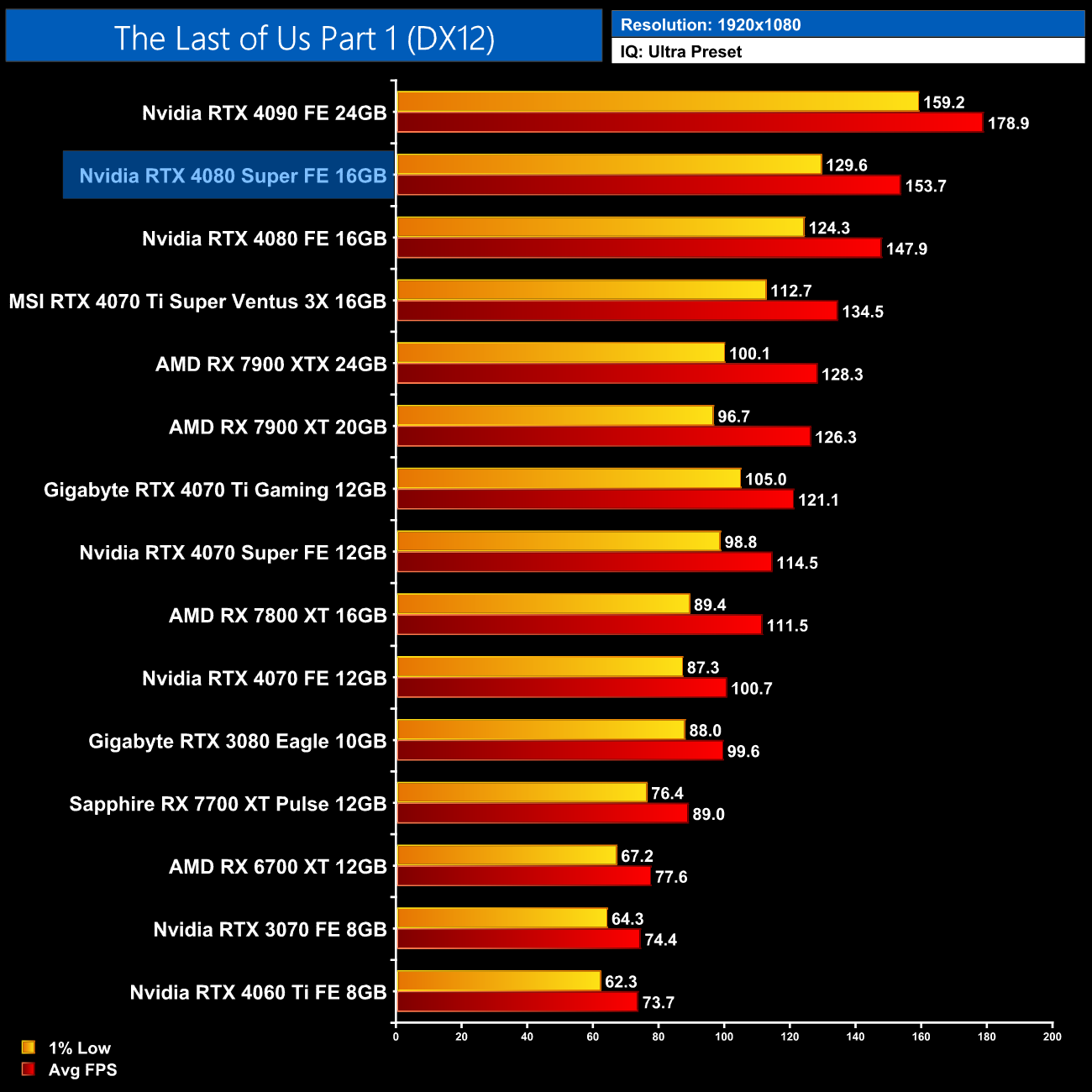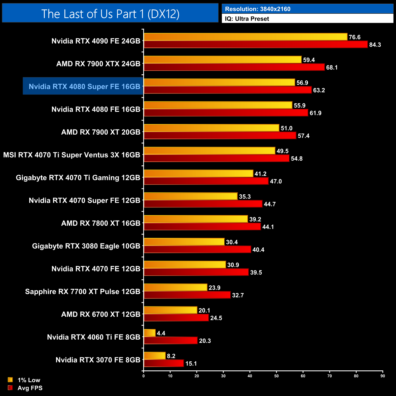 The Last of Us Part 1 sees the RTX 4080 Super hit 63FPS, compared to 62FPS for the regular 4080, so it's not exactly a big step forward. The 7900 XTX is still faster here, by a handful of frames, while the RTX 4090 remains a class apart.