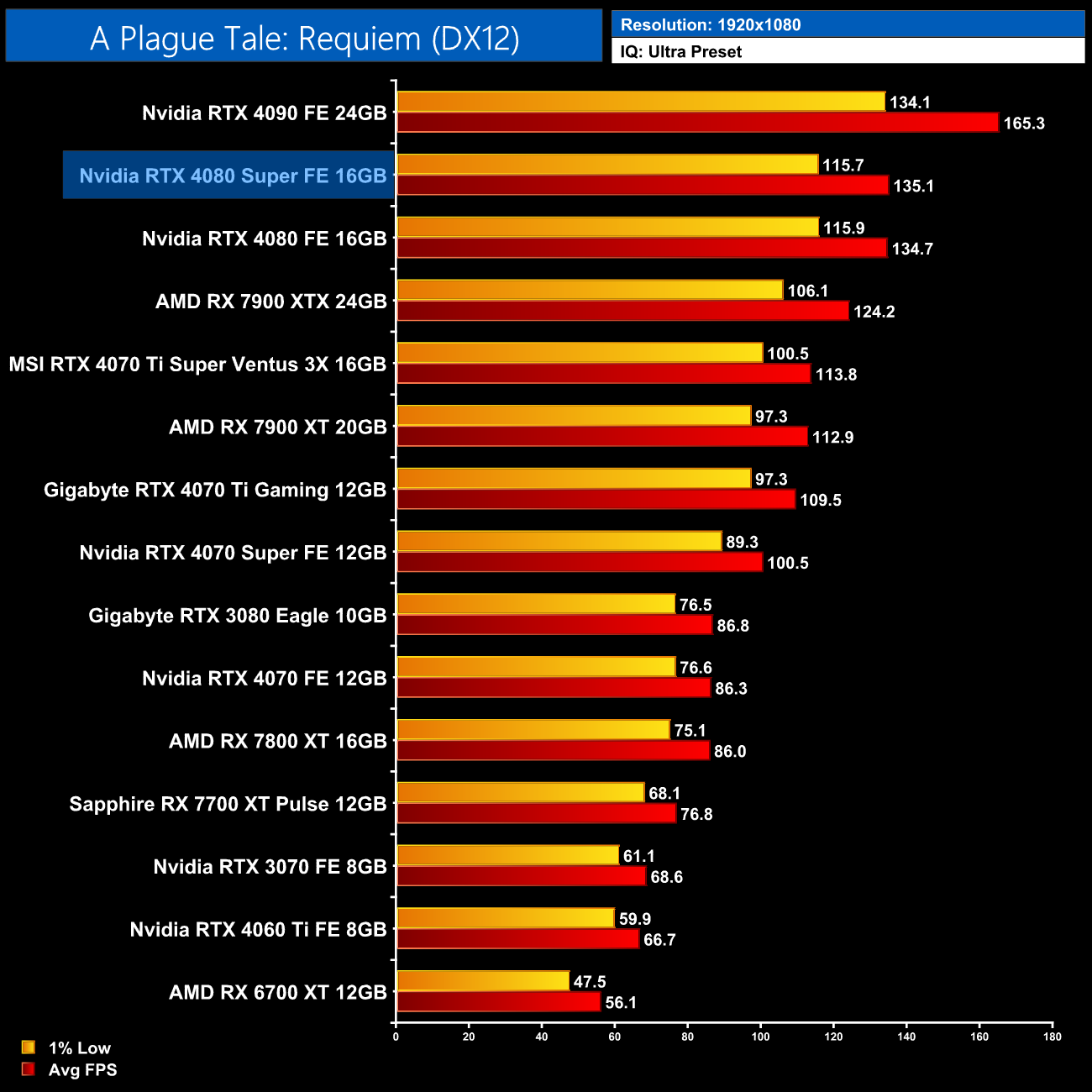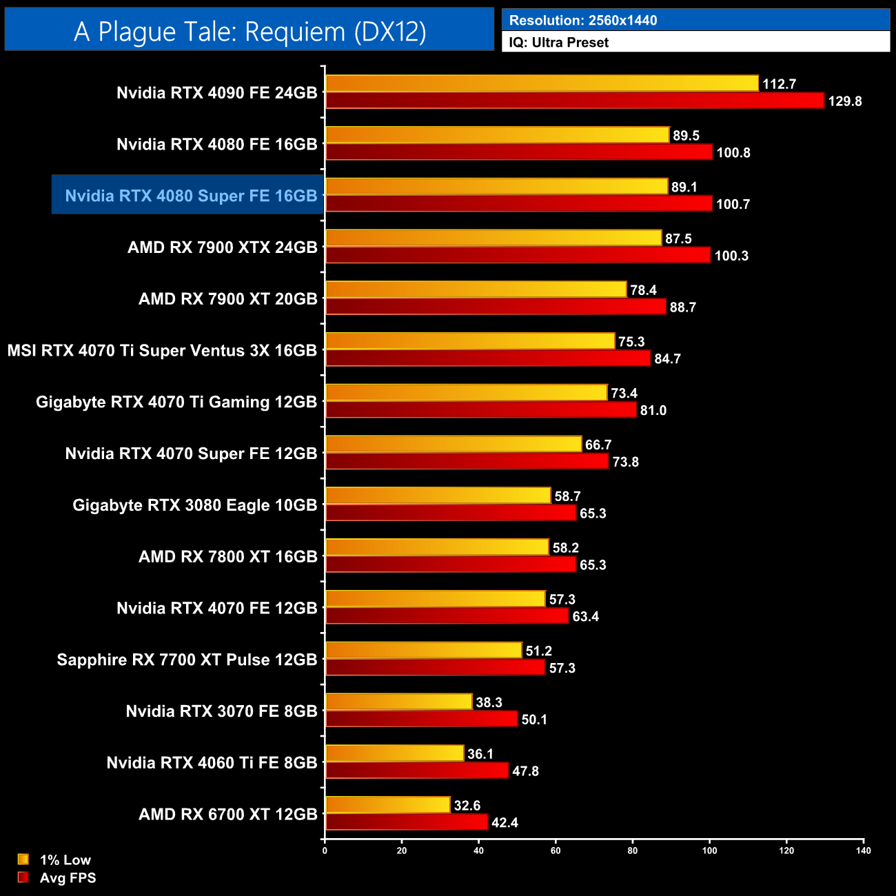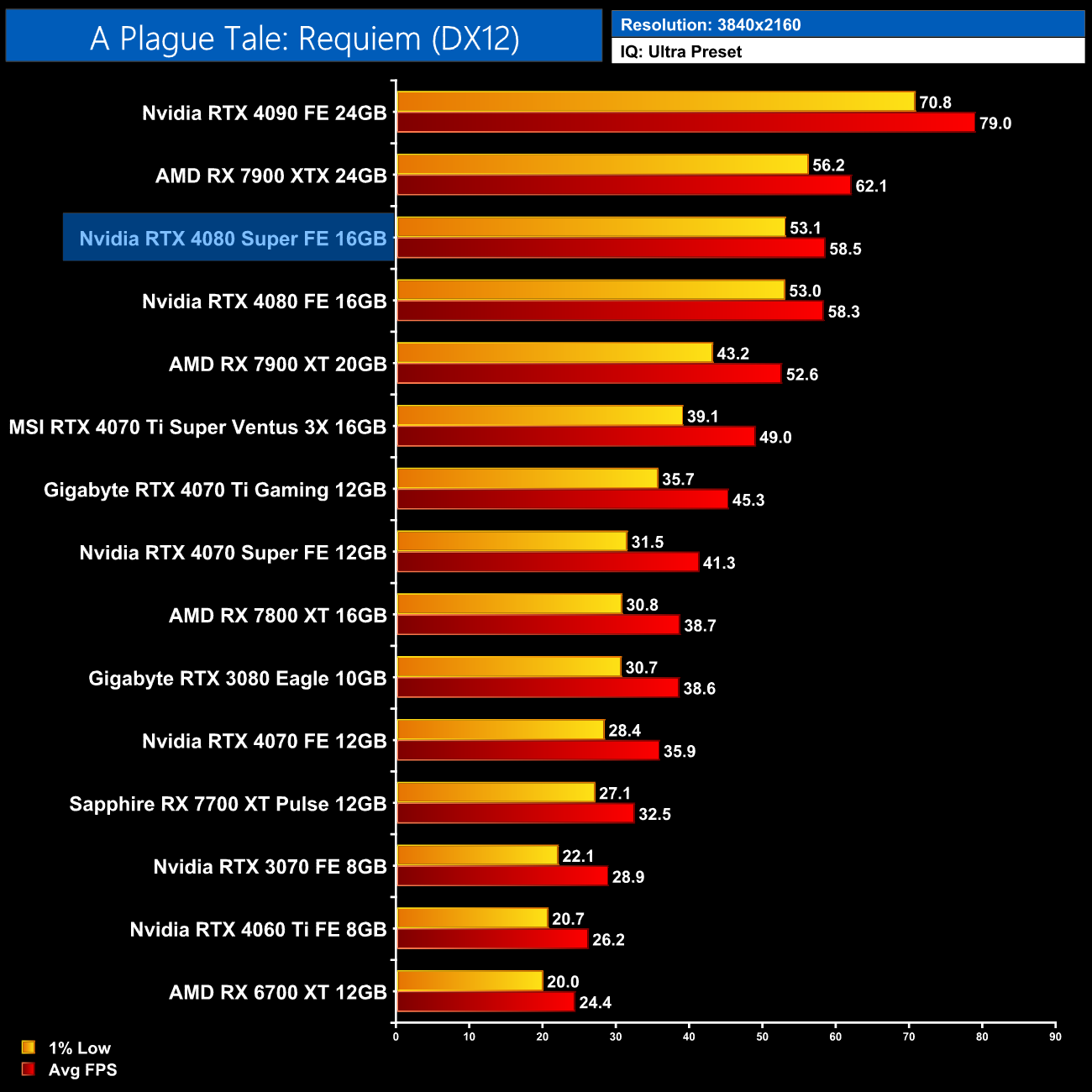 It's more of the same in A Plague Tale: Requiem, with close enough to identical performance on offer when looking at the 4080 and 4080 Super – the difference between the two really is meaningless here.