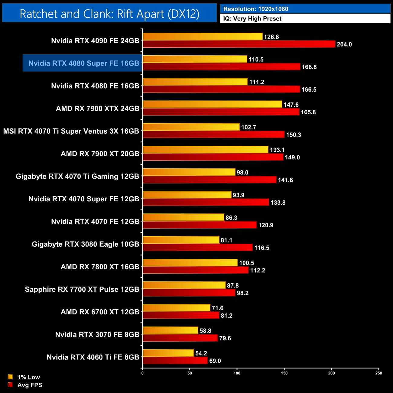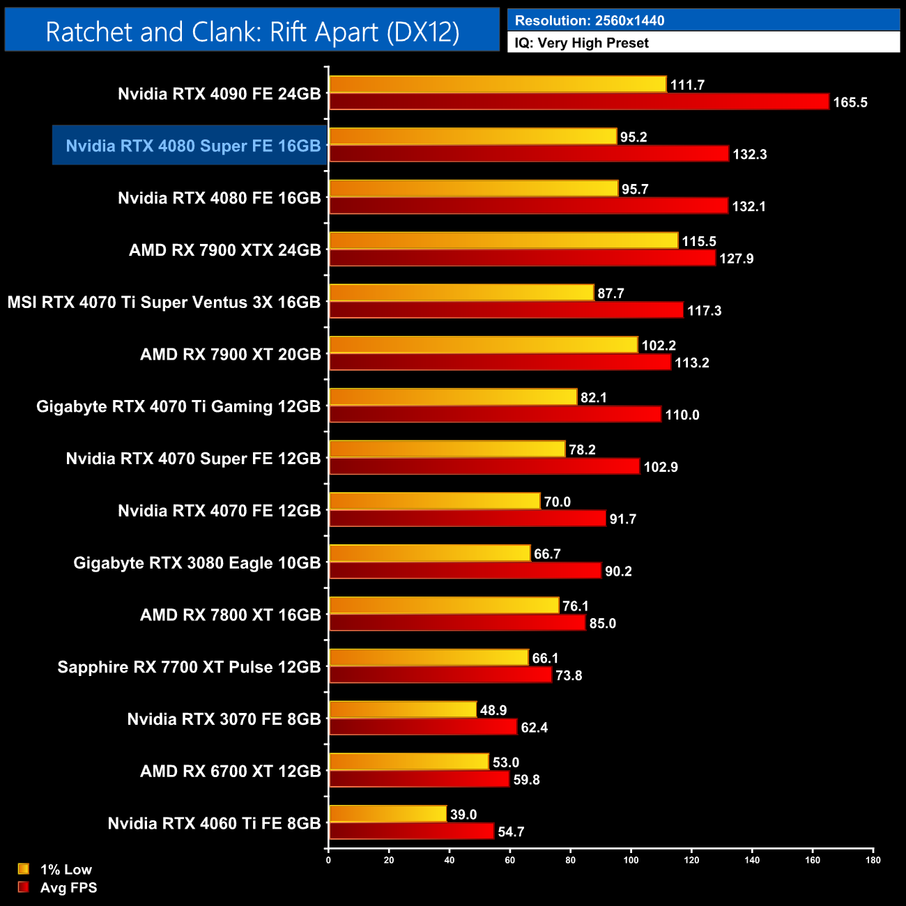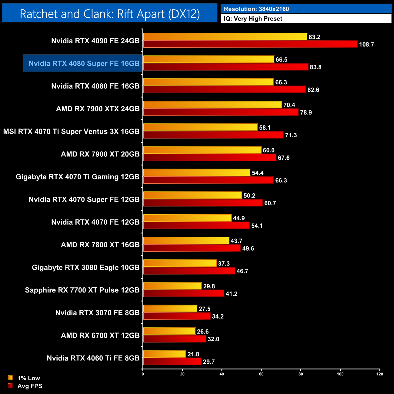 As for Ratchet and Clank: Rift Apart, we're again looking at a difference of a single frame between the two xx80-series SKUS, which really is margin of error stuff. Versus the 4070 Ti Super, you get about 18% more performance from the fully-enabled AD103 GPU.