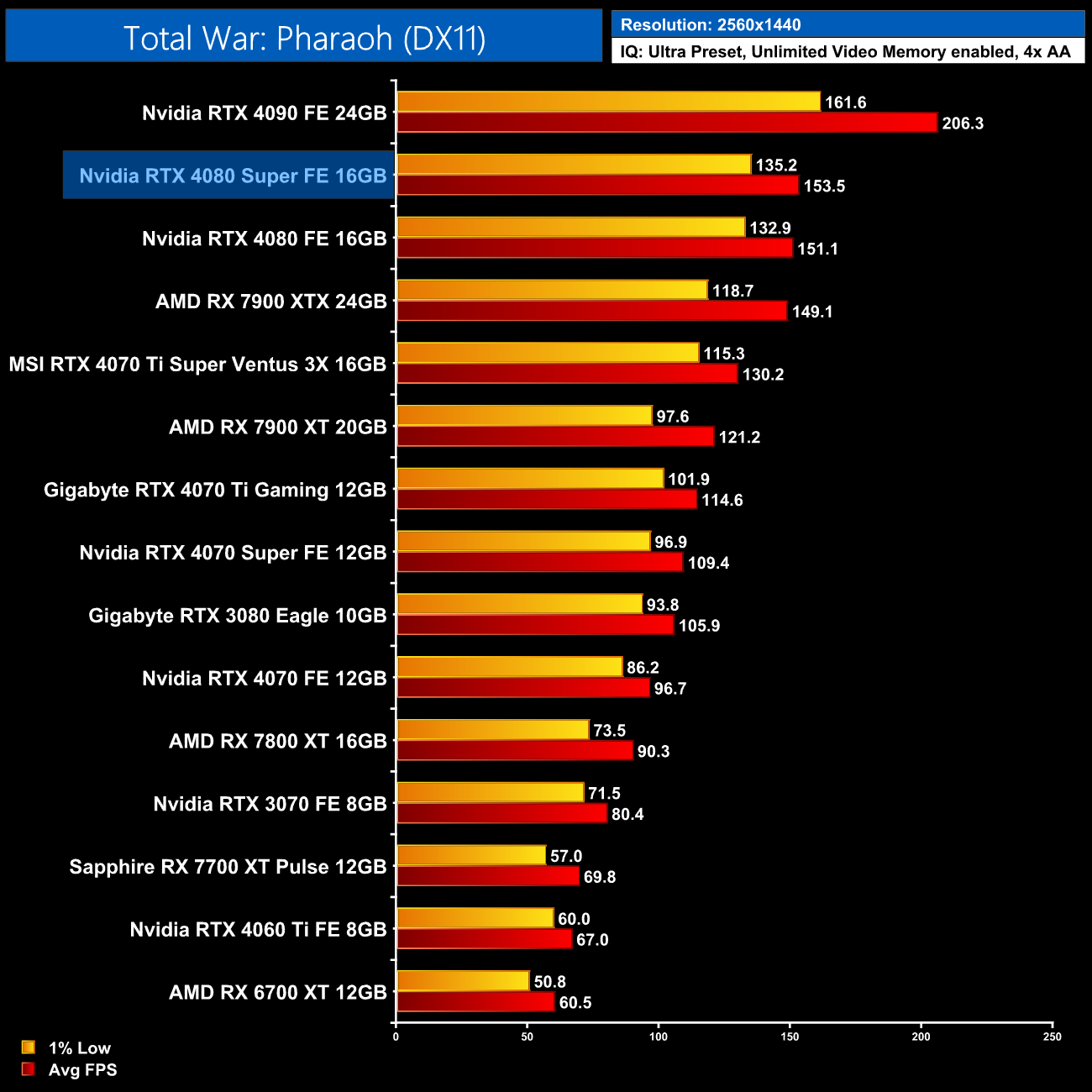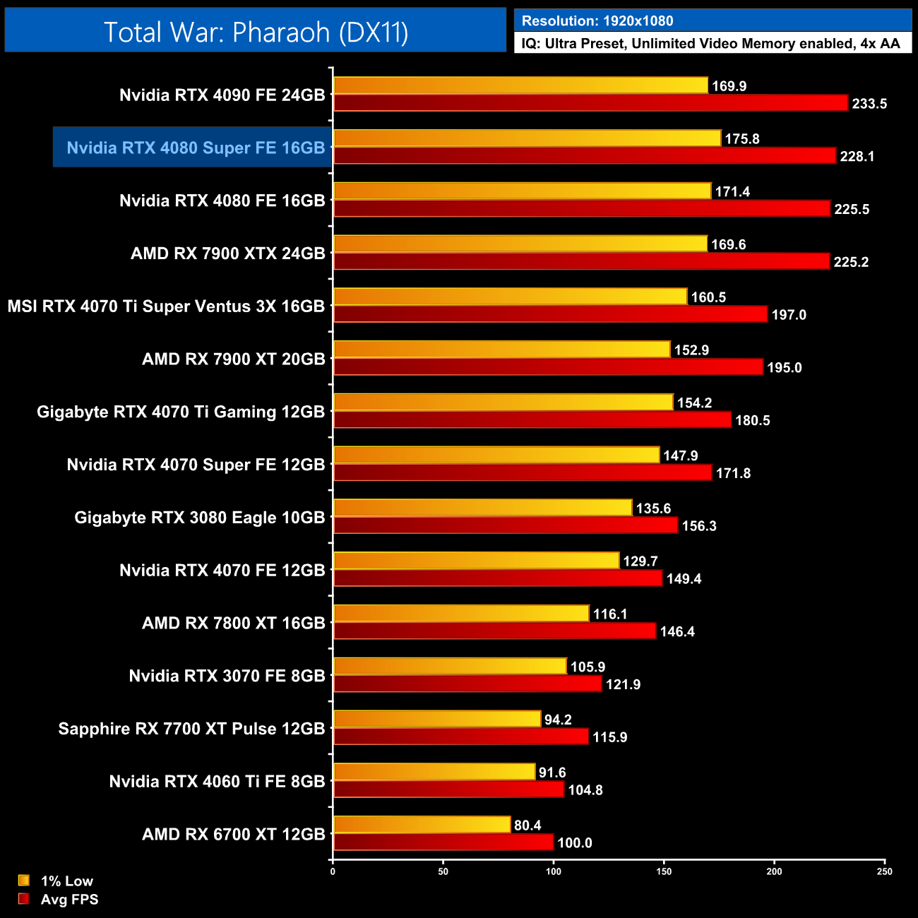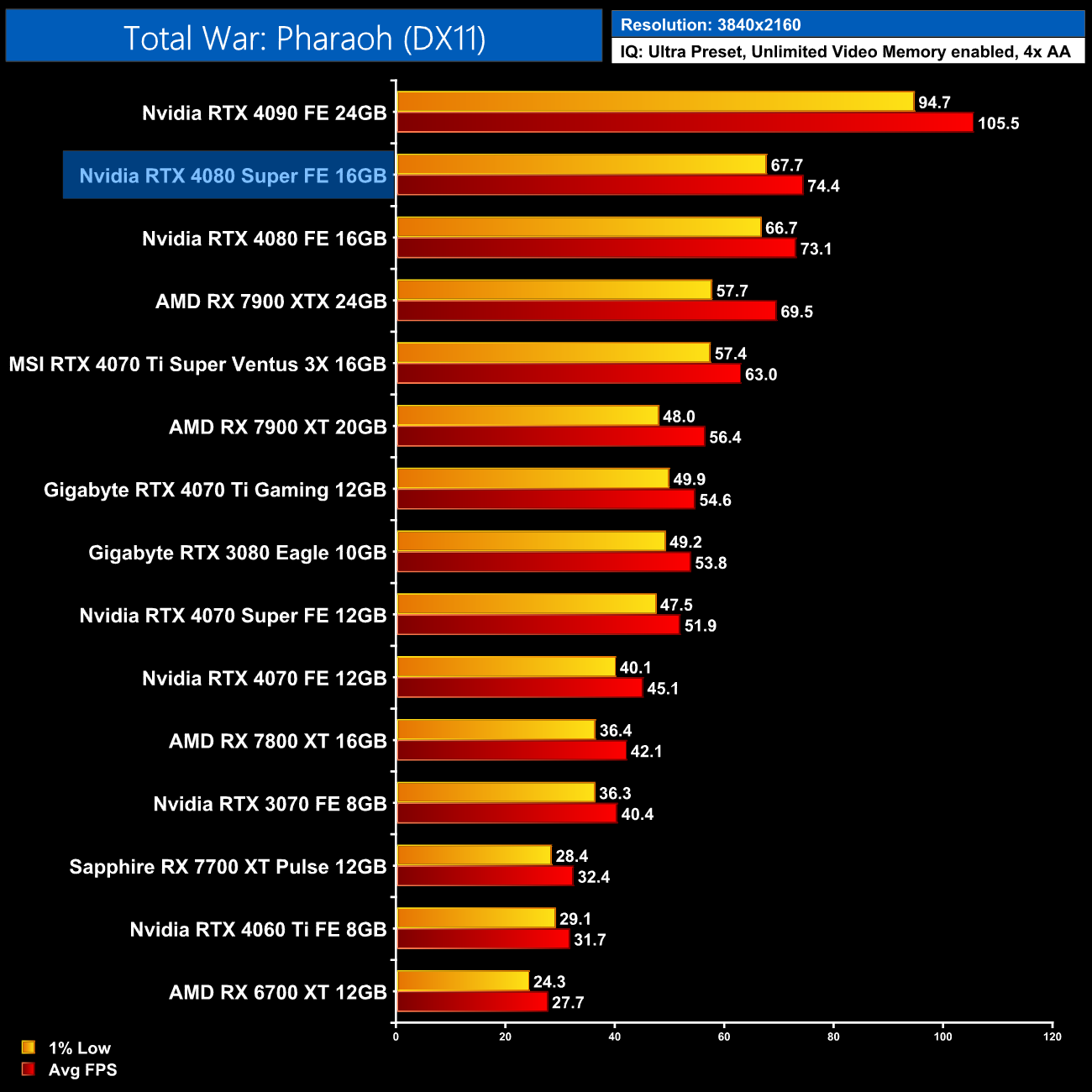 Our final test for rasterised performance is Total War: Pharaoh, which sees the 4080 Super hit 74FPS, so it's a single frame faster than the 4080. It does at least come in faster than the 7900 XTX here, by a 7% margin at 4K.