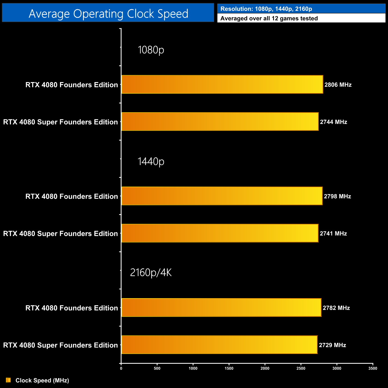 During the review process, I did pass on my feedback to Nvidia that performance gains for the 4080 Super were not at all impressive or even noticeable versus the RTX 4080. As part of the discussions, they mentioned that my RTX 4080 (non-Super) Founders Edition was a ‘good' model, hitting an average gaming clock speed above what Nvidia typically saw in their own testing. As such, I calculated the average clock speed of both the RTX 4080 and RTX 4080 Super Founders Edition, as recorded by FrameView, in all 12 games tested, across 1080p, 1440p and 4K.