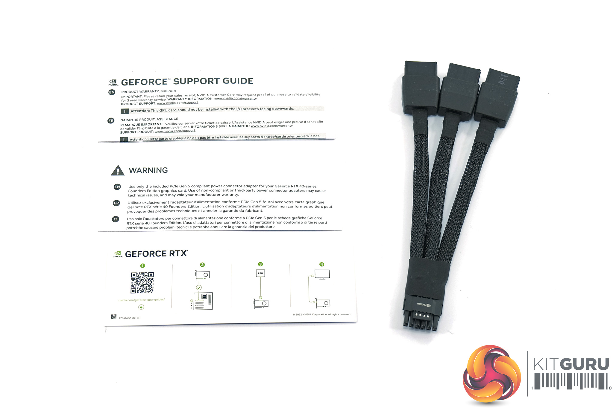 Inside, we find a few support guides and pieces of documentation, along with a triple 8-pin to 16-pin 12VHPWR adapter.