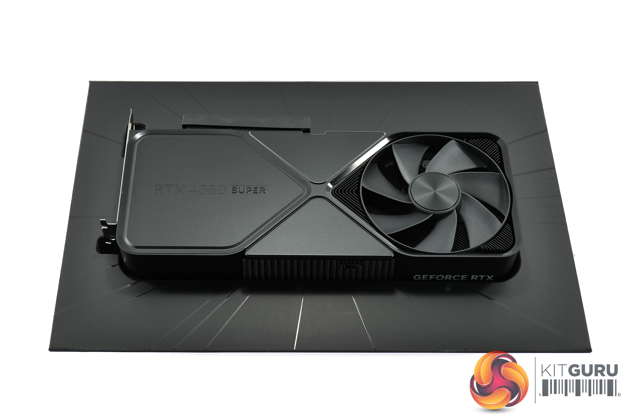 The RTX 4080 Super Founders Edition ships in a large black box, with barely distinguishable branding on the front. The front of the box opens up to reveal the card sitting in the middle of the cardboard surround.