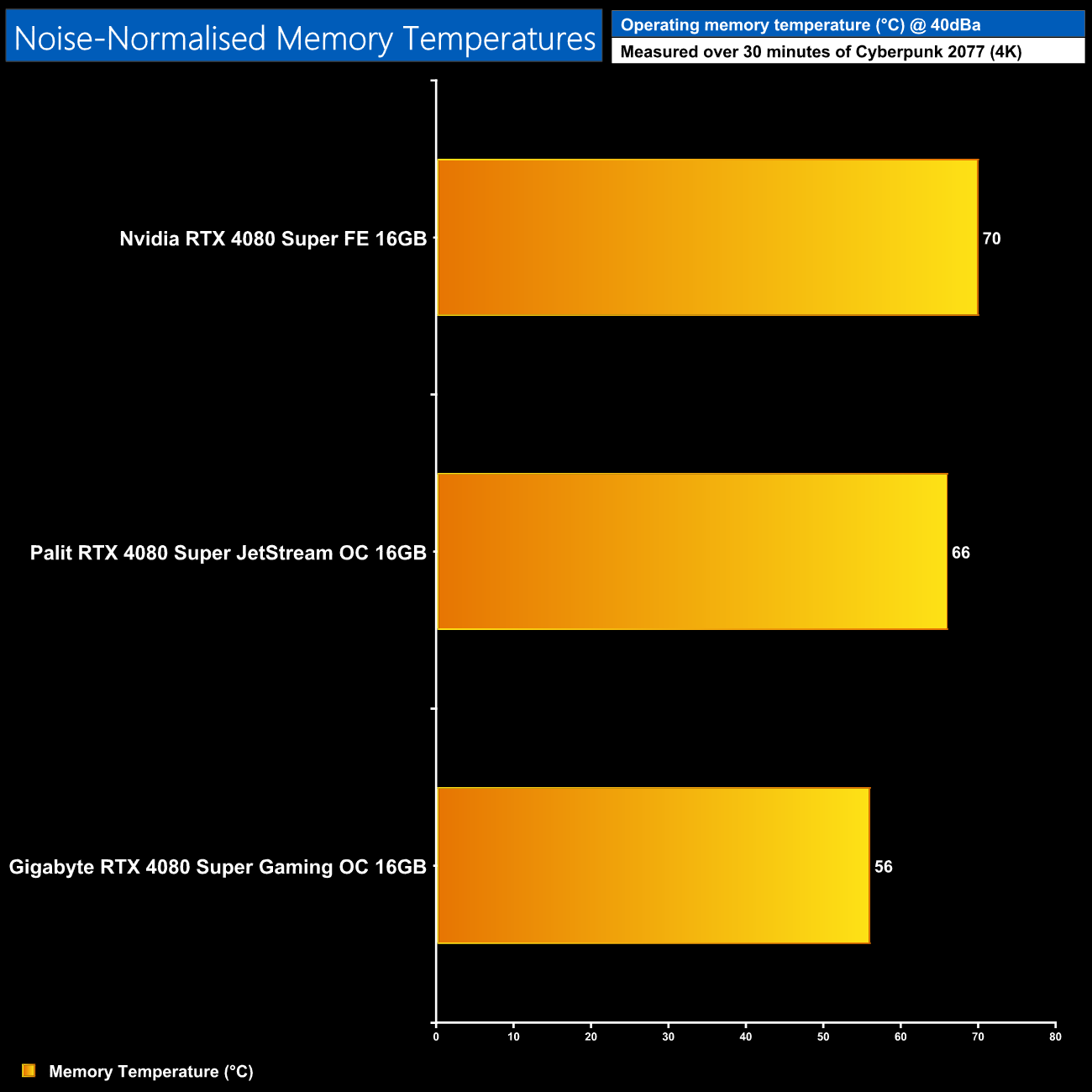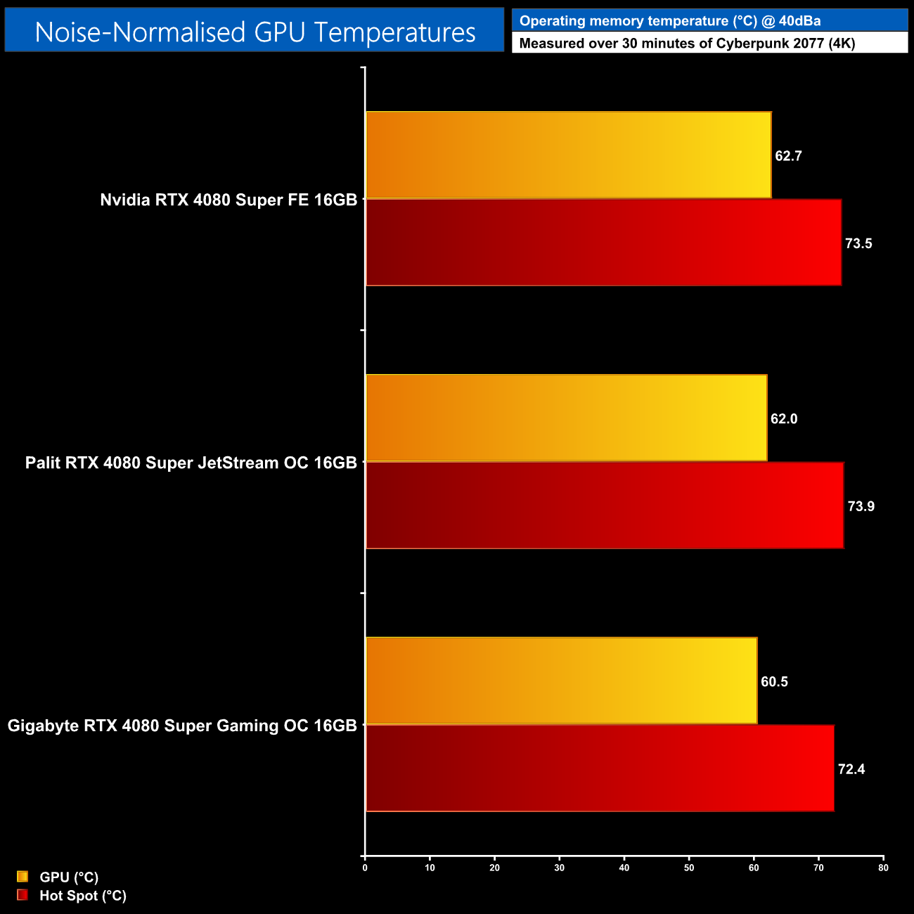 After noise-normalising to 40dBa, we see very similar results between all three RTX 4080 Supers tested. The Founders Edition is nominally the worst-performing, but the differences are barely 2C between it and the Gaming OC, so it's only a very minor point.