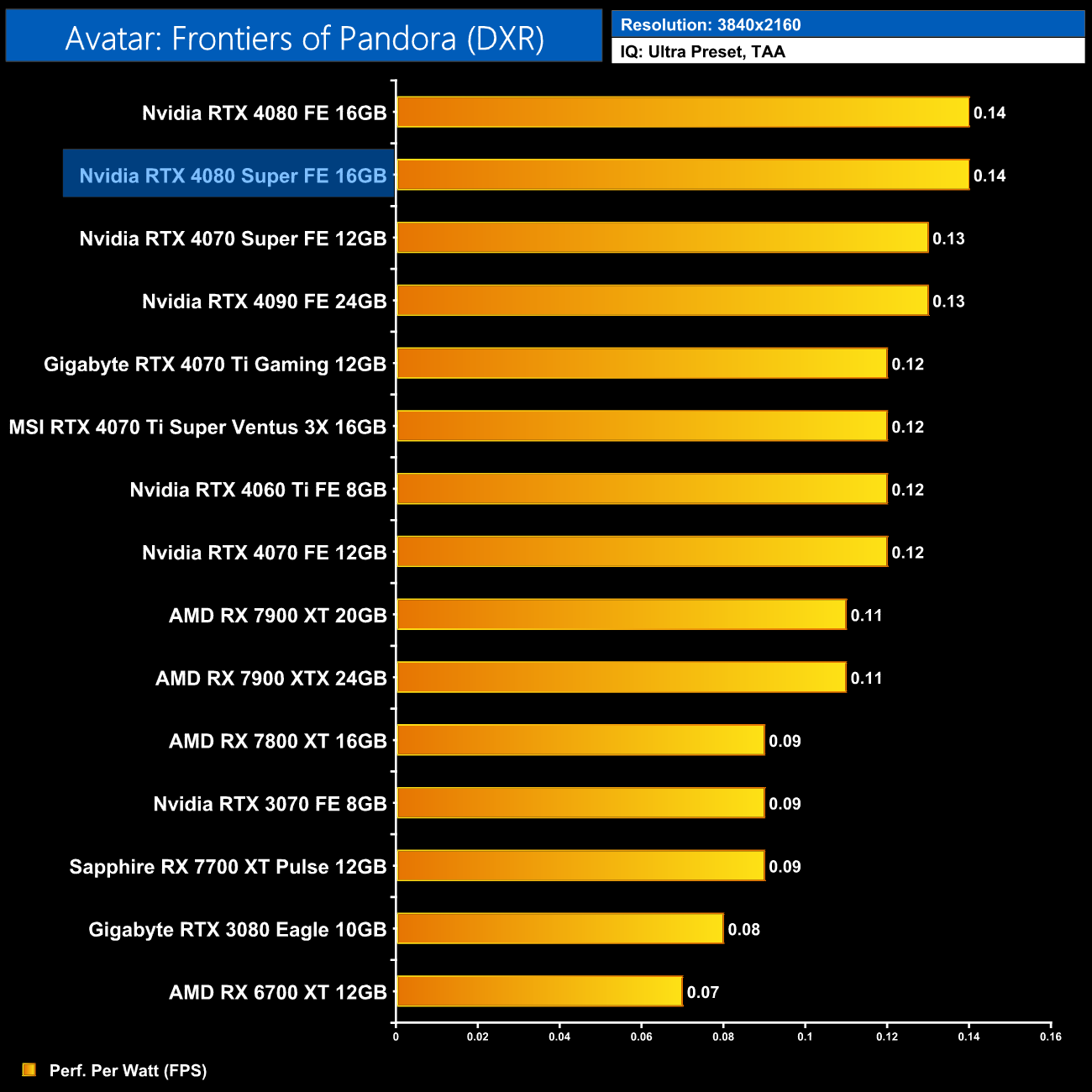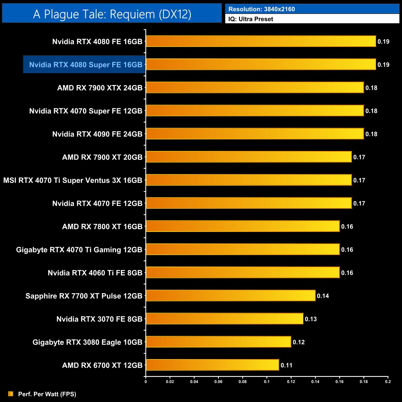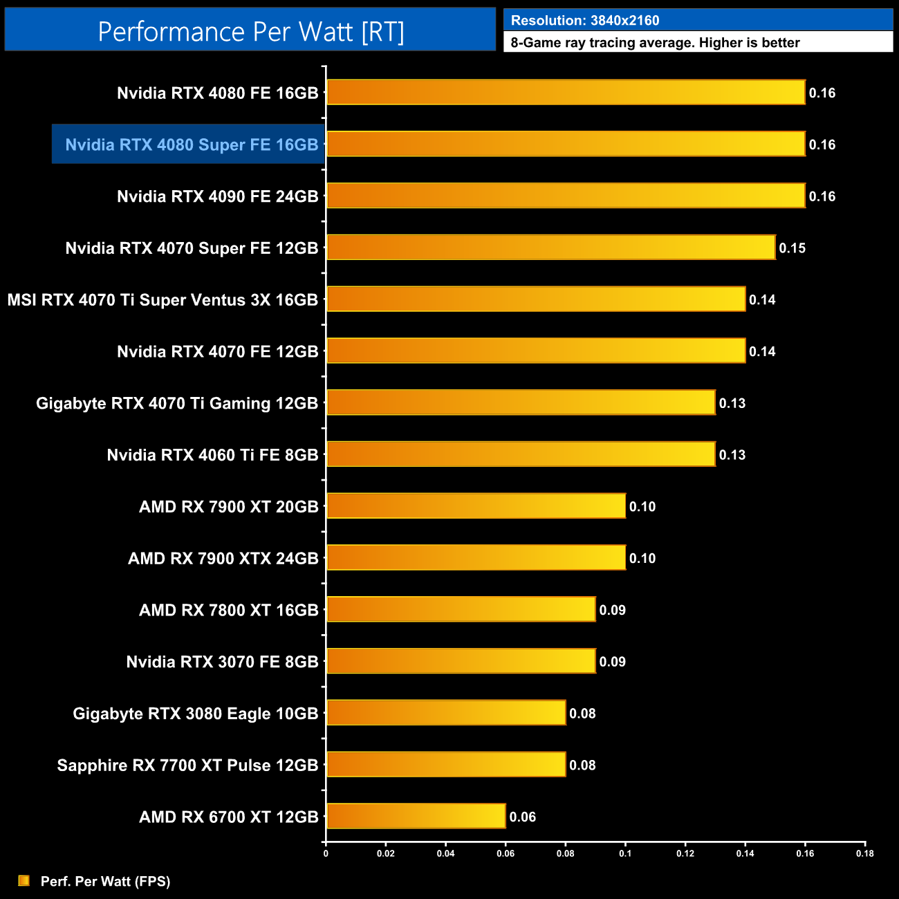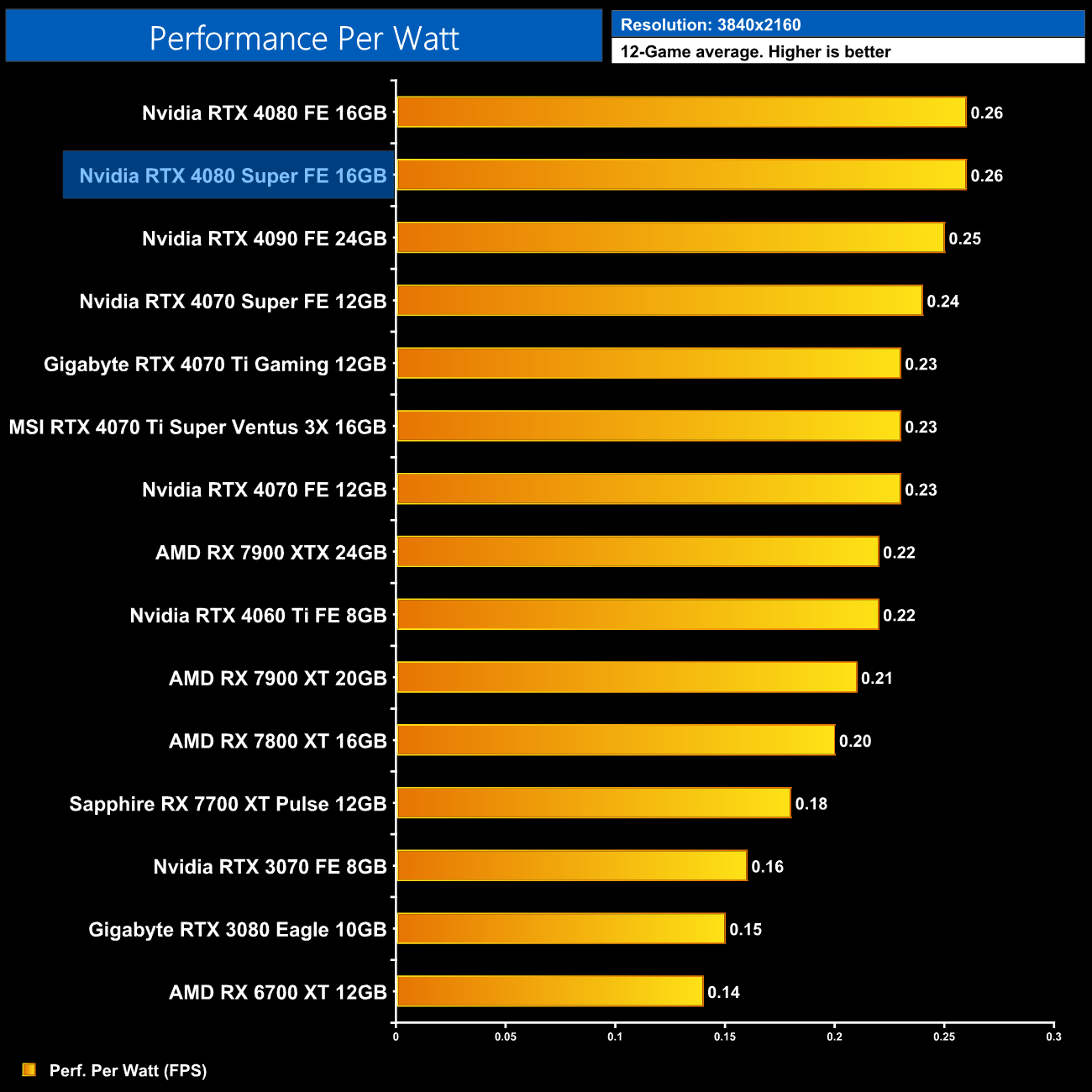 At 4K however, performance per Watt equalises and the RTX 4080 Super and RTX 4080 are just as efficient as each other. That still means Nvidia has a clear lead over RDNA 3 however, with the 4080 Super offering 18% better performance per Watt than the RX 7900 XTX, and it's even a hair more efficient than the RTX 4090.