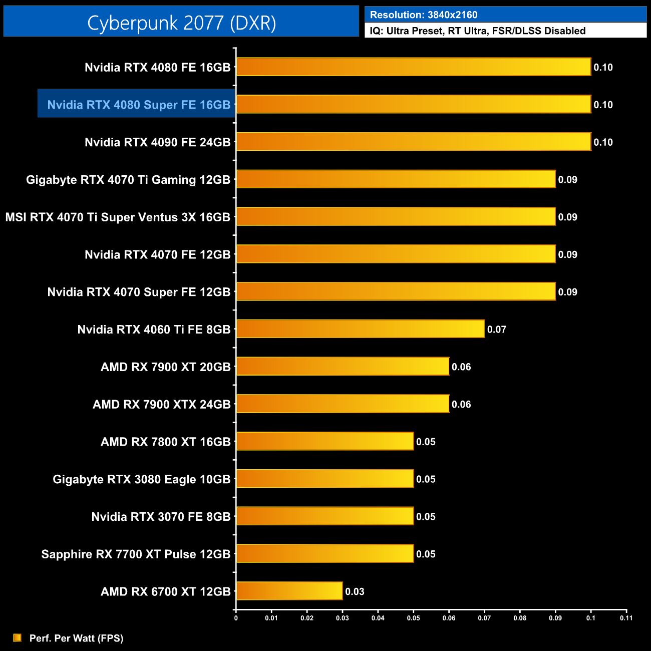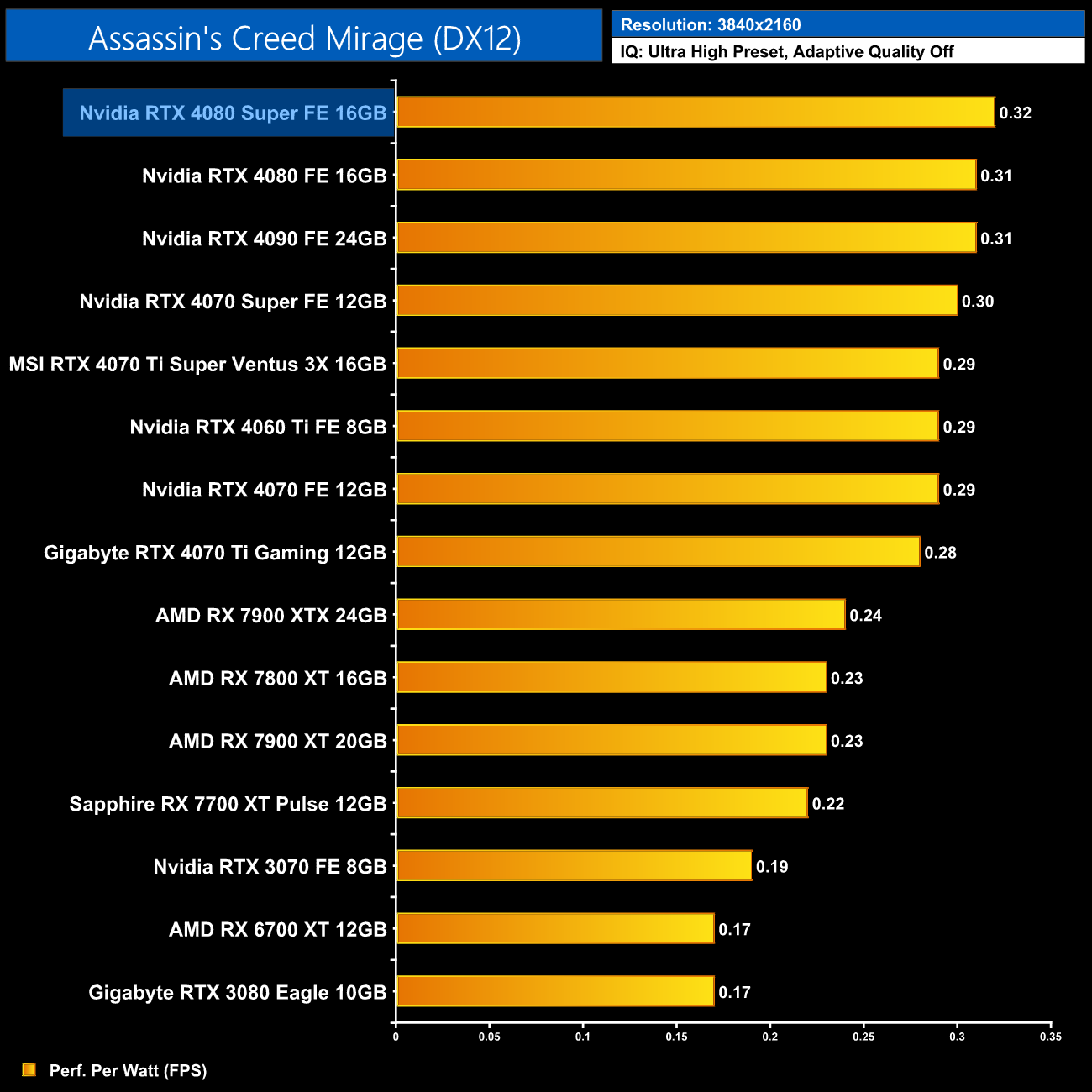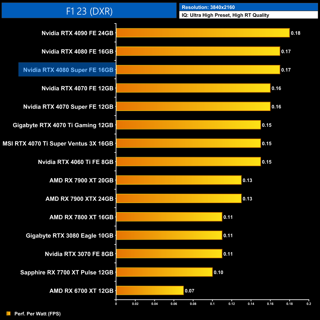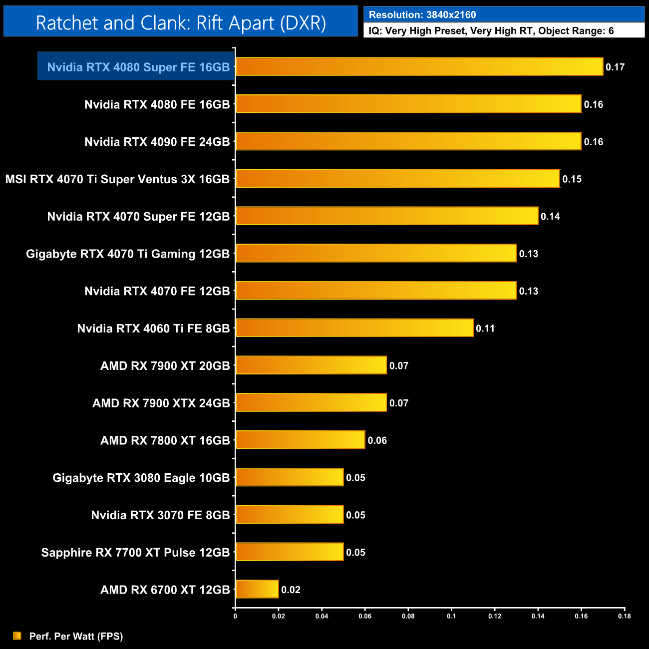 At 4K however, performance per Watt equalises and the RTX 4080 Super and RTX 4080 are just as efficient as each other. That still means Nvidia has a clear lead over RDNA 3 however, with the 4080 Super offering 18% better performance per Watt than the RX 7900 XTX, and it's even a hair more efficient than the RTX 4090.