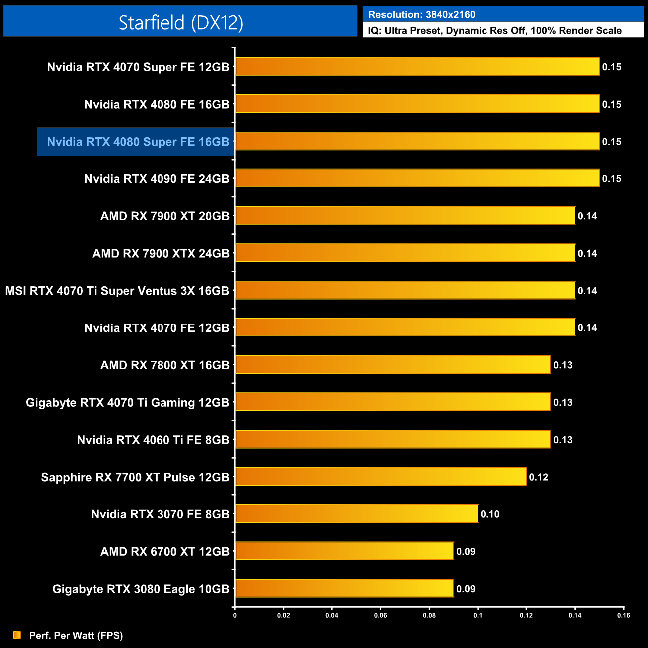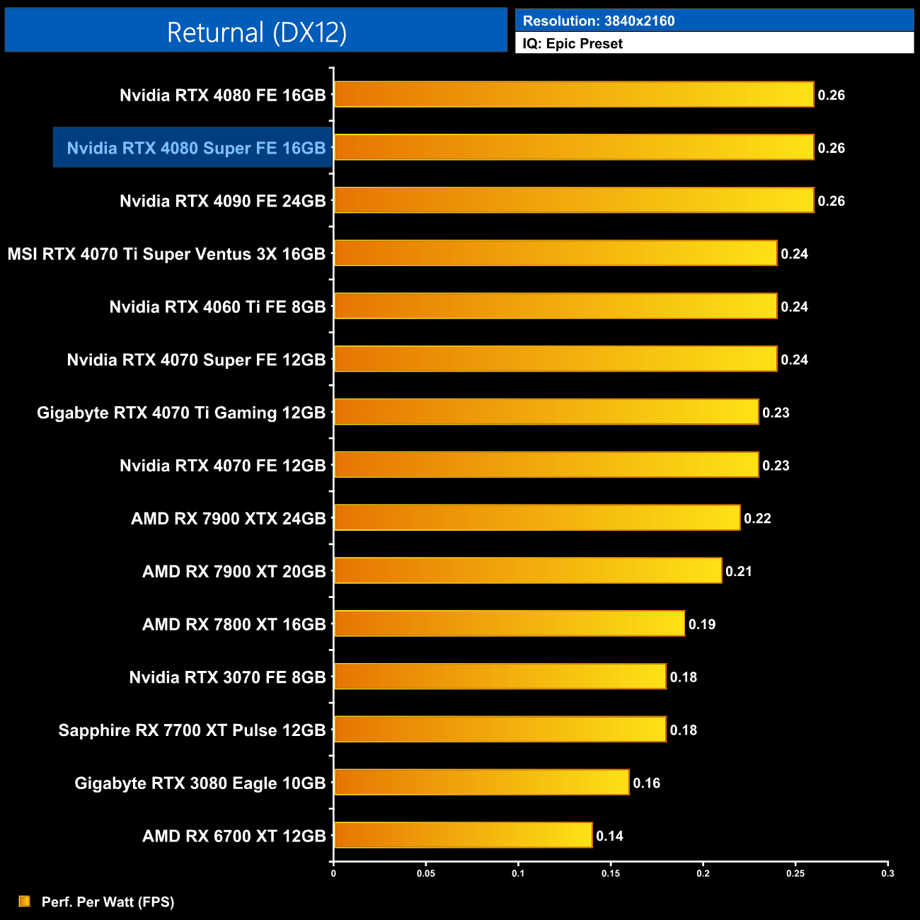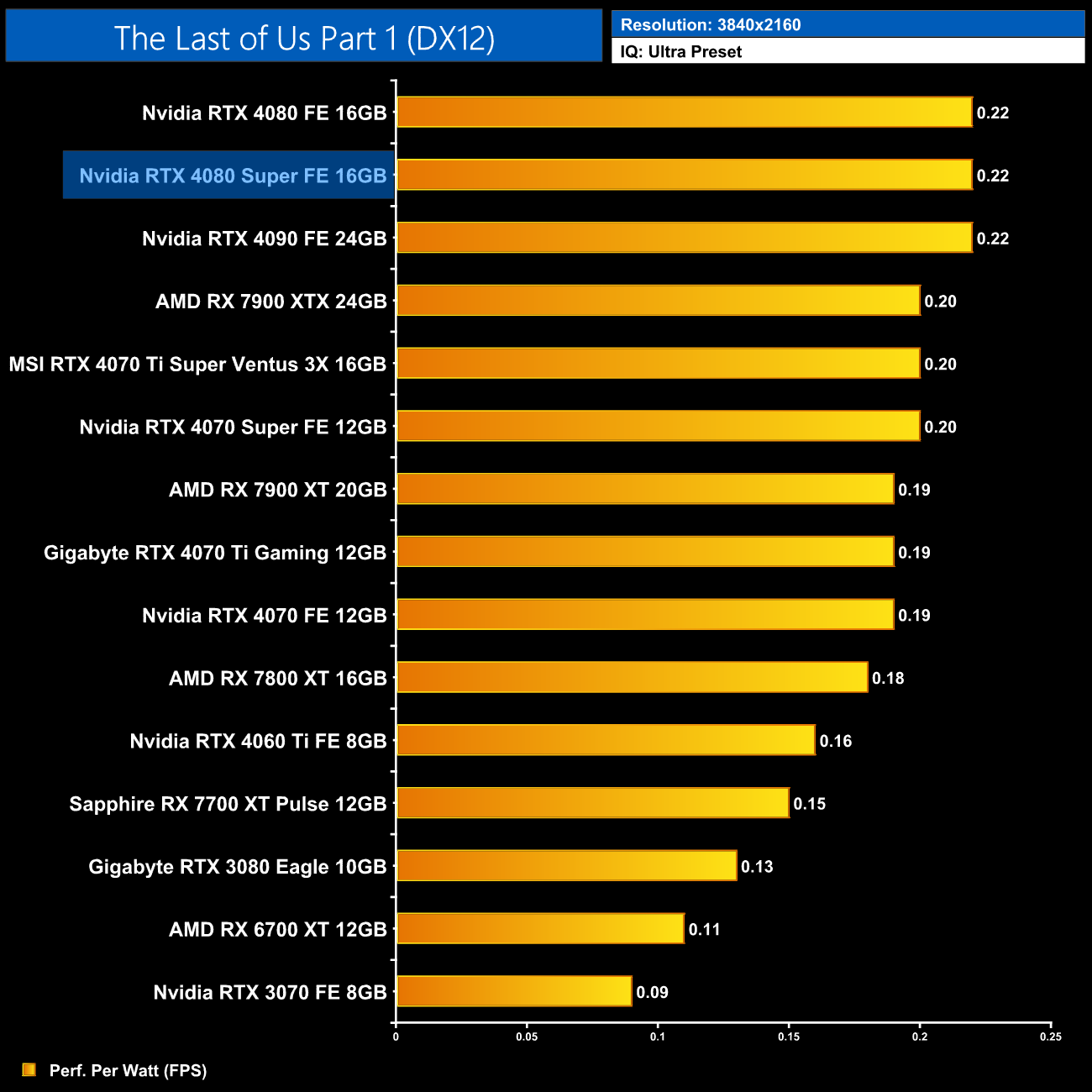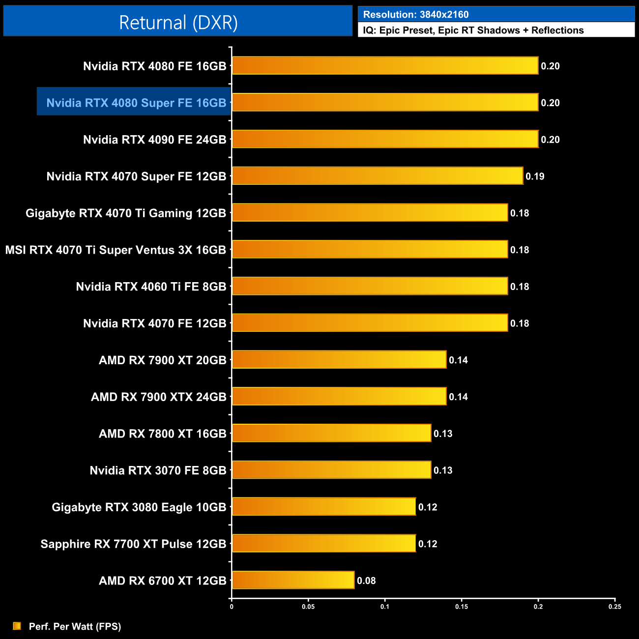 At 4K however, performance per Watt equalises and the RTX 4080 Super and RTX 4080 are just as efficient as each other. That still means Nvidia has a clear lead over RDNA 3 however, with the 4080 Super offering 18% better performance per Watt than the RX 7900 XTX, and it's even a hair more efficient than the RTX 4090.