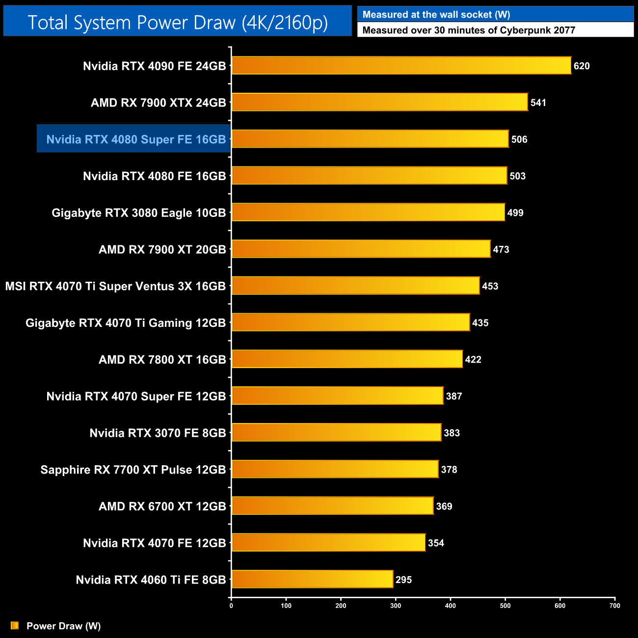 For a look at total system power draw, we see the RTX 4080 Super draw just under 510W in Cyberpunk 2077 at 4K. This will vary depending on the game, the resolution and, of course, the rest of your system's components, but as a guide Nvidia recommends a 750W PSU.
