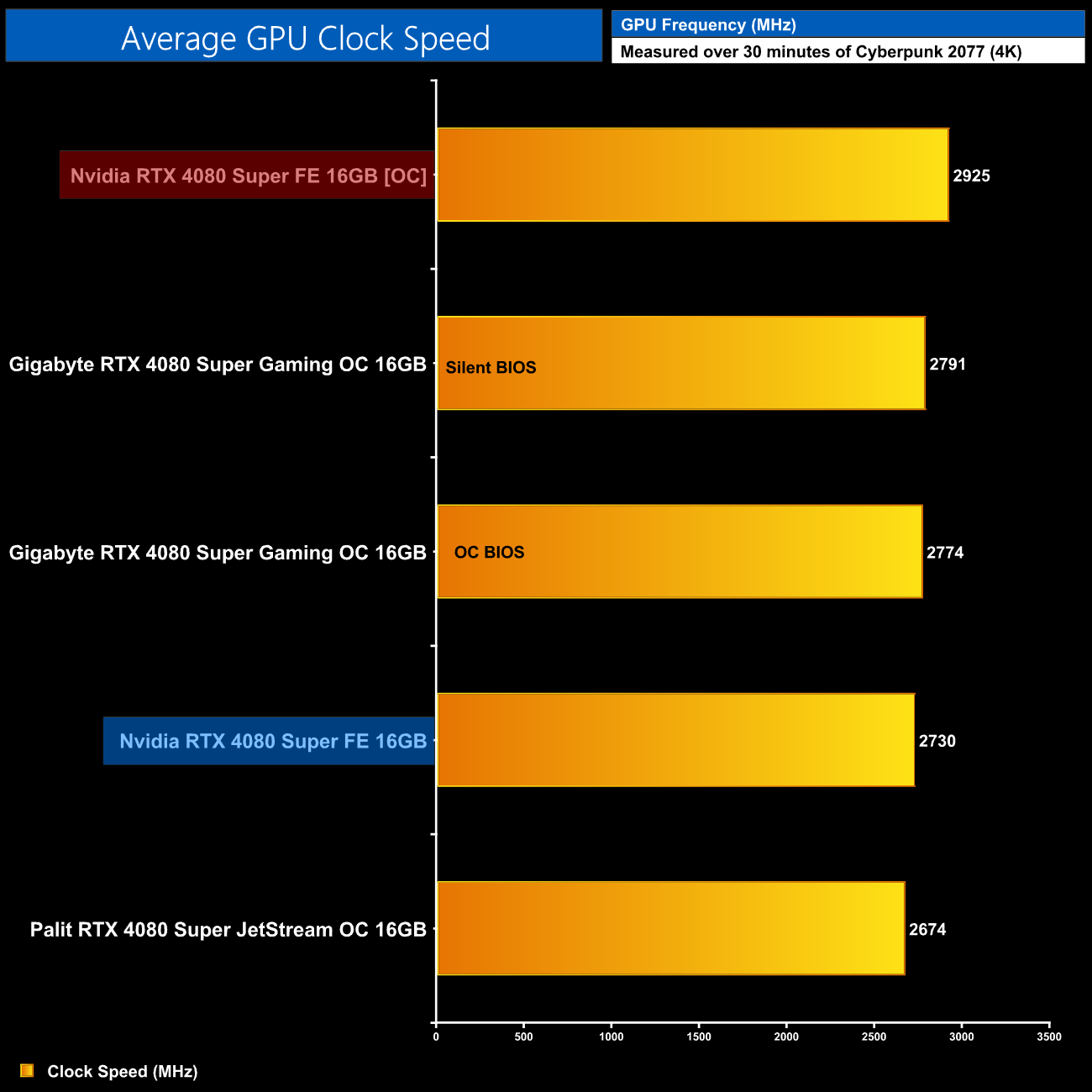 This brought the card's average clock speed up to 2925MHz as measured in our 30-minute stress test.