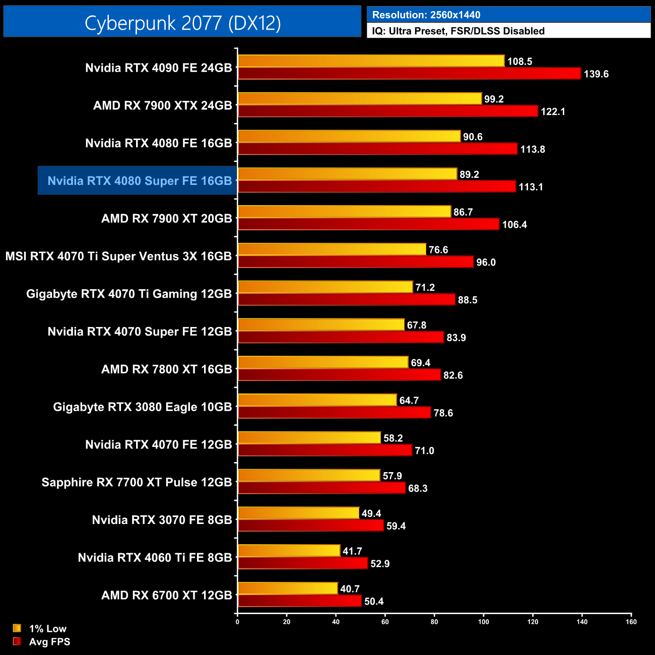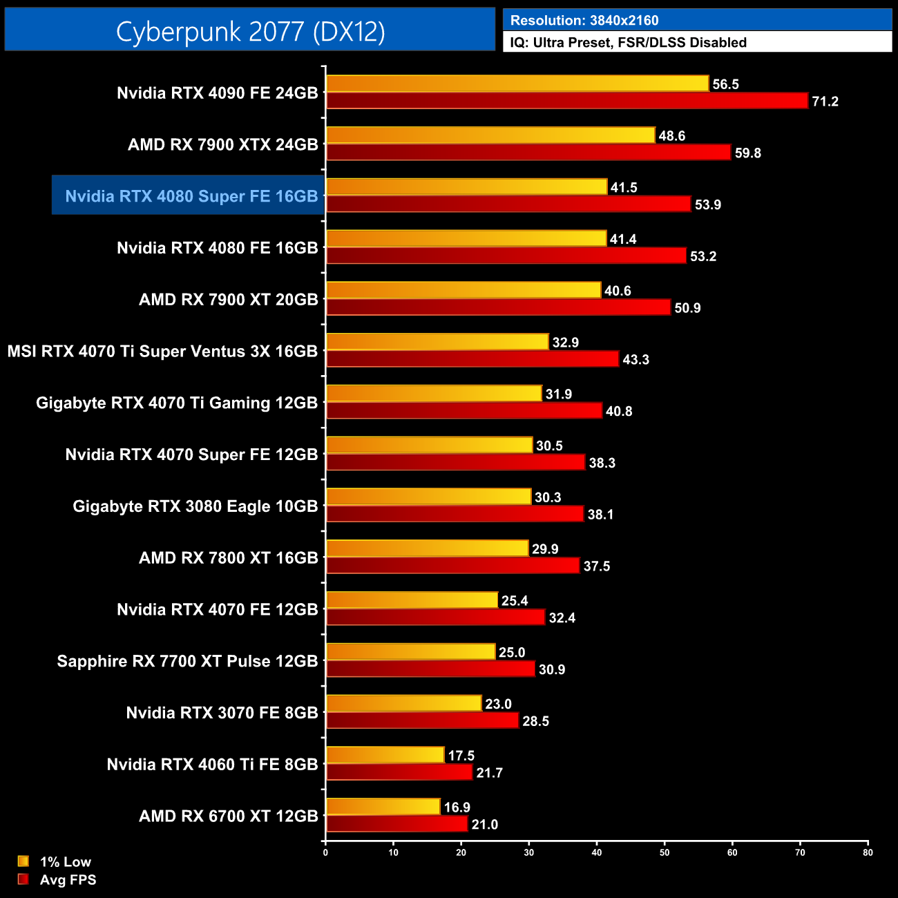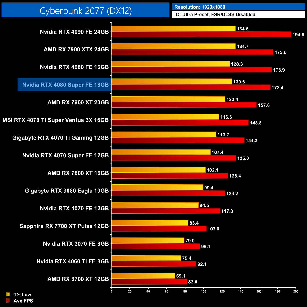 Up next we have Cyberpunk 2077, where the 4080 Super once again has an almost non-existent performance differential against the regular 4080 – they're within 1.3% at 4K, while the new card lags behind the 7900 XTX by 10%.