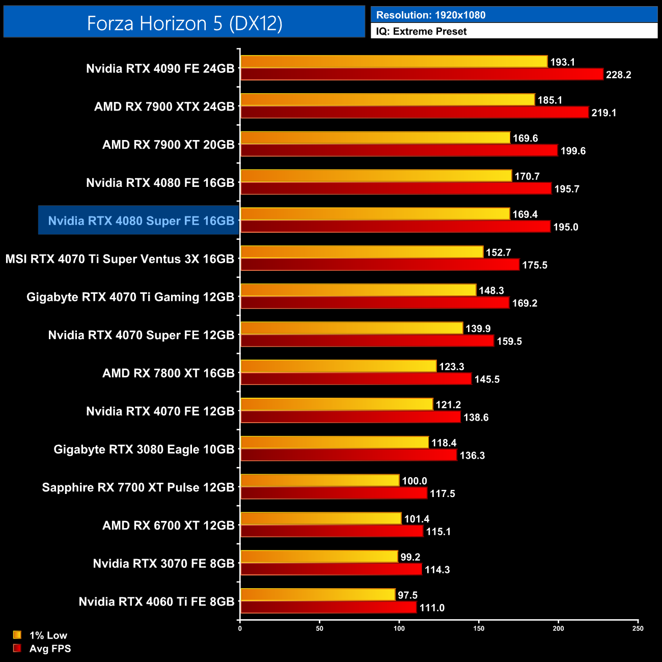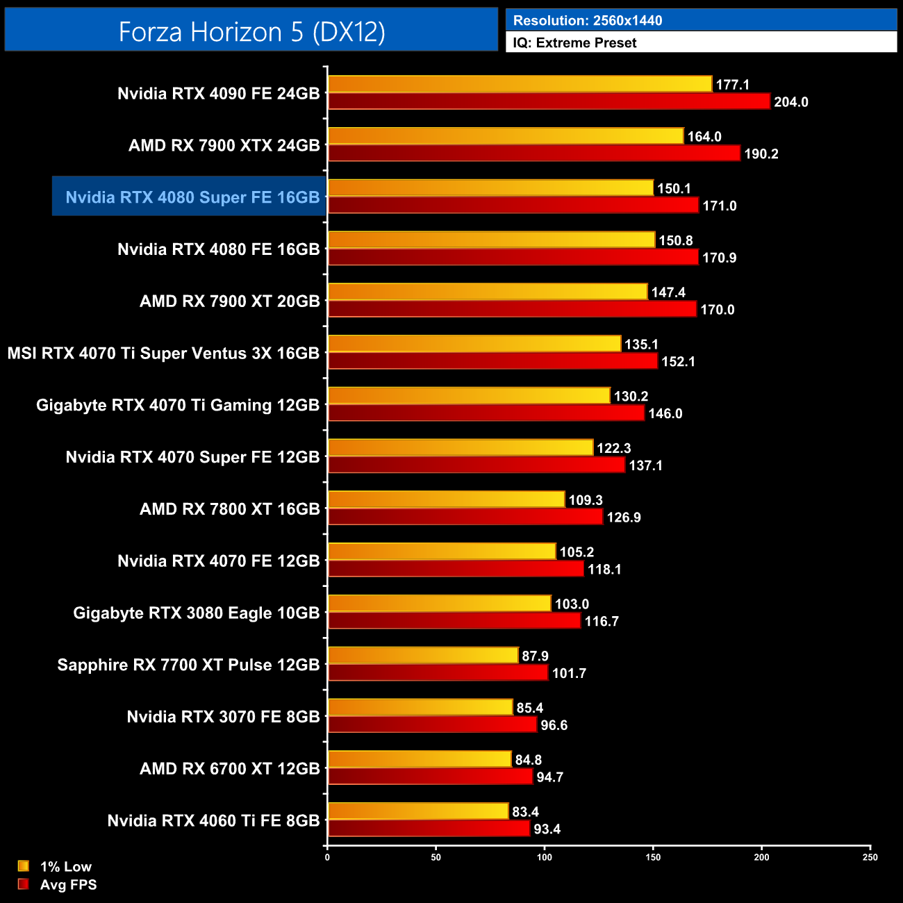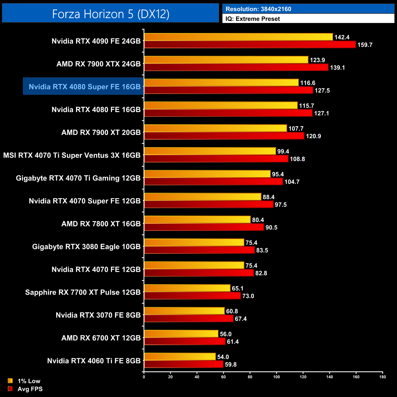 Forza Horizon 5 is another game where we see very underwhelming results from the 4080 Super, as it's not even a single frame faster than the 4080 at 4K. It comes in 8% slower than the 7900 XTX, and about 17% faster than the 4070 Ti Super.