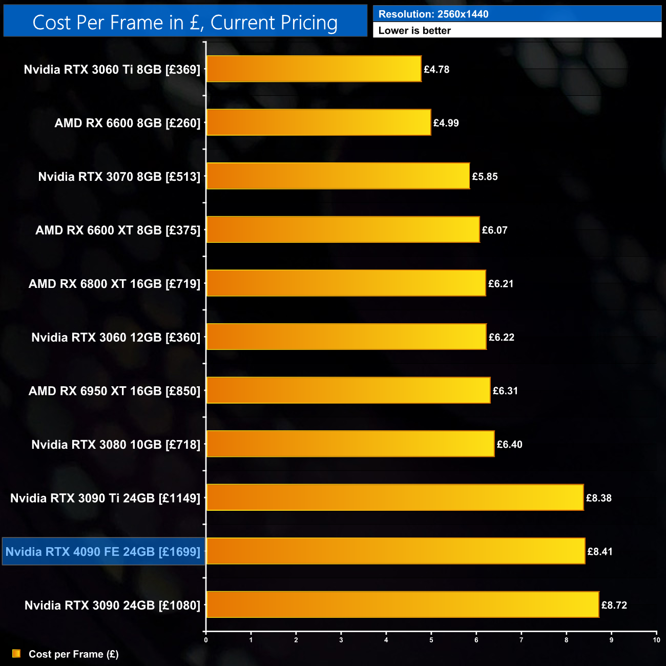 At 1440p, we see the RTX 4090 costs £8.41 for every frame produced, a reduction of 26% against the RTX 3090, and 36% against the RTX 3090 Ti. As expected given the £1699 asking price, however, numerous GPUs are better value for 1440p gaming, including the 6950 XT.