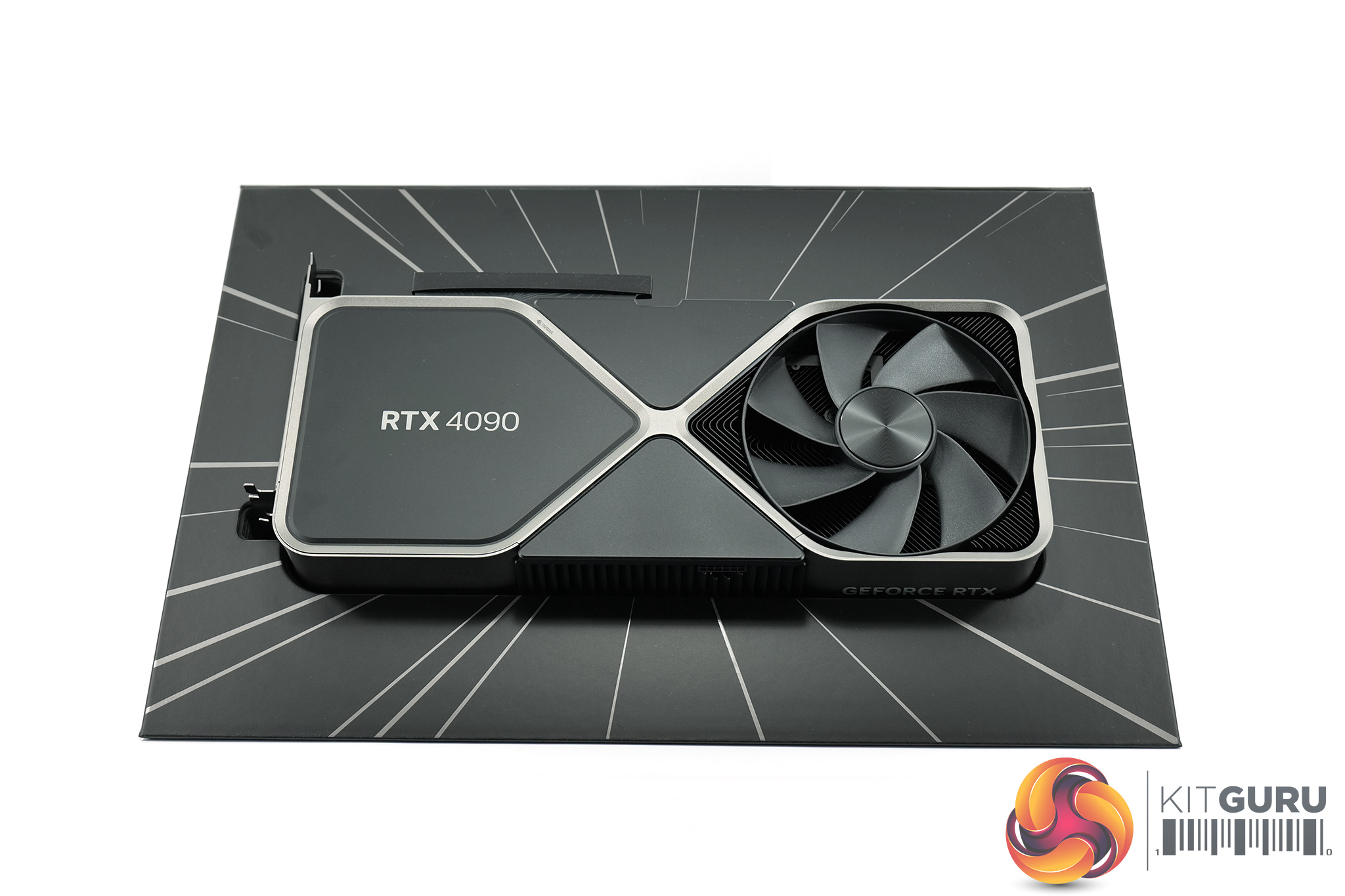 The Nvidia RTX 4090 Founders Edition ships in a large black box. The front of the box opens up to reveal the card itself, sitting in a cardboard surround.