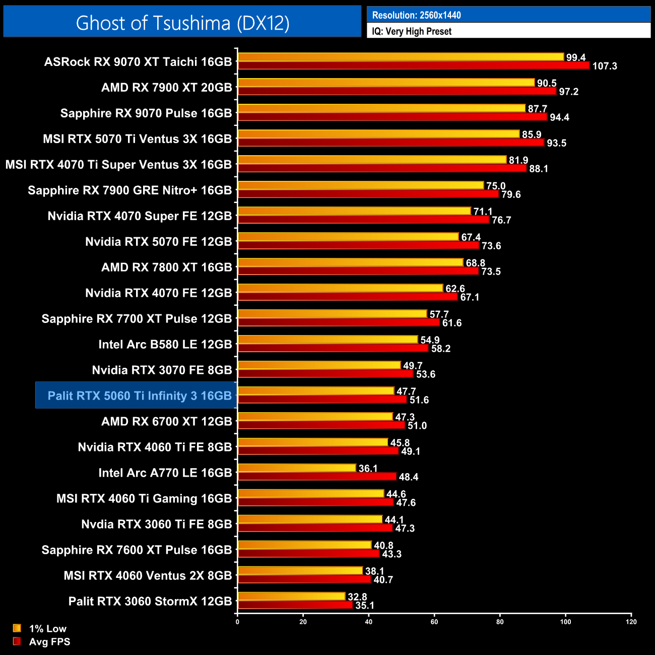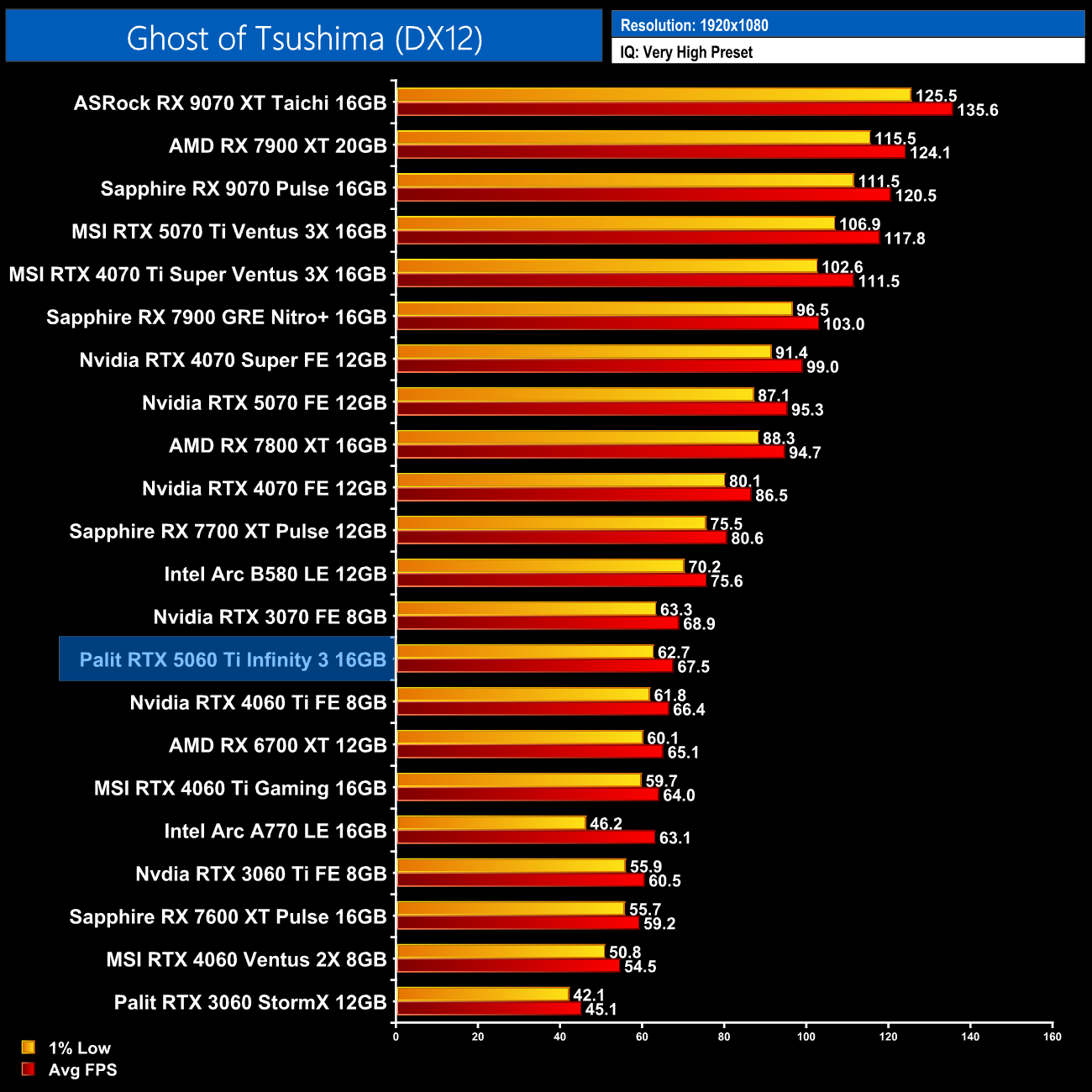 Ghost of Tsushima is next and this is a game where Nvidia GPUs seem to underperform quite significantly – at 1080p, even the Arc B580 is faster than the 5060 Ti 16GB, while it's also 16% slower than the 7700 XT.
