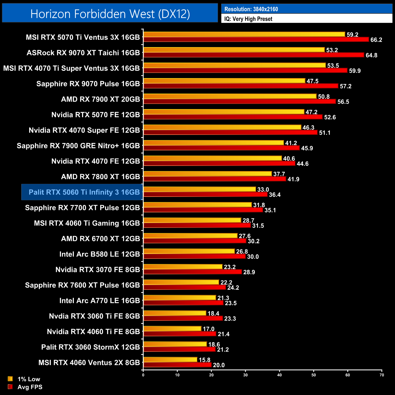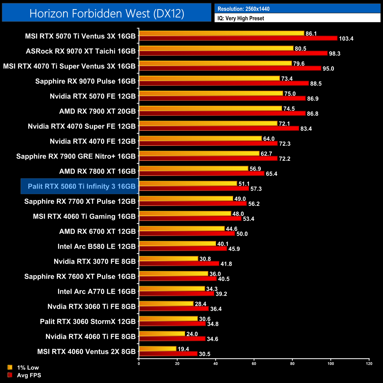 Horizon Forbidden West is a game that uses more than 8GB VRAM even at 1080p, when using the Very High preset. Of course, that's no issue for the 5060 Ti 16GB, but even then, performance gains over the 4060 Ti 16GB are almost non-existent. I wonder if there's another limitation at play – perhaps memory bandwidth, or even PCIe lanes? It's hard to say, but just a 3% gain over its predecessor at 1080p is very disappointing.