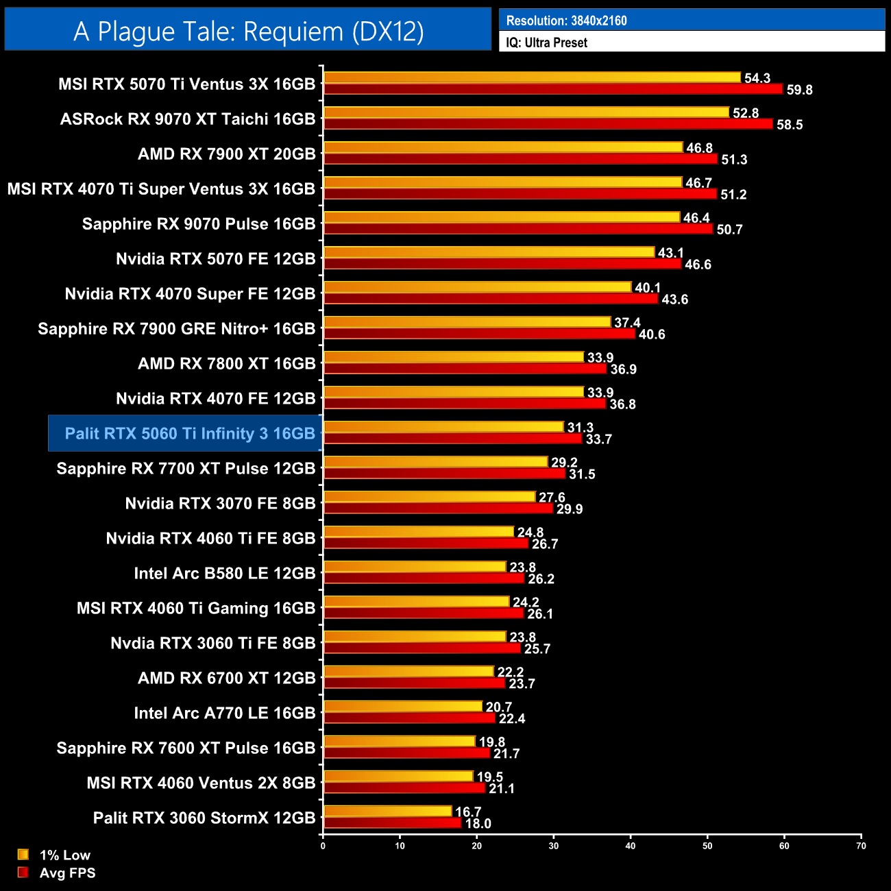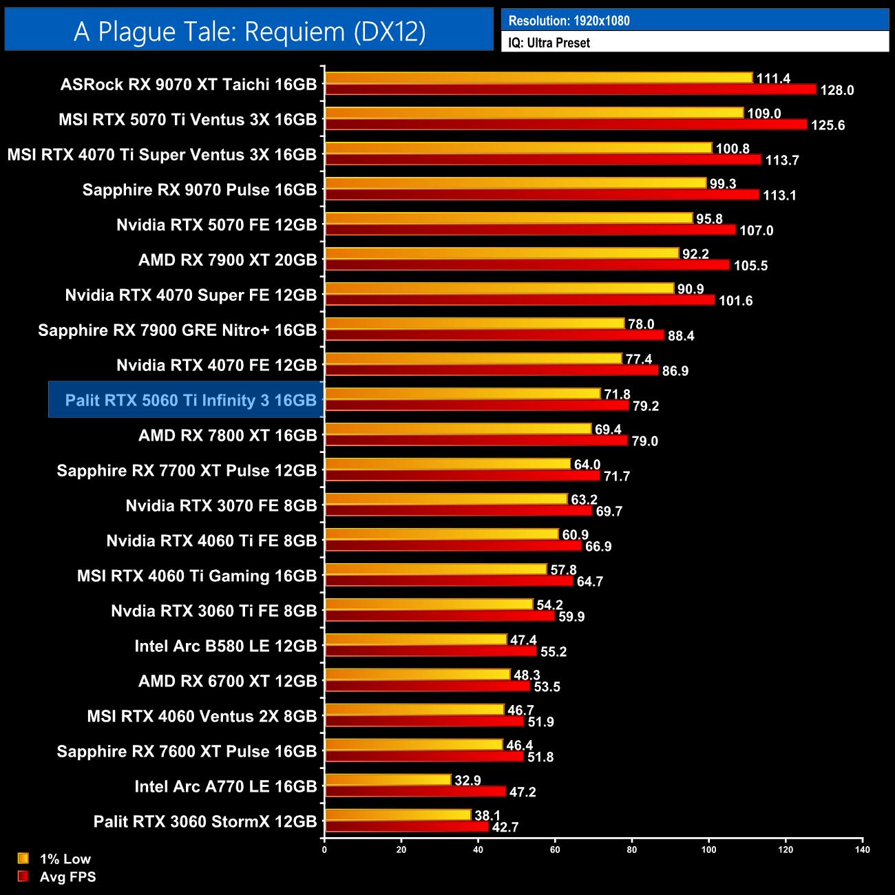 The 5060 Ti 16GB also does well in A Plague Tale: Requiem, hitting 79fps at 1080p, putting it right on par with the RX 7800 XT.