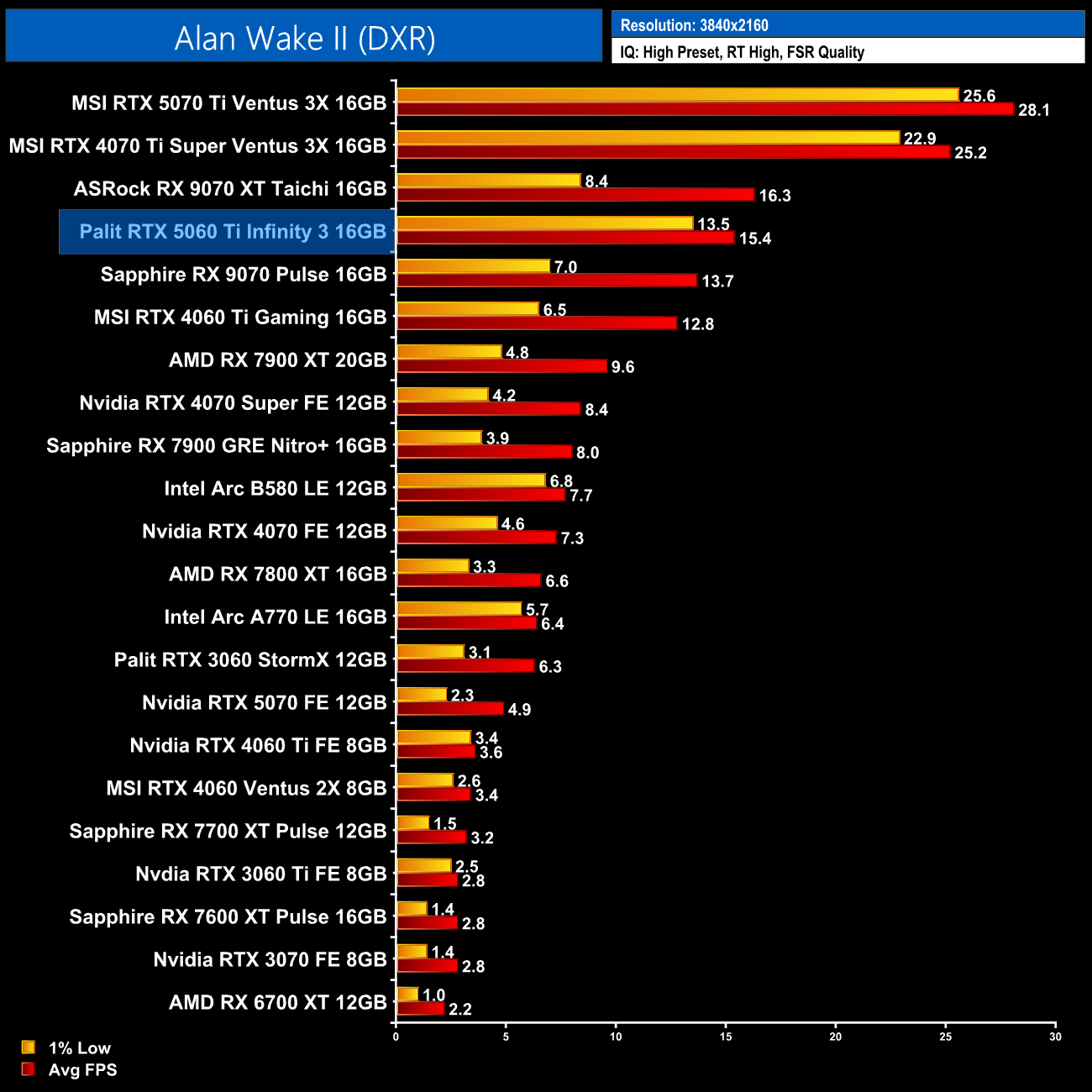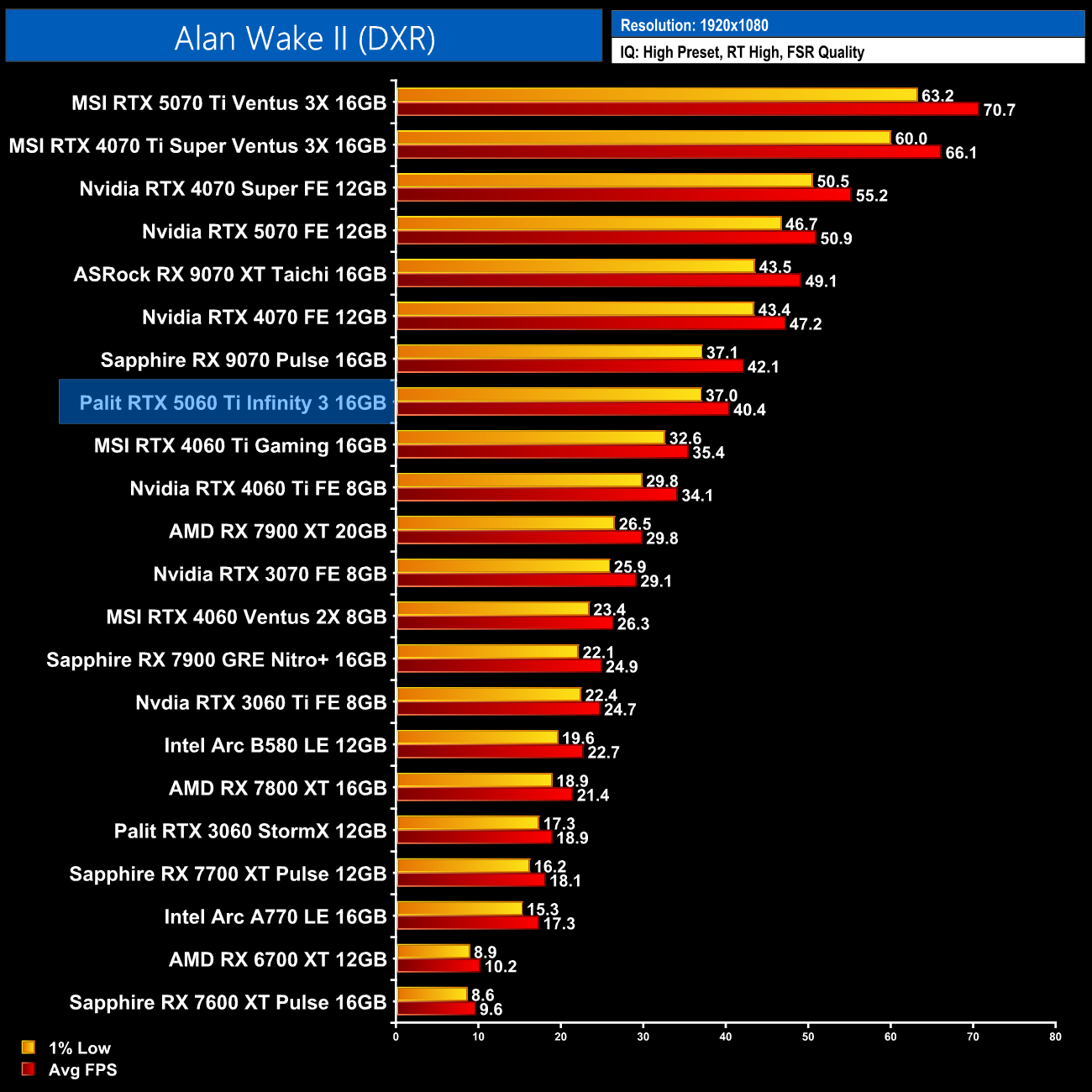 Moving onto ray tracing performance, we're focusing on 1080p here, and even with Quality upscaling, the path traced lighting in Alan Wake 2 reduces frame rates to just 40fps for the 5060 Ti 16GB. It is still miles ahead of the competition though, about on par with the RX 9070, despite that GPU costing significantly more.