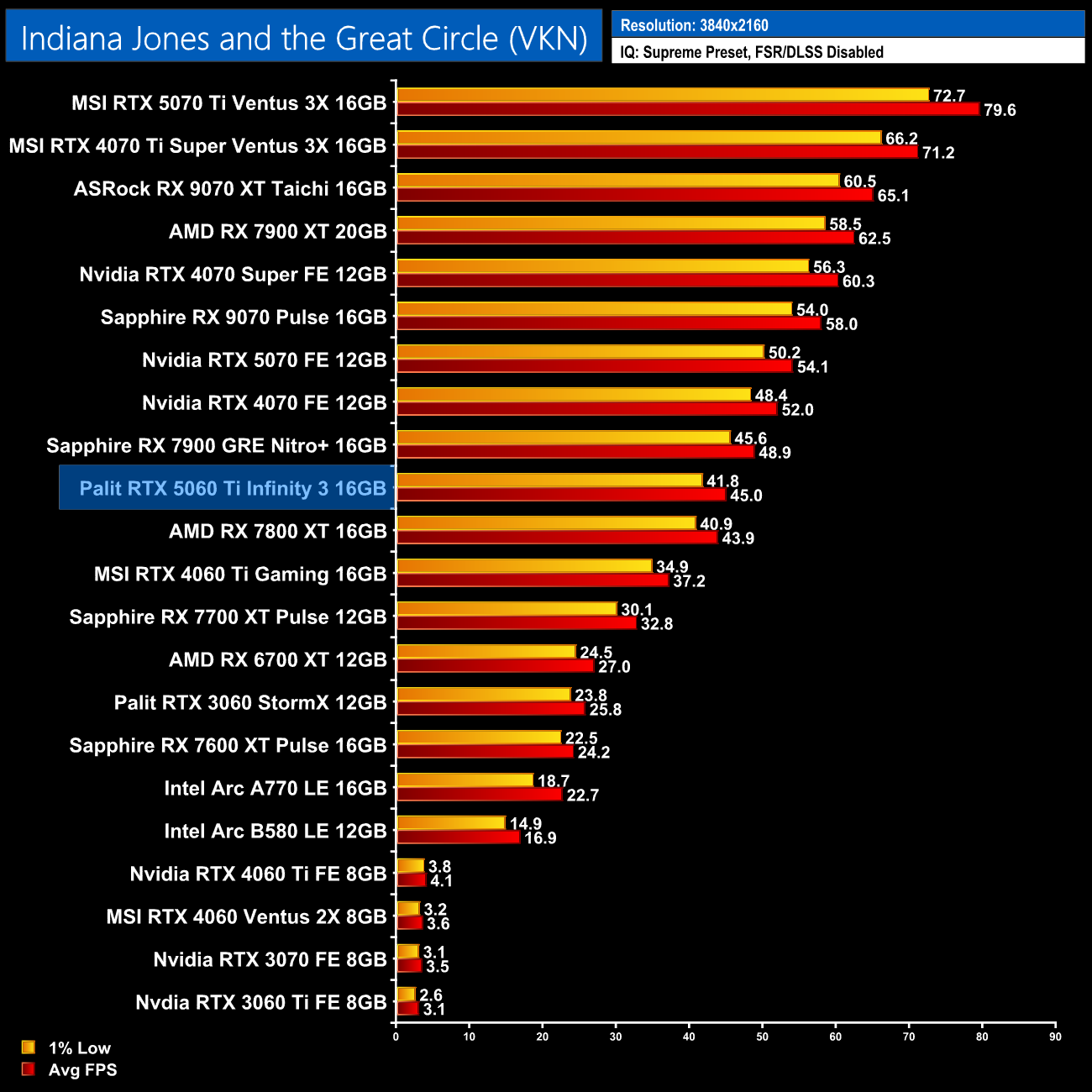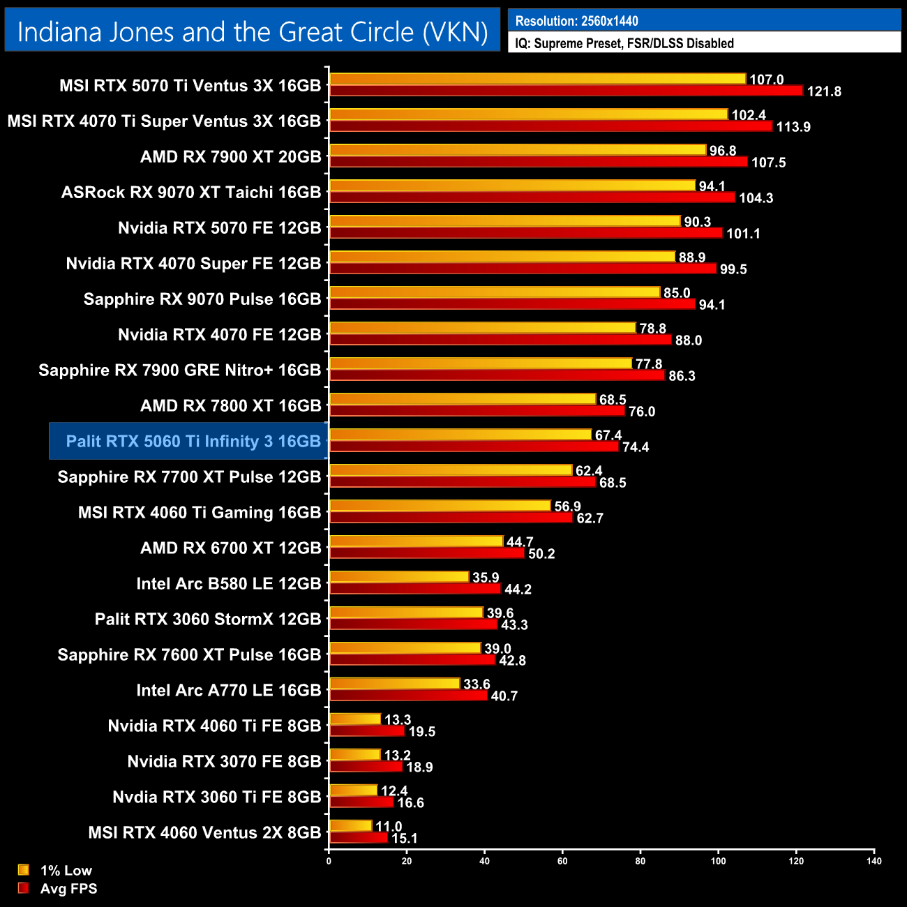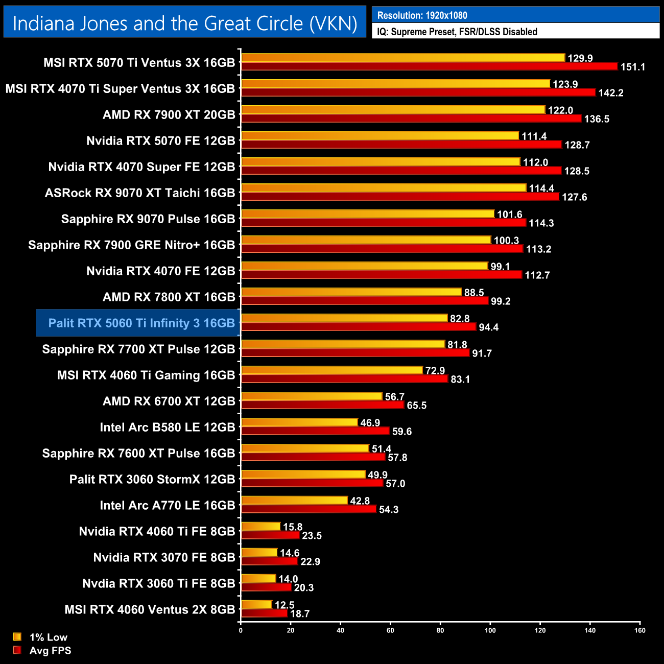 Indiana Jones is the last of the new additions to our test suite, and two trends are noticeable. The first is that anything with just 8GB VRAM absolutely crumbles. And the second is that, despite having ray tracing as a foundational part of the game's engine, AMD still scales very well here, with the 5060 Ti 16GB coming in 5% behind the 7800 XT. Either way, 94fps is a great result.