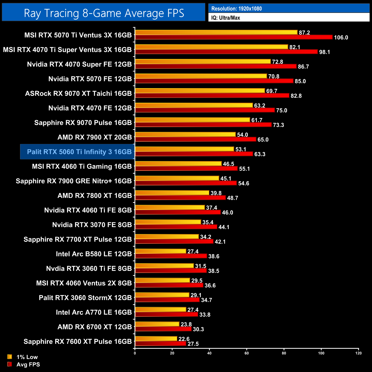 All-in-all, the RTX 5060 Ti 16GB is a decent GPU for ray tracing – at least at 1080p, when using demanding settings. Its overall performance is similar to AMD's RX 7900 XT, a GPU that was selling for £700+ over its lifetime, while it's 15% ahead of the 4060 Ti 16GB. Gains over the 3060 Ti are even bigger than we saw for rasterisation, this time hitting 64% – and a lot of that is down to the memory capacity.