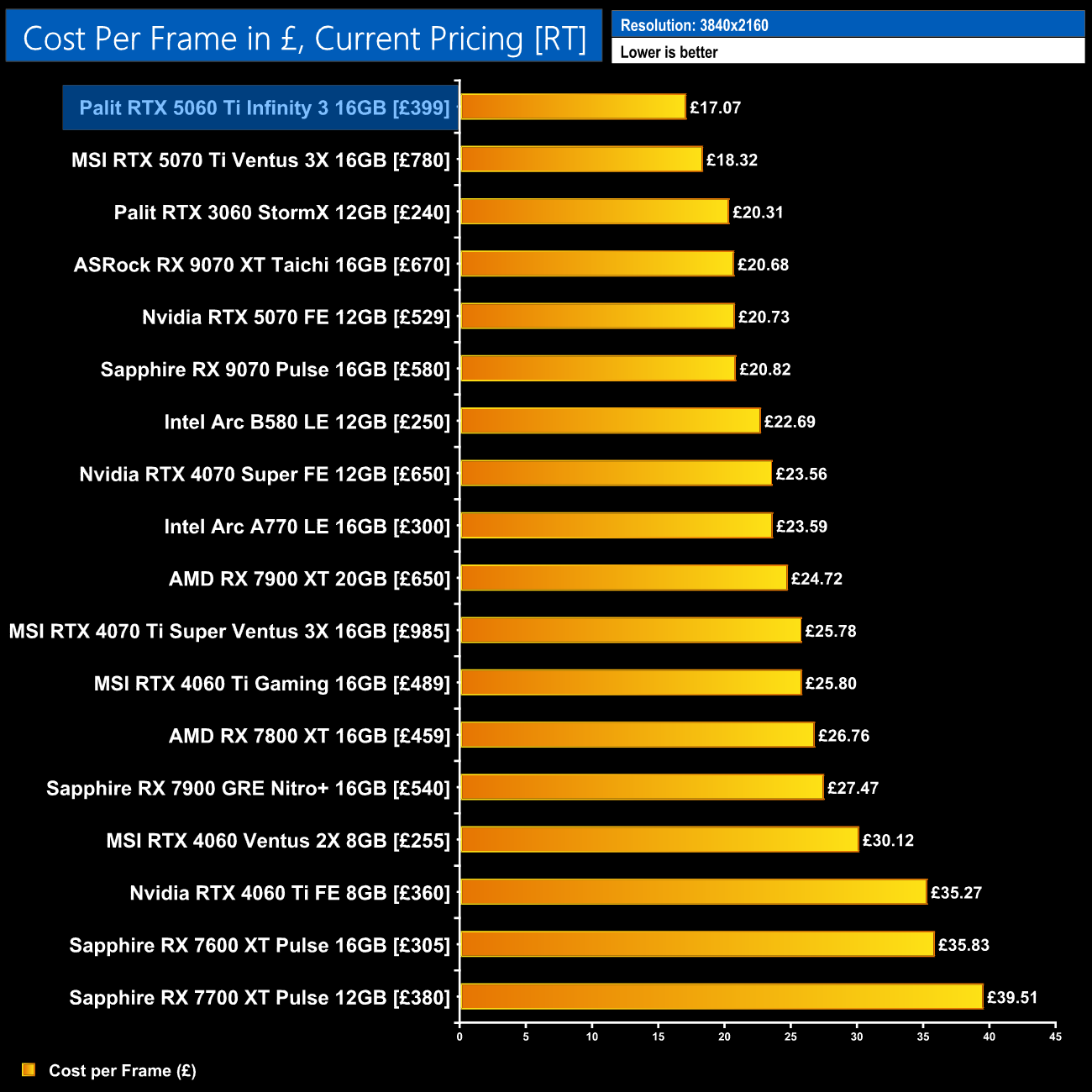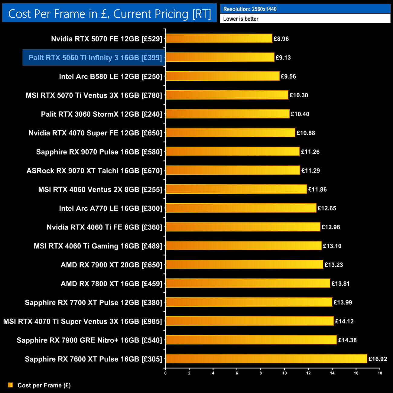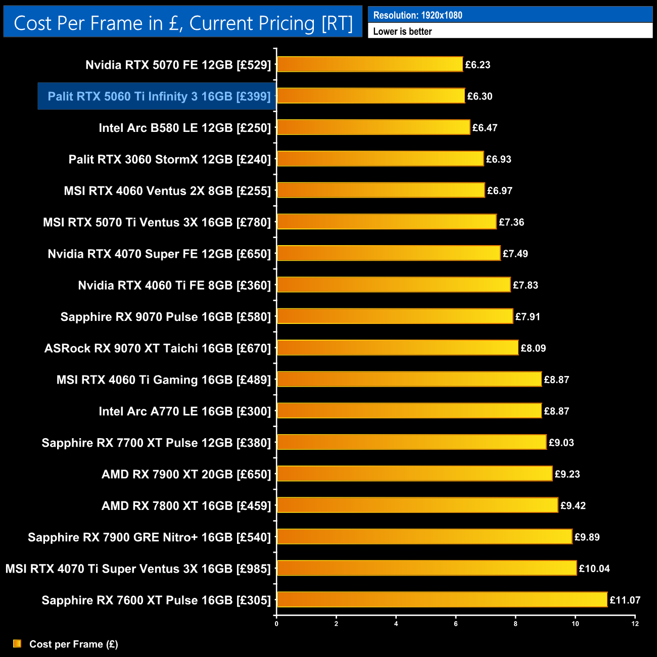 The same goes for data based on current pricing – the B580 is more competitive here, but the 5060 Ti 16GB and 5070 occupy the top two positions.