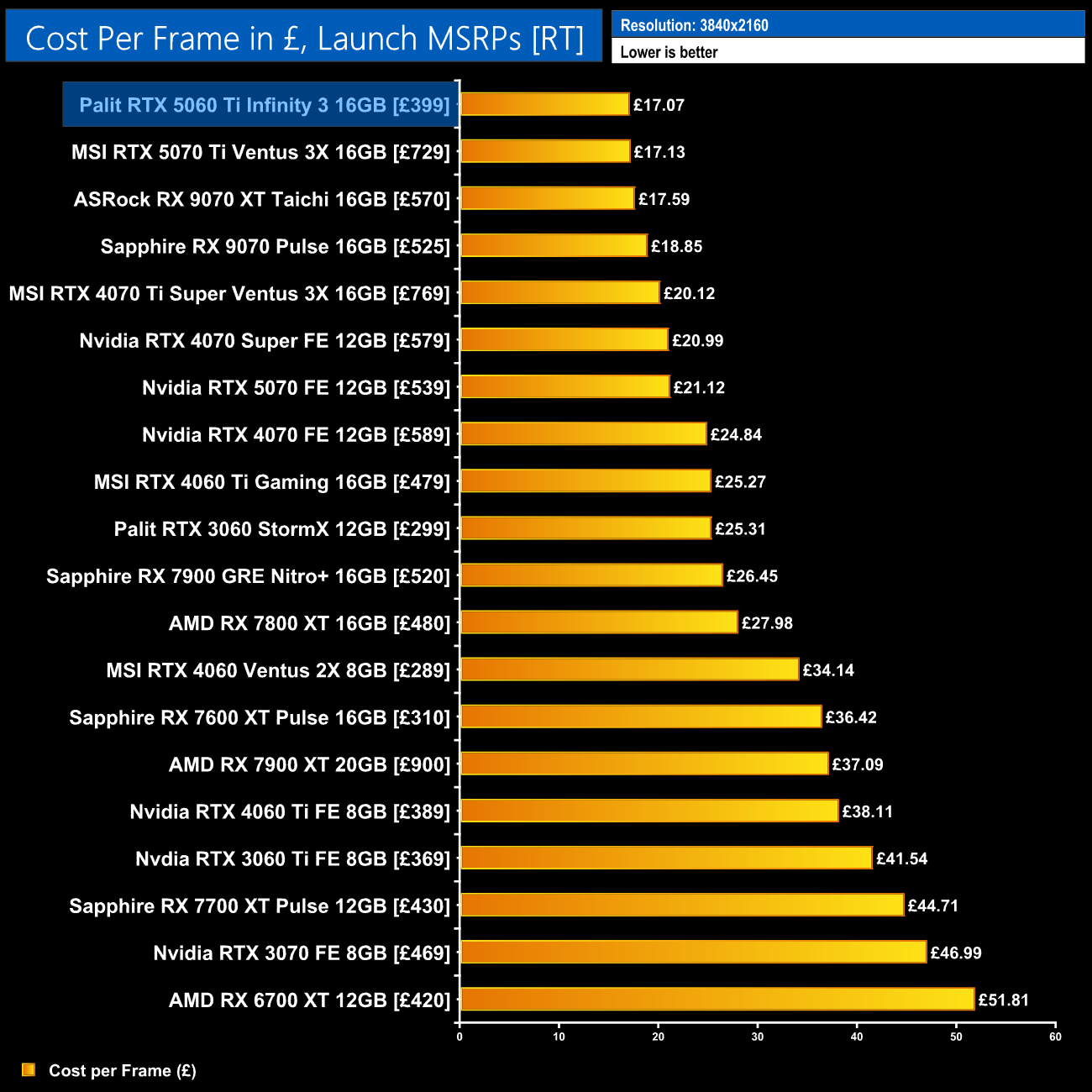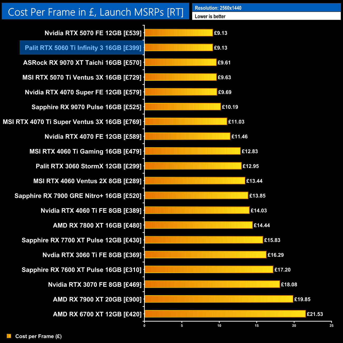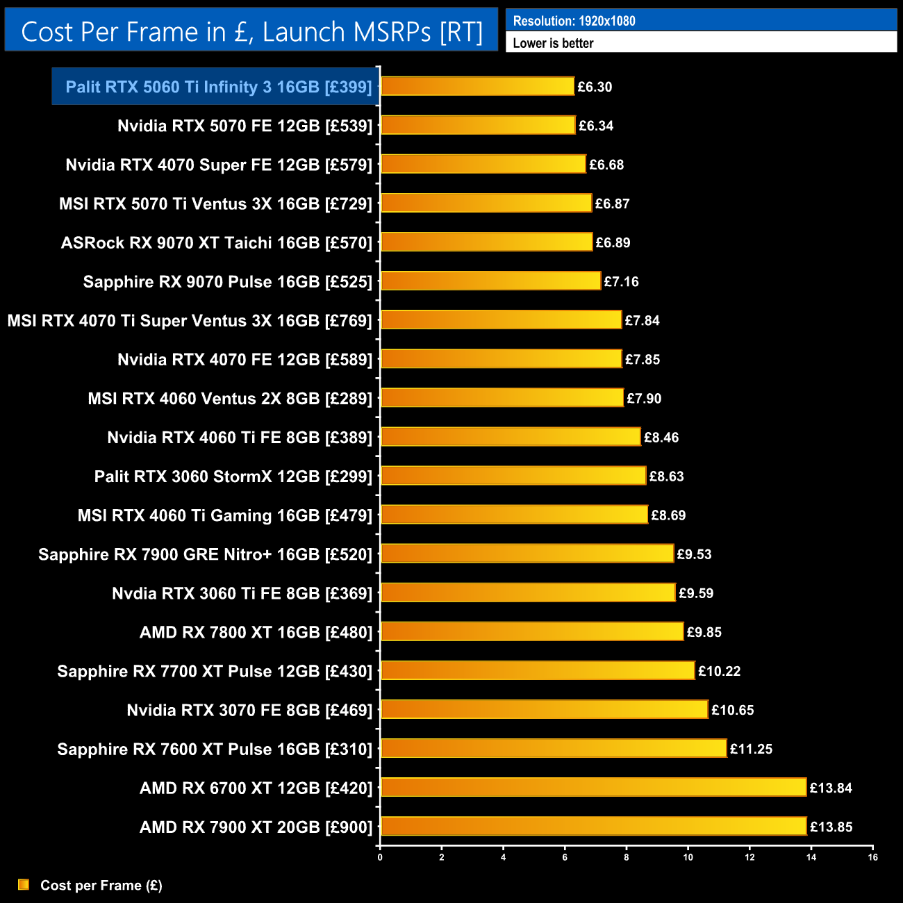 The same goes for data based on current pricing – the B580 is more competitive here, but the 5060 Ti 16GB and 5070 occupy the top two positions.