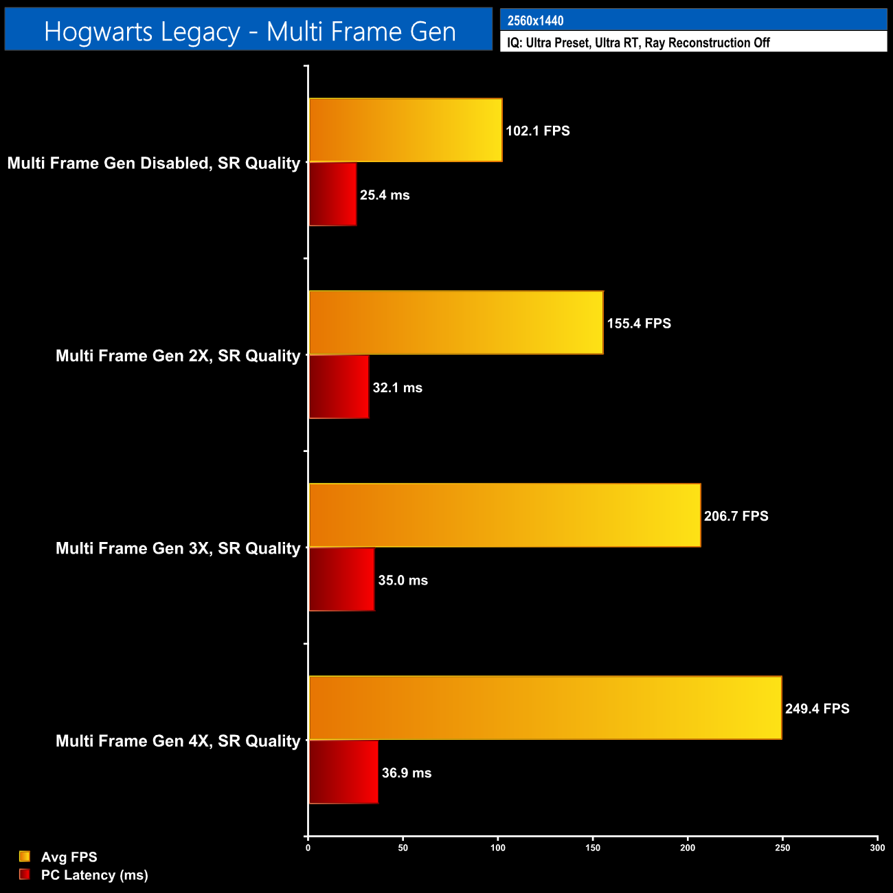 However, the numbers taken in isolation really lack context, and I do not think playing path traced games at 1440p with MFG 4X is a good idea on this GPU. For one, latency is silly high given the starting base frame rate is so low – given we averaged 102fps using MFG 4X, simple maths tells us only 26 of those frames were traditionally rendered, so that is a very low frame rate to start from.
