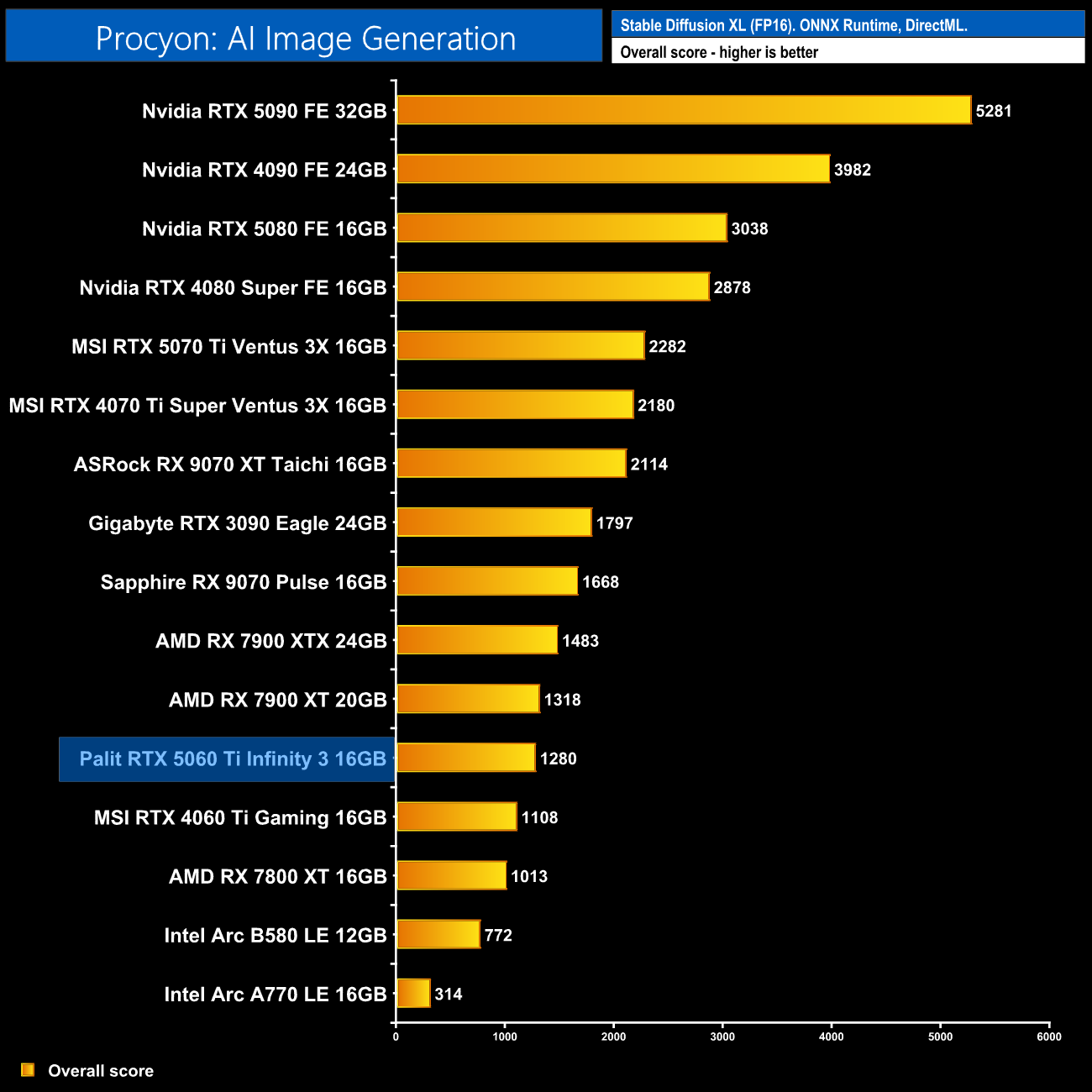 Starting with our Stable Diffusion XL FP16 image generation test, here the RTX 5060 Ti 16GB delivers a 16% gain over the RTX 4060 Ti 16GB. It's also worth pointing out that the RTX 5070 can't even run this test due to its lesser 12GB framebuffer, so it's an ironic victory for the smaller sibling.