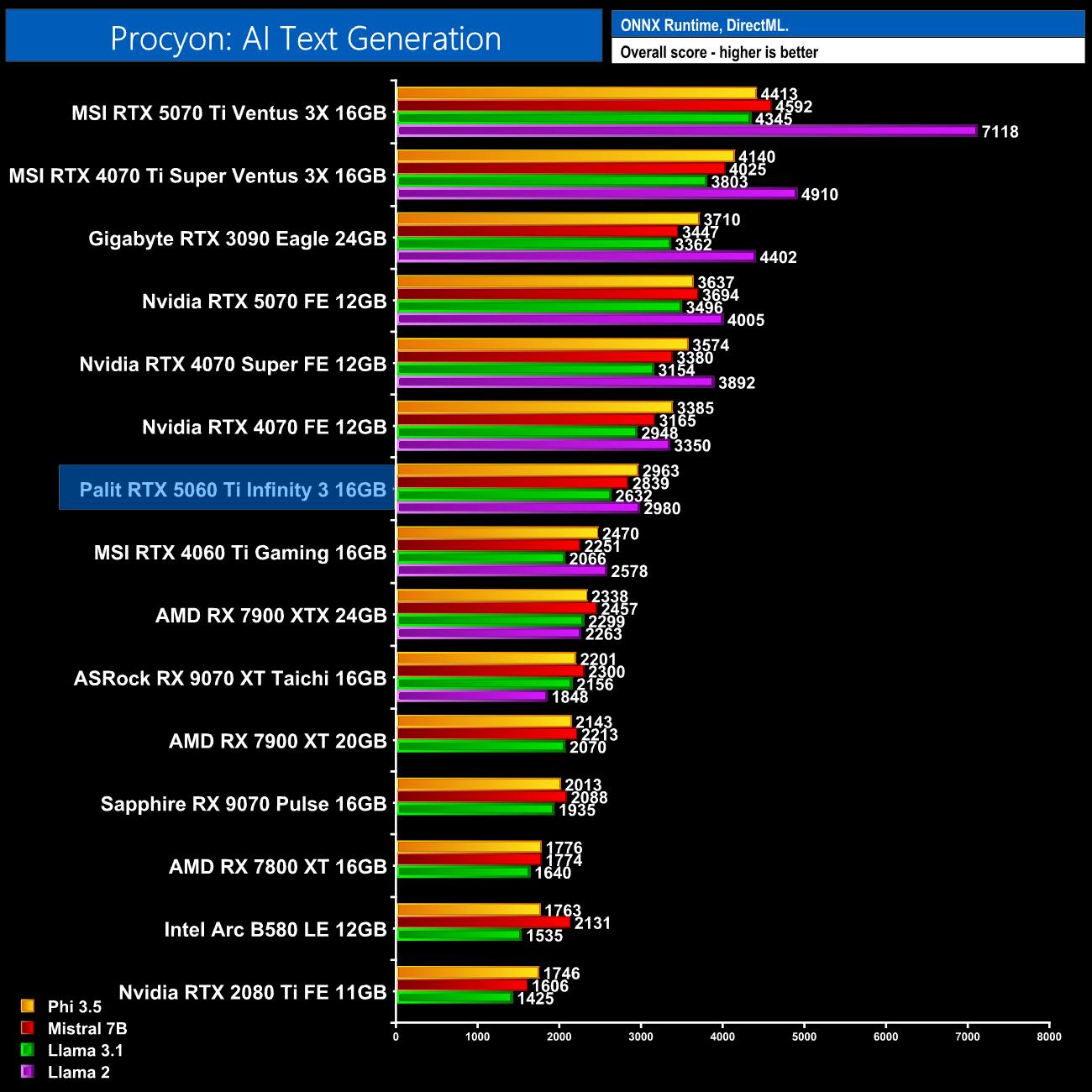 Gains do vary when looking at text generation depending on the model used, but using Llama 3.1 results in an impressive 27% uplift over the 4060 Ti 16GB.