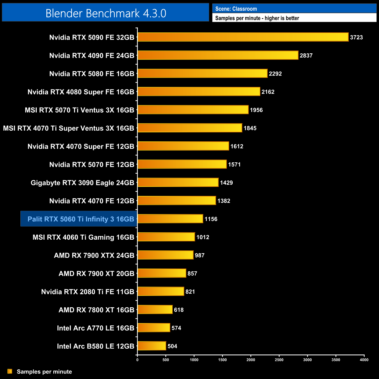 It's a similar uplift when looking at Blender Benchmark, though the 5060 Ti 16GB is faster than even the 7900 XTX here.