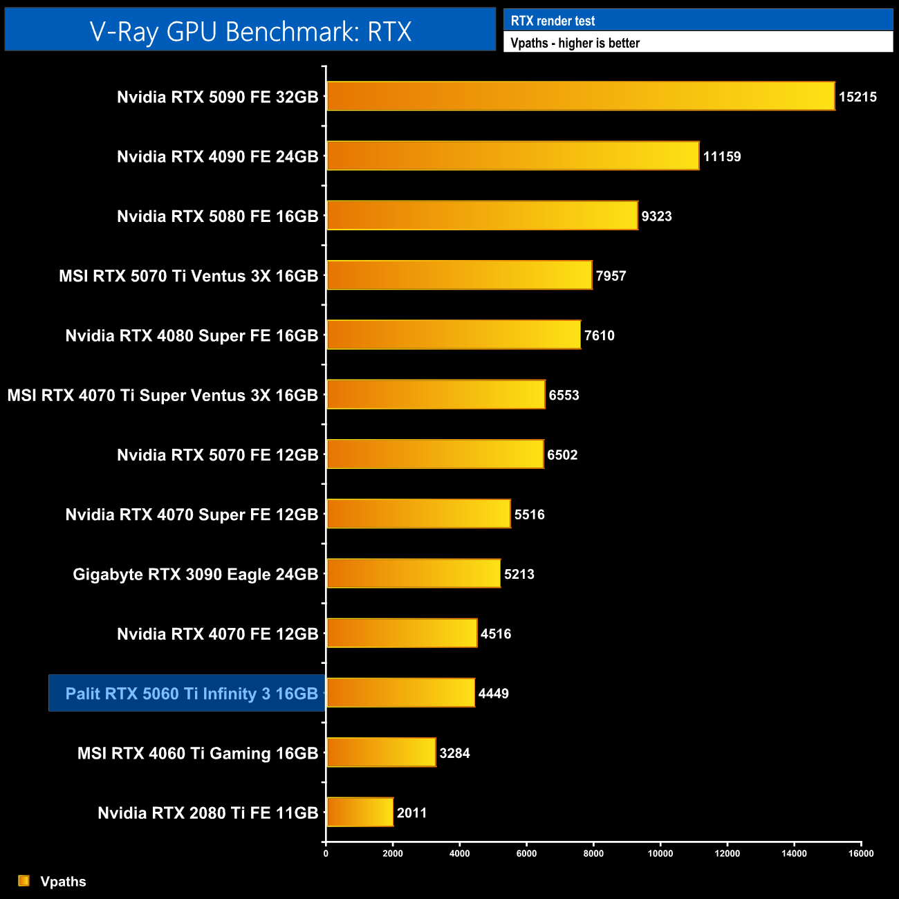 Lastly, V-Ray's GPU benchmark shows another impressive gain for the 5060 Ti 16GB, putting it on par with the RTX 4070 and 35% ahead of its predecessor.