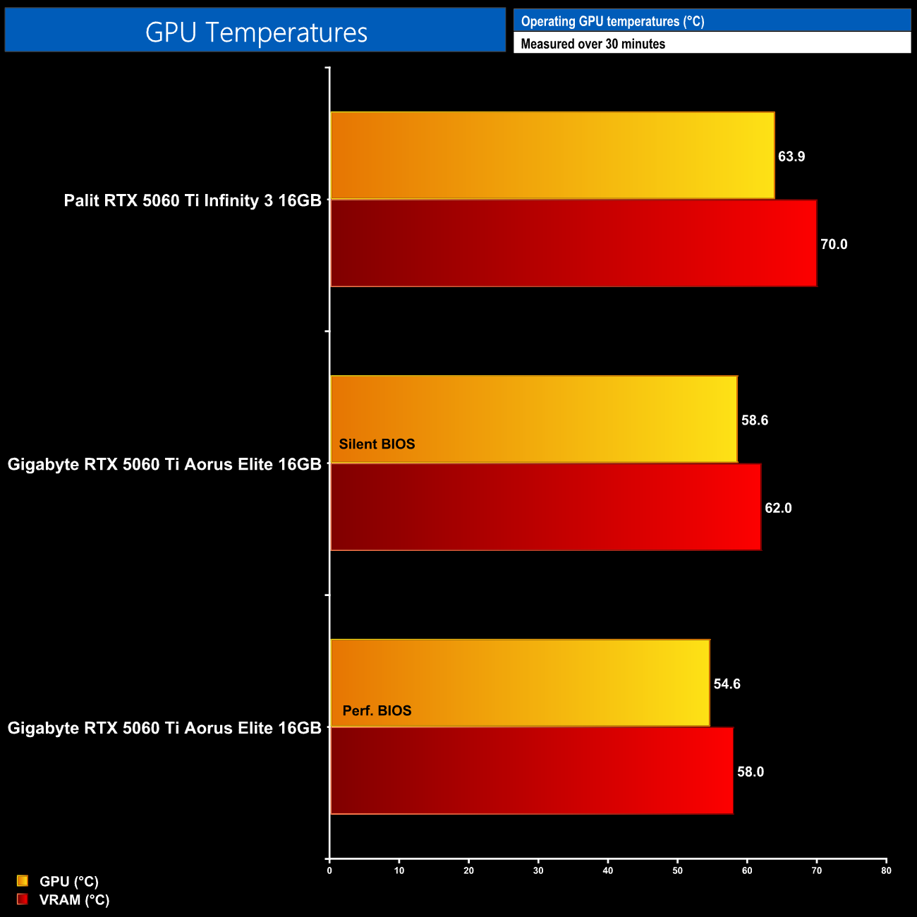 As for temperatures, both cards did well here, though the Aorus Elite ran the coolest, hitting 54.6C and 58C on the GPU and VRAM, respectively, when using the Performance BIOS. The Palit is still very good though, this time with VRAM topping out at 70C, and the GPU staying below 65C at all times.