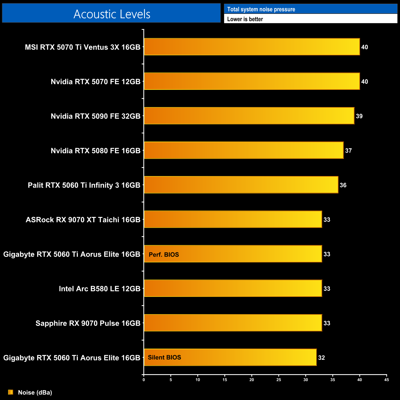 For noise levels, we've compared the two 5060 Ti 16GB cards against other 50 series models we have tested, and they do well. The Aorus Elite was dead quiet, dropping fan speed to just 1000rpm in its Silent mode, and even the Performance mode hit just 1220rpm, making it effectively inaudible. The Infinity 3 was a bit louder at 36dBa, given the fans spun up to 1540rpm, but it's still easy on the ears and much quieter than a 5070 FE.