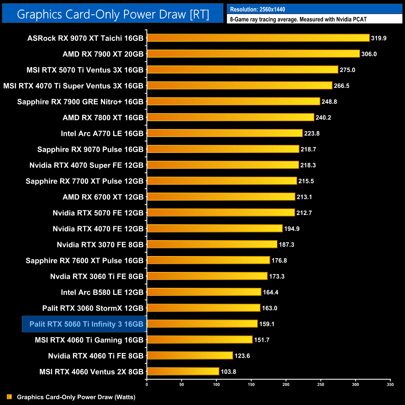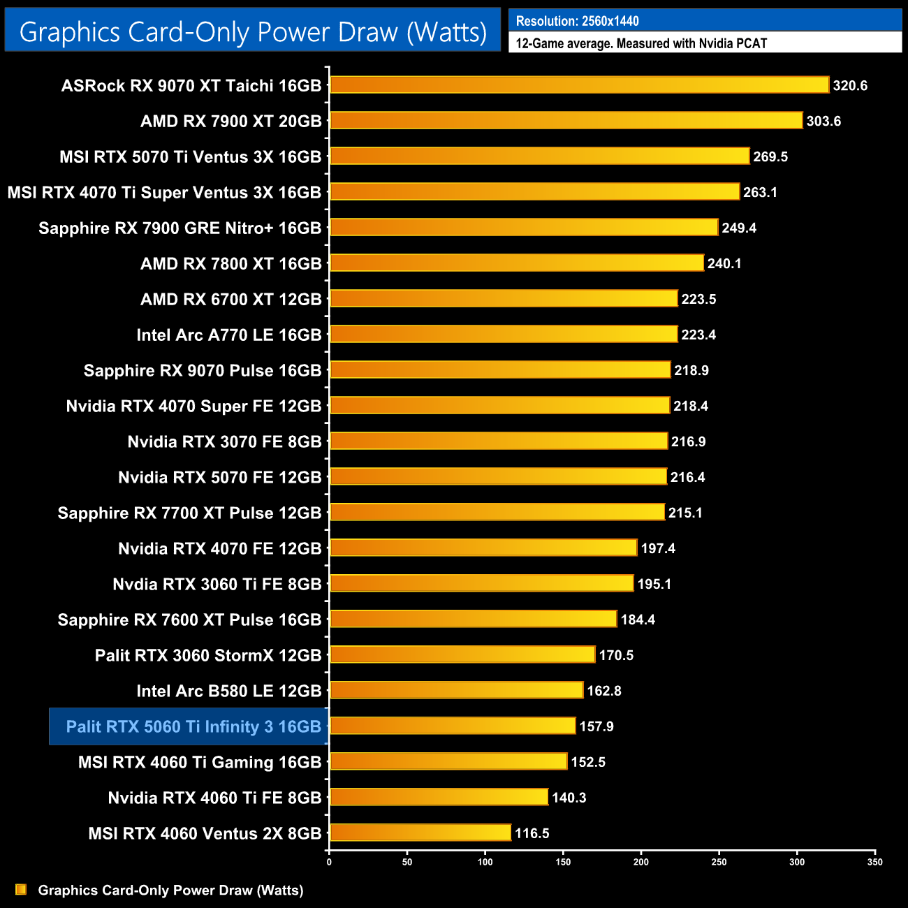 Up at 1440p, power does increase, now averaging 158W, and that's just a 5W increase over the 4060 Ti 16GB, indicating a clear efficiency gain.