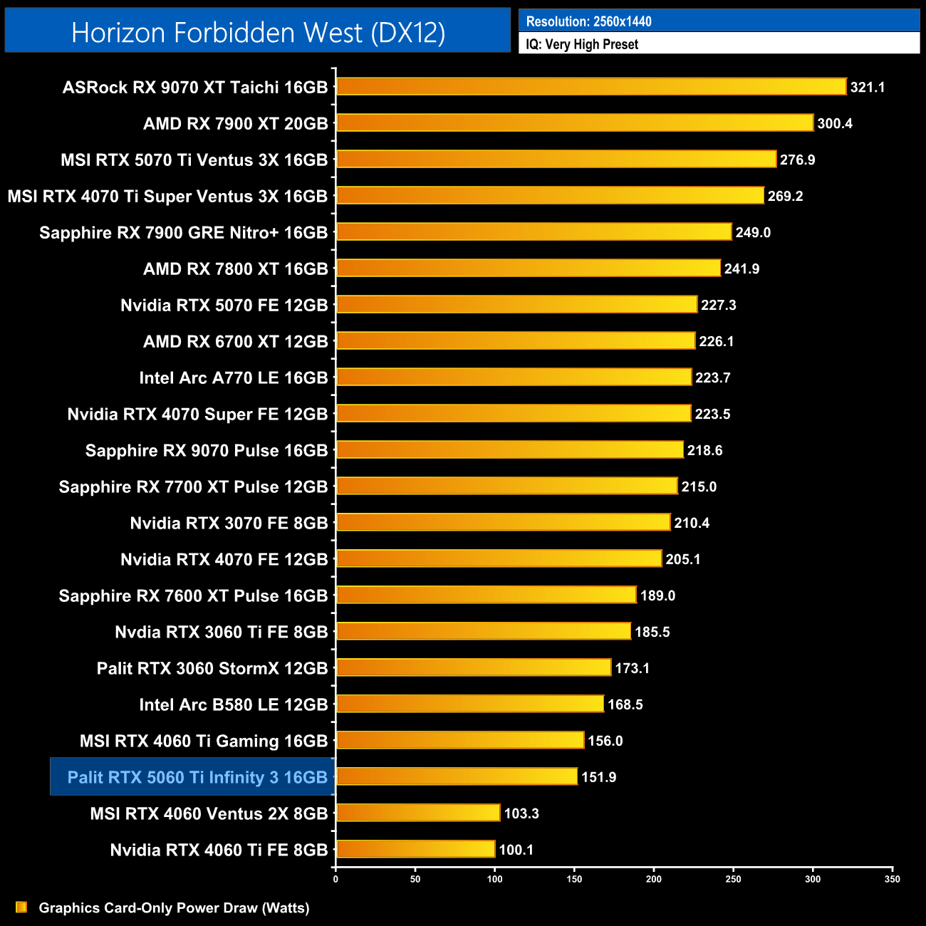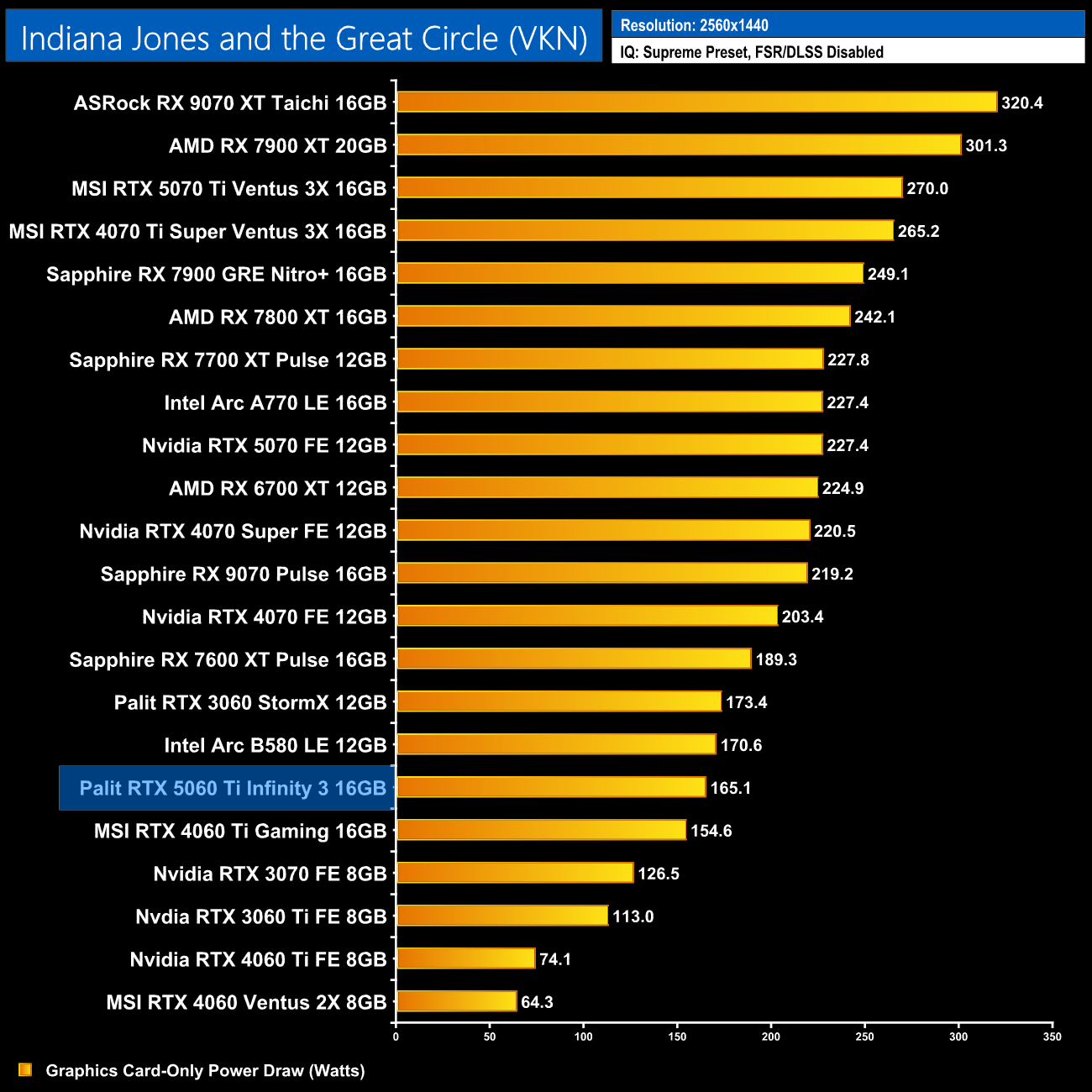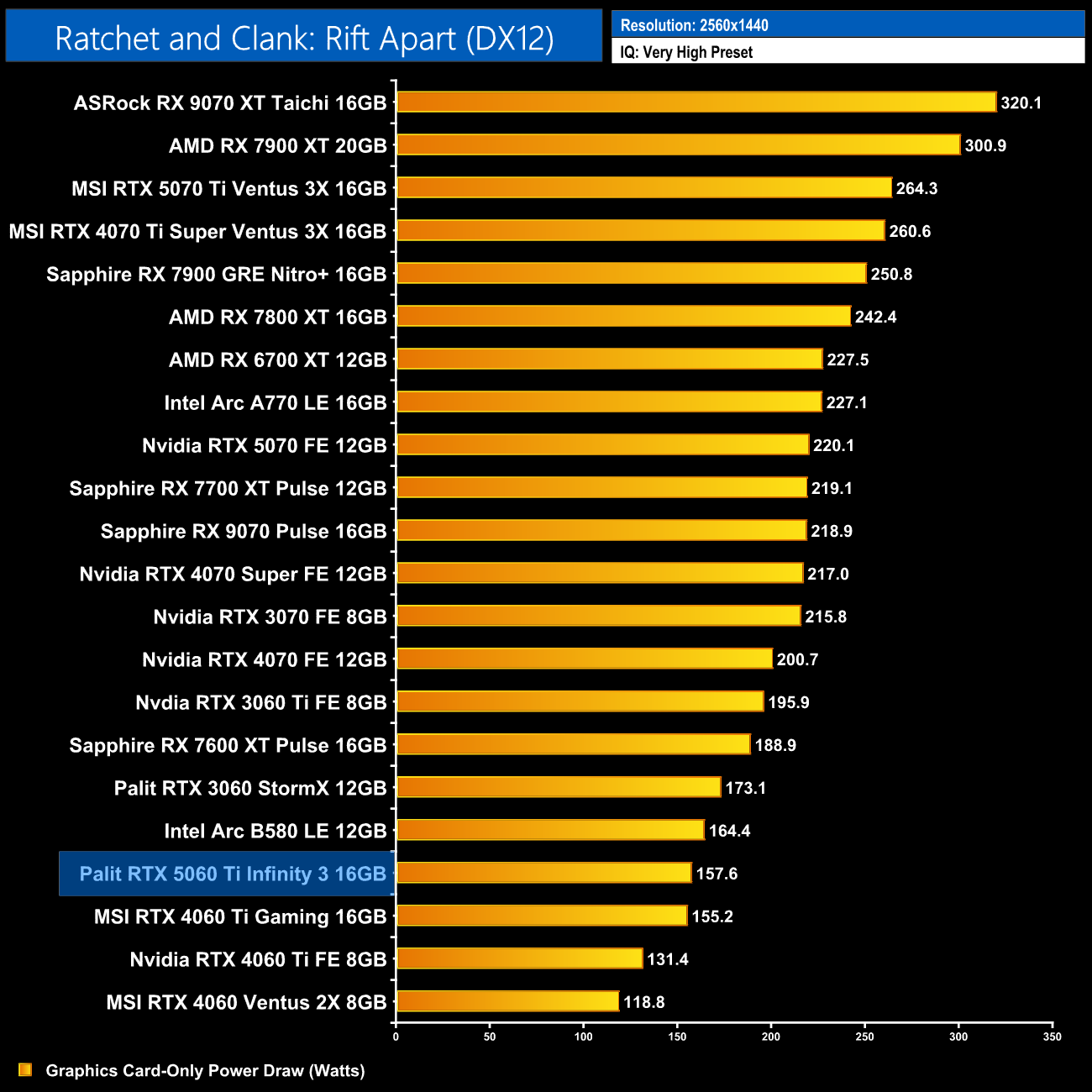 Up at 1440p, power does increase, now averaging 158W, and that's just a 5W increase over the 4060 Ti 16GB, indicating a clear efficiency gain.