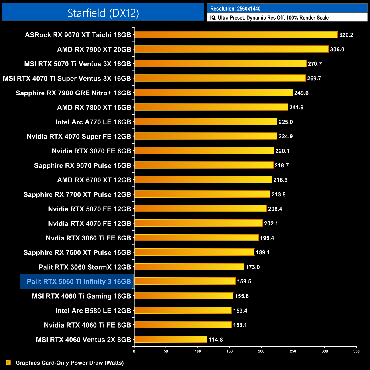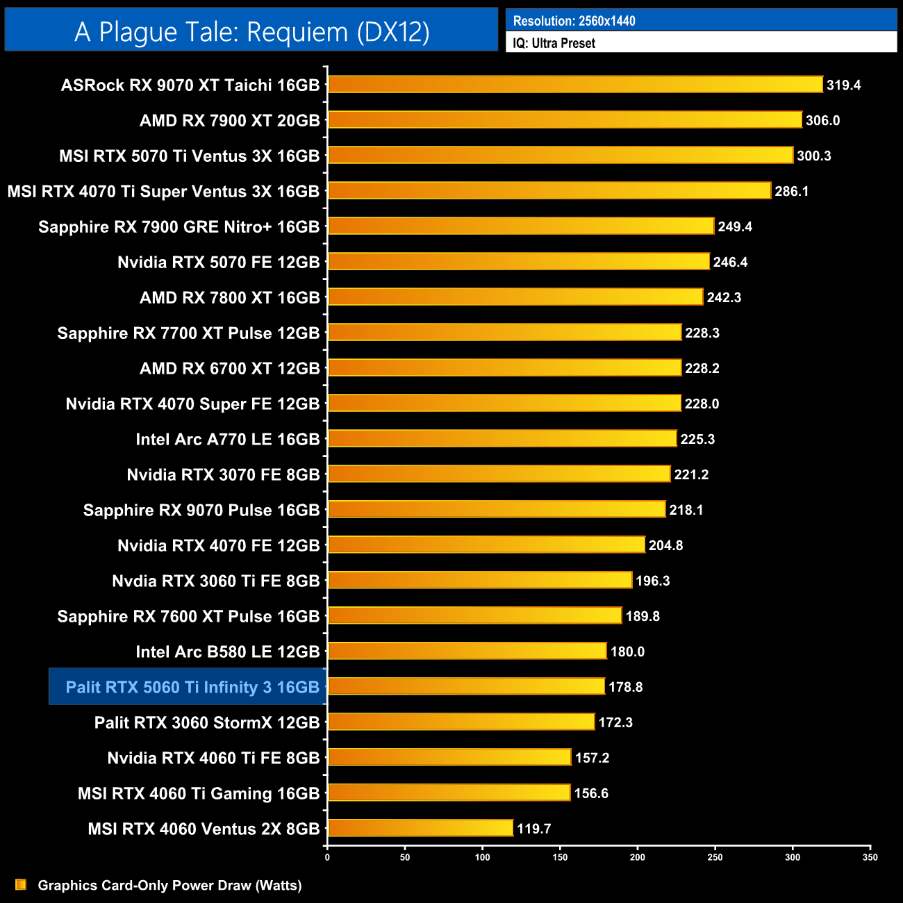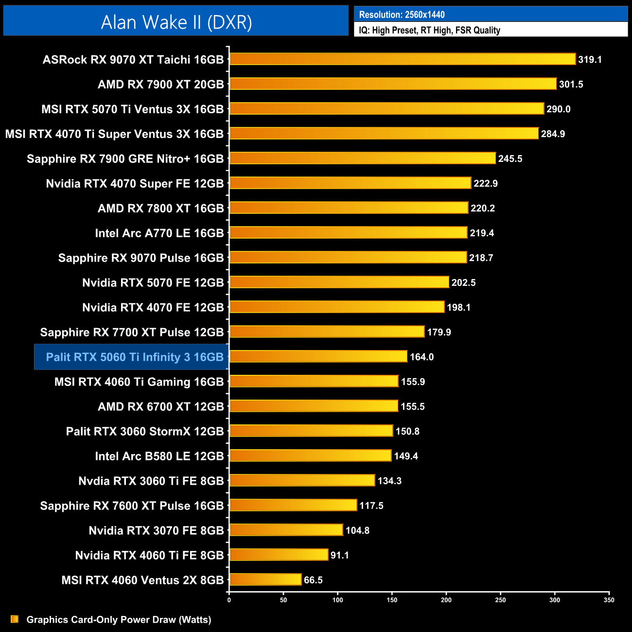Up at 1440p, power does increase, now averaging 158W, and that's just a 5W increase over the 4060 Ti 16GB, indicating a clear efficiency gain.